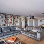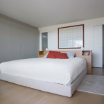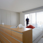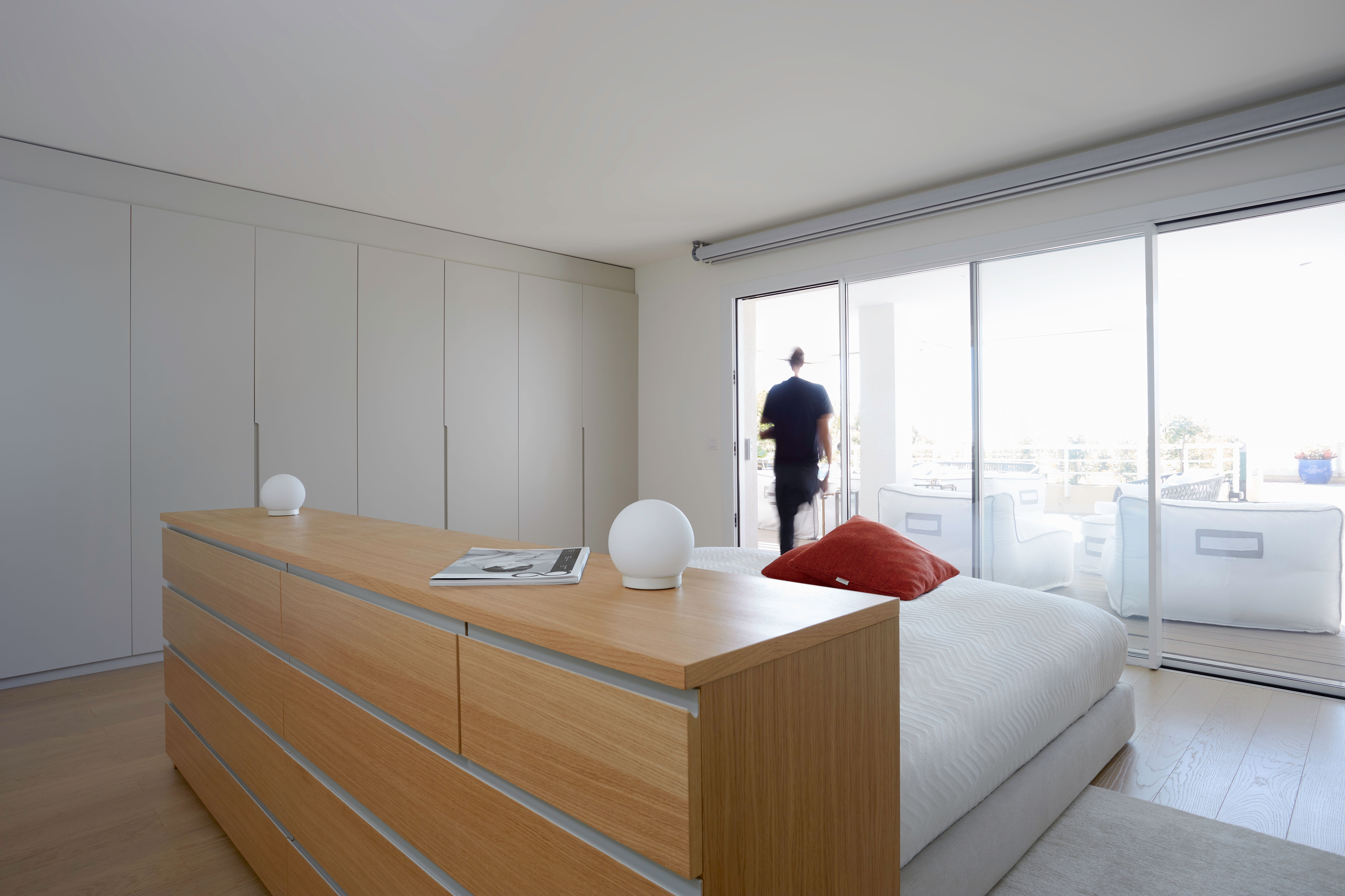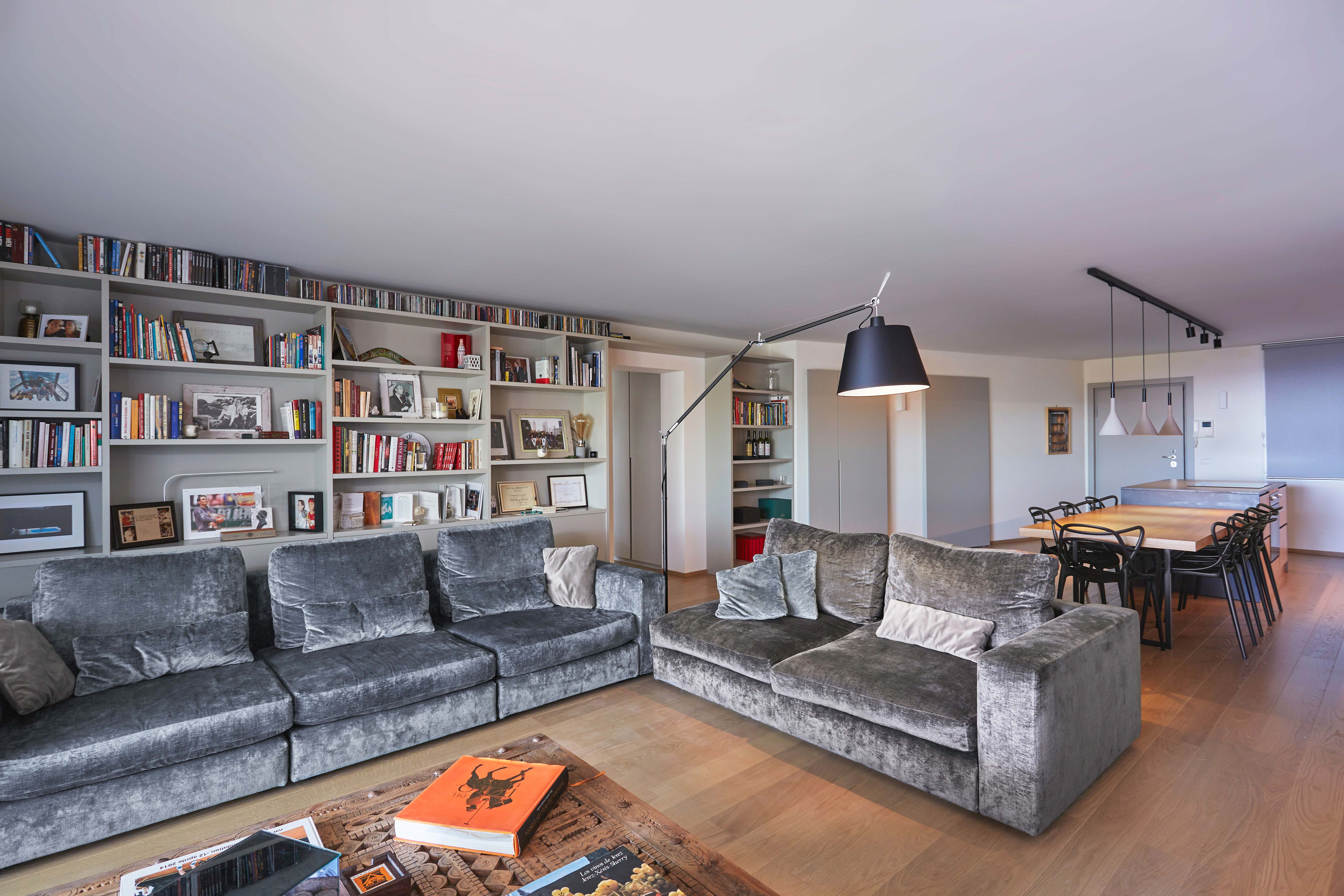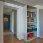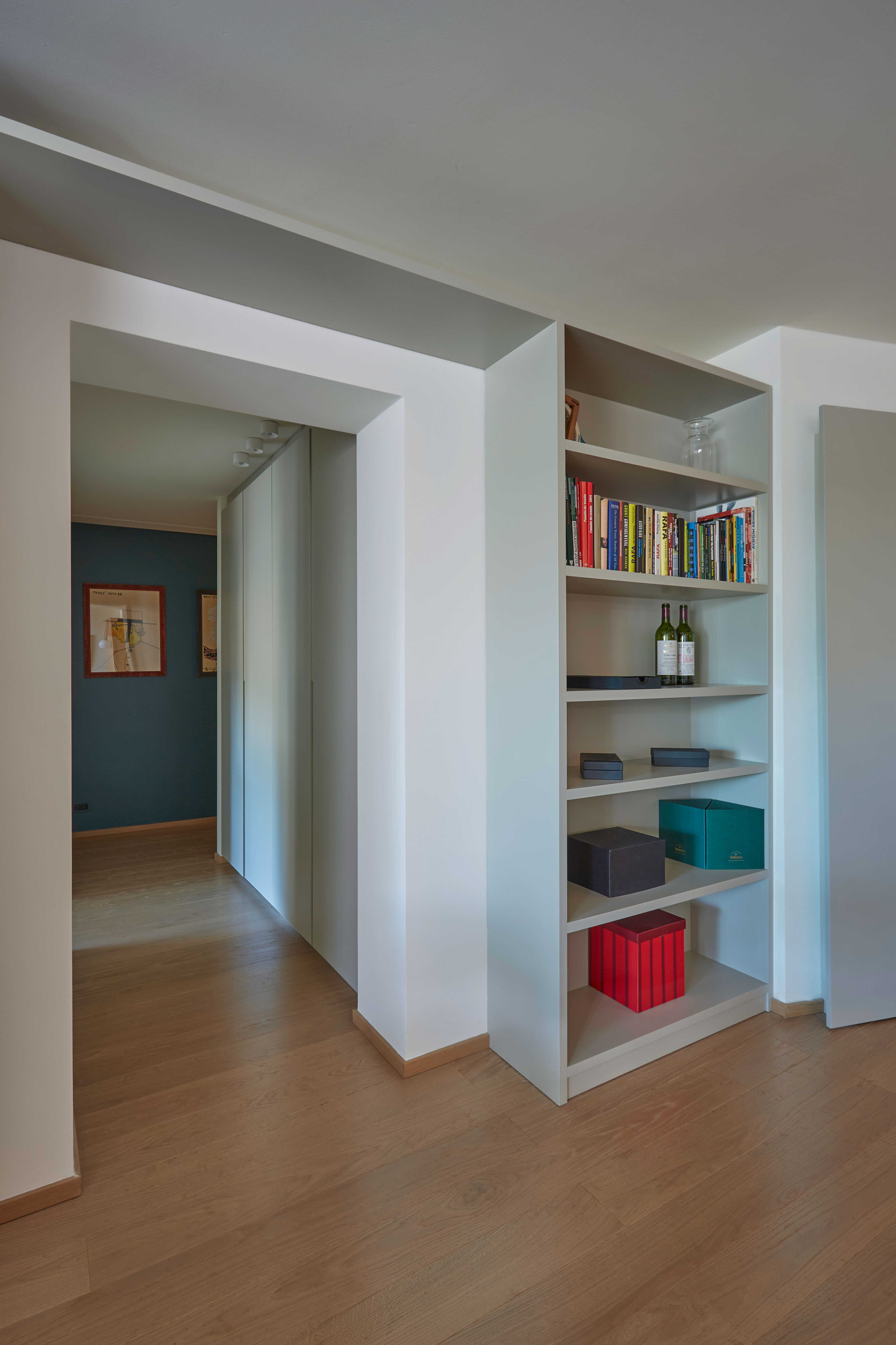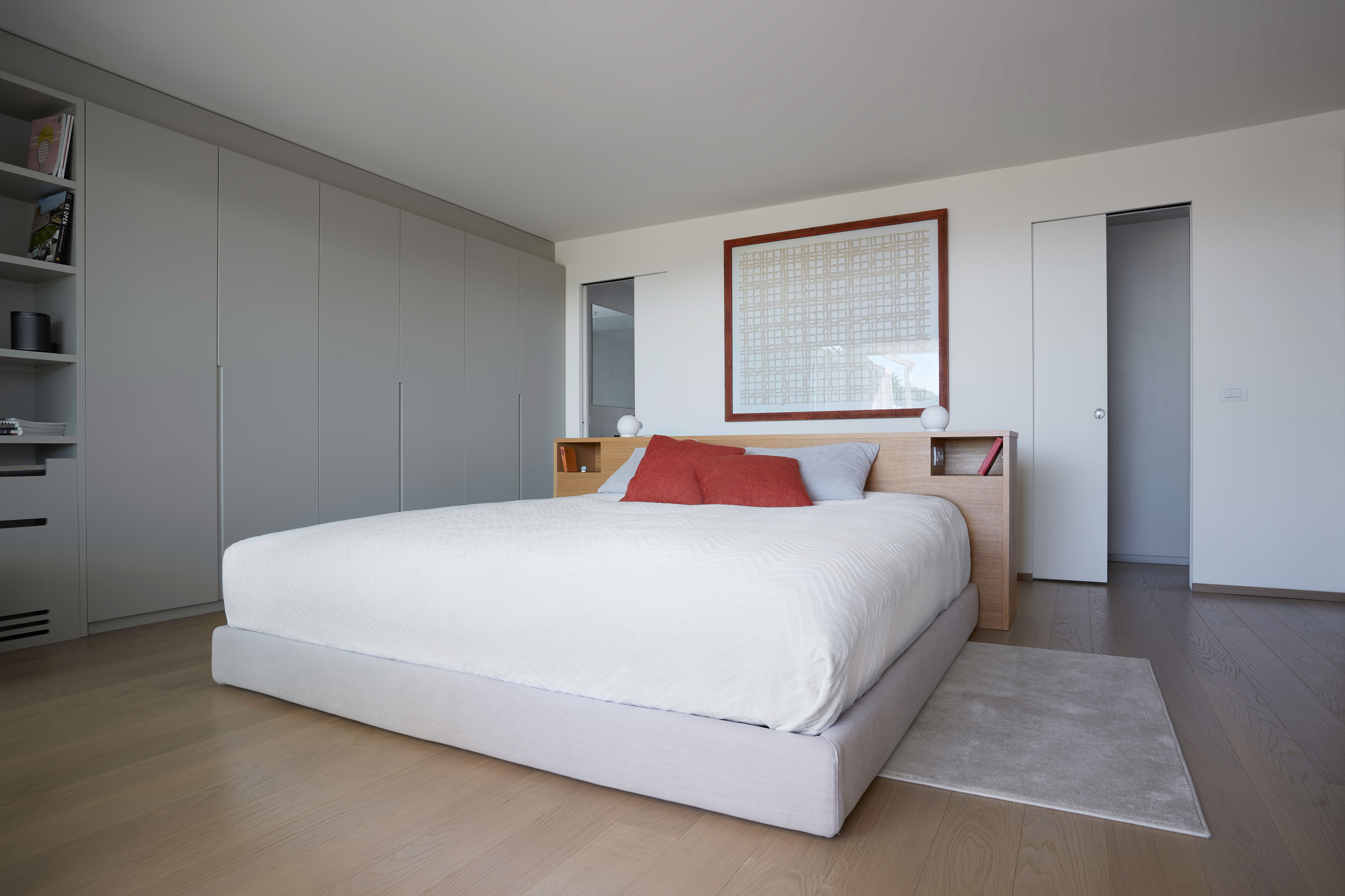 Stessa estetica lineare per la parete attrezzata che comprende libreria e pannelli scorrevoli, dietro cui, si nasconde la distribuzione delle camere della zona notte. Le armadiature e i mobili dei bagni e della camera padronale, compresa la struttura con i contenitori del letto, seguono lo stesso linguaggio formale e materico degli arredi della zona giorno. Anche i divani in velluto di seta, fortemente voluti dal proprietario, esigente uomo dai gusti raffinati, sono realizzati su disegno.
