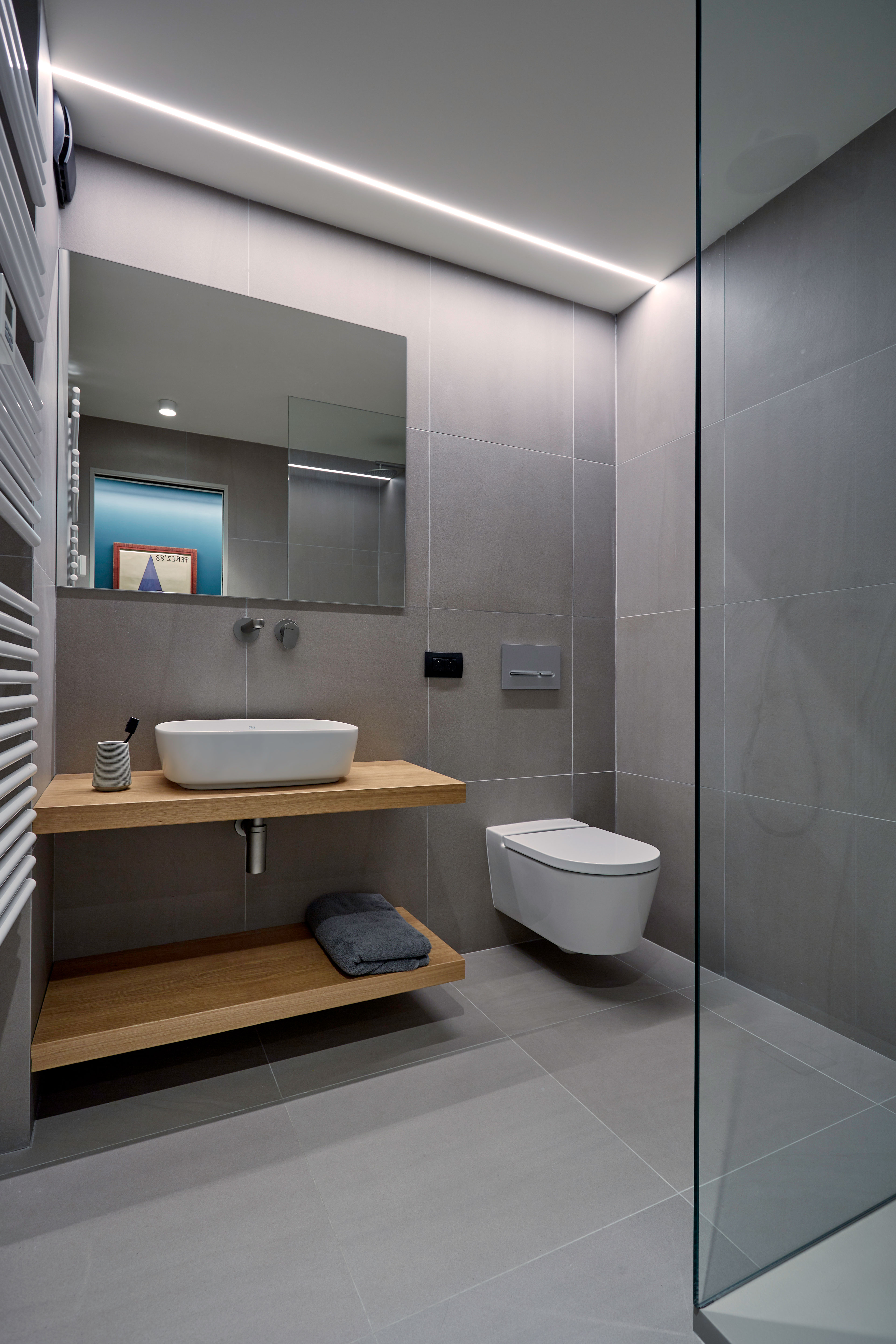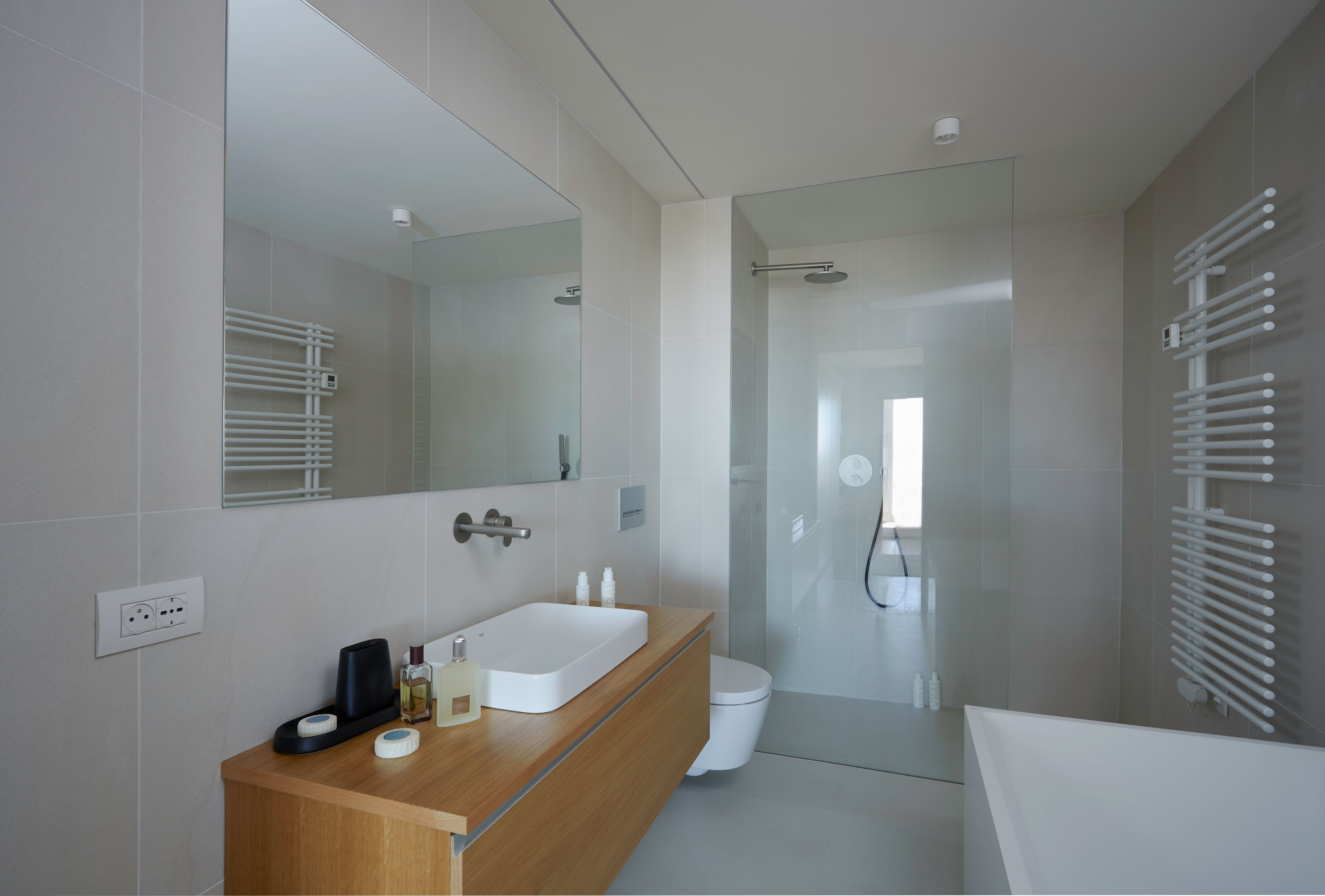 Gli ambienti bagno sono trattati con materiali in colore neutro che richiamano la pietra naturale, spaziose docce walk-in e vasca free standing attribuiscono un confort da spa a questi locali.
