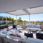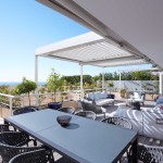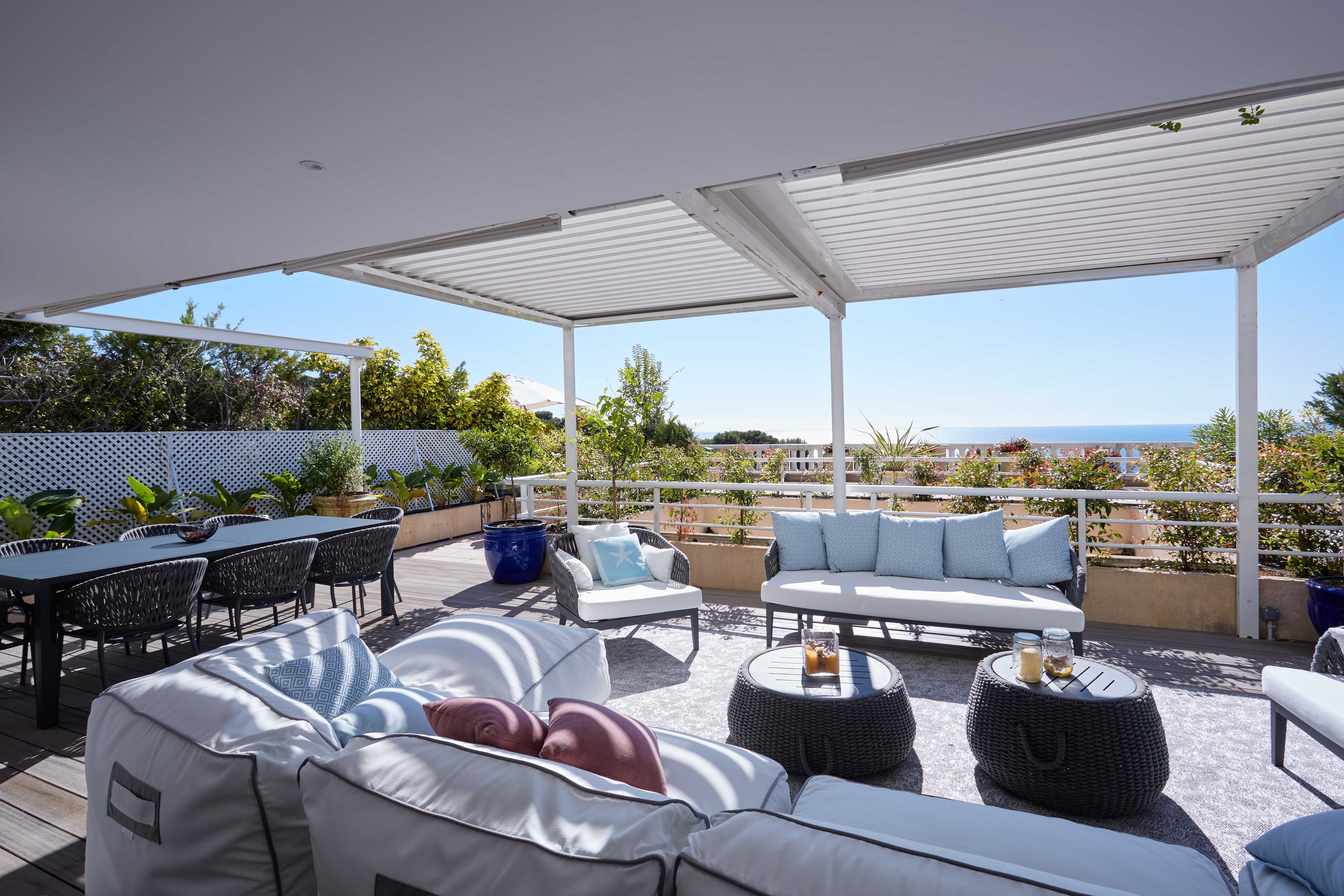 L’open living e la camera padronale, attraverso grandi vetrate dal profilo sottile, si aprono sulla terrazza panoramica che è allestita per ospitare una prima area sofà coperta, poi una zona pranzo outdoor in cui è stato inserito un angolo barbeque free standing e infine, un’area giardino molto estesa che gode della luce e dell’affaccio panoramico sulla baia.