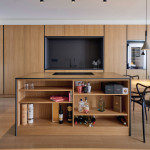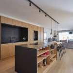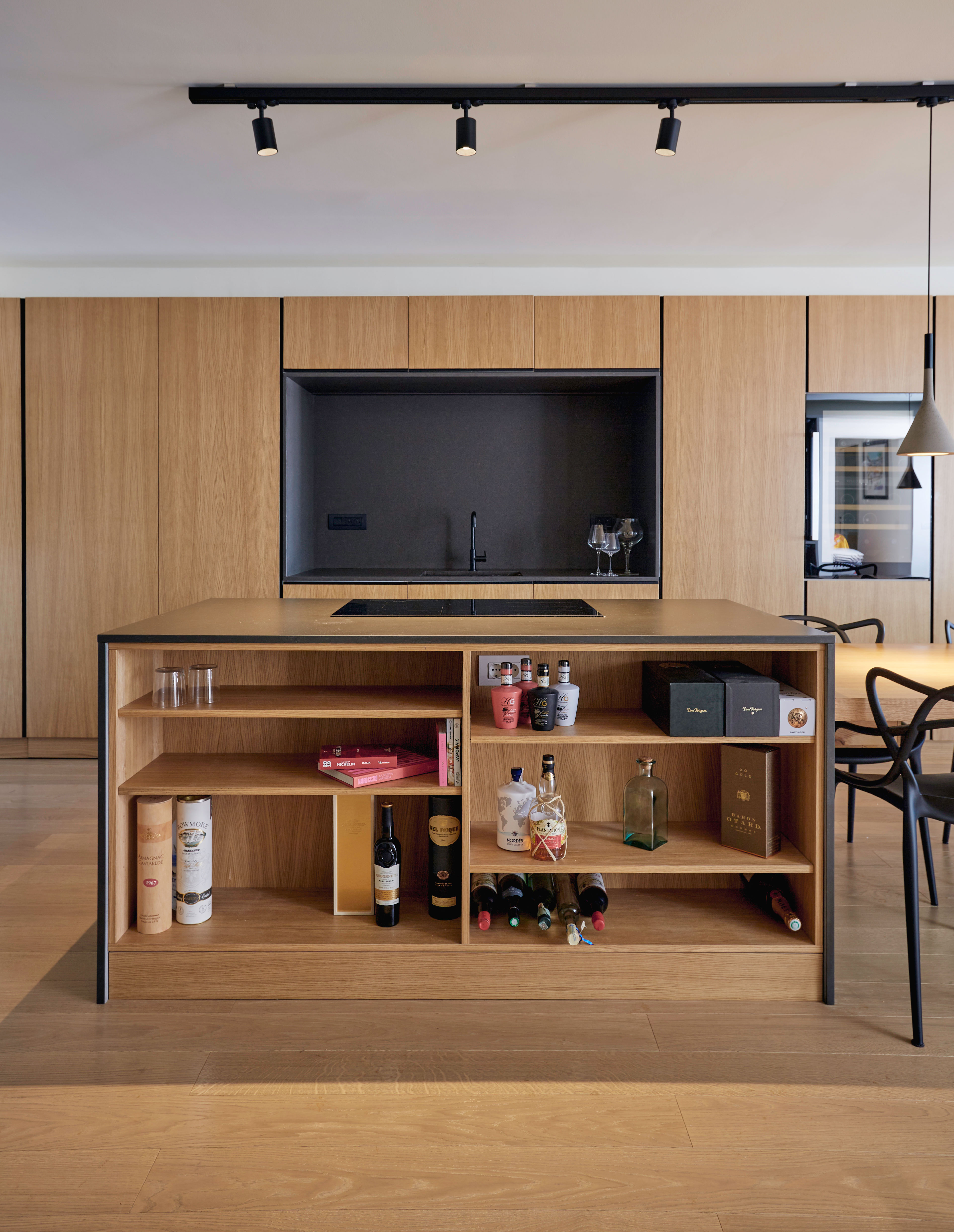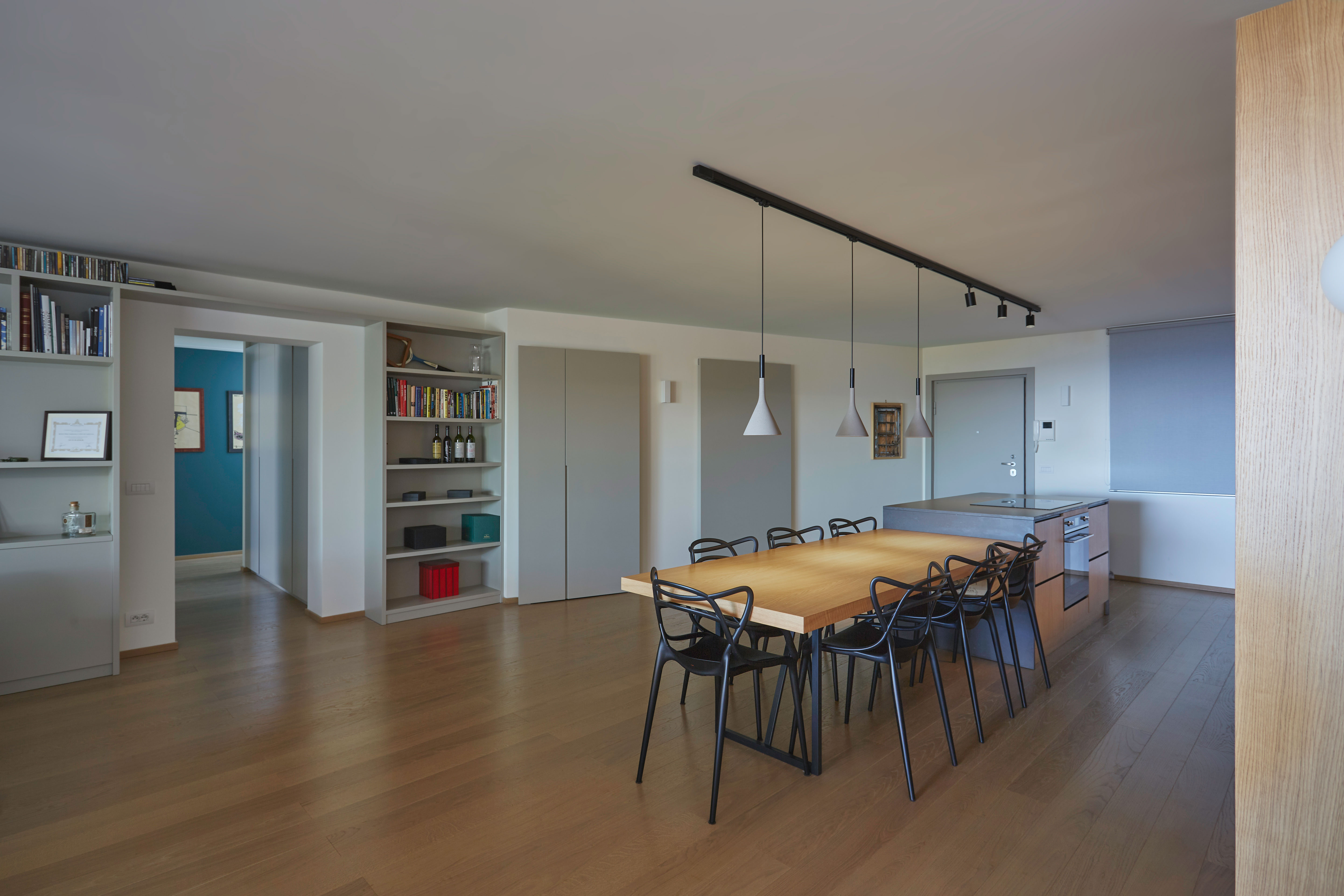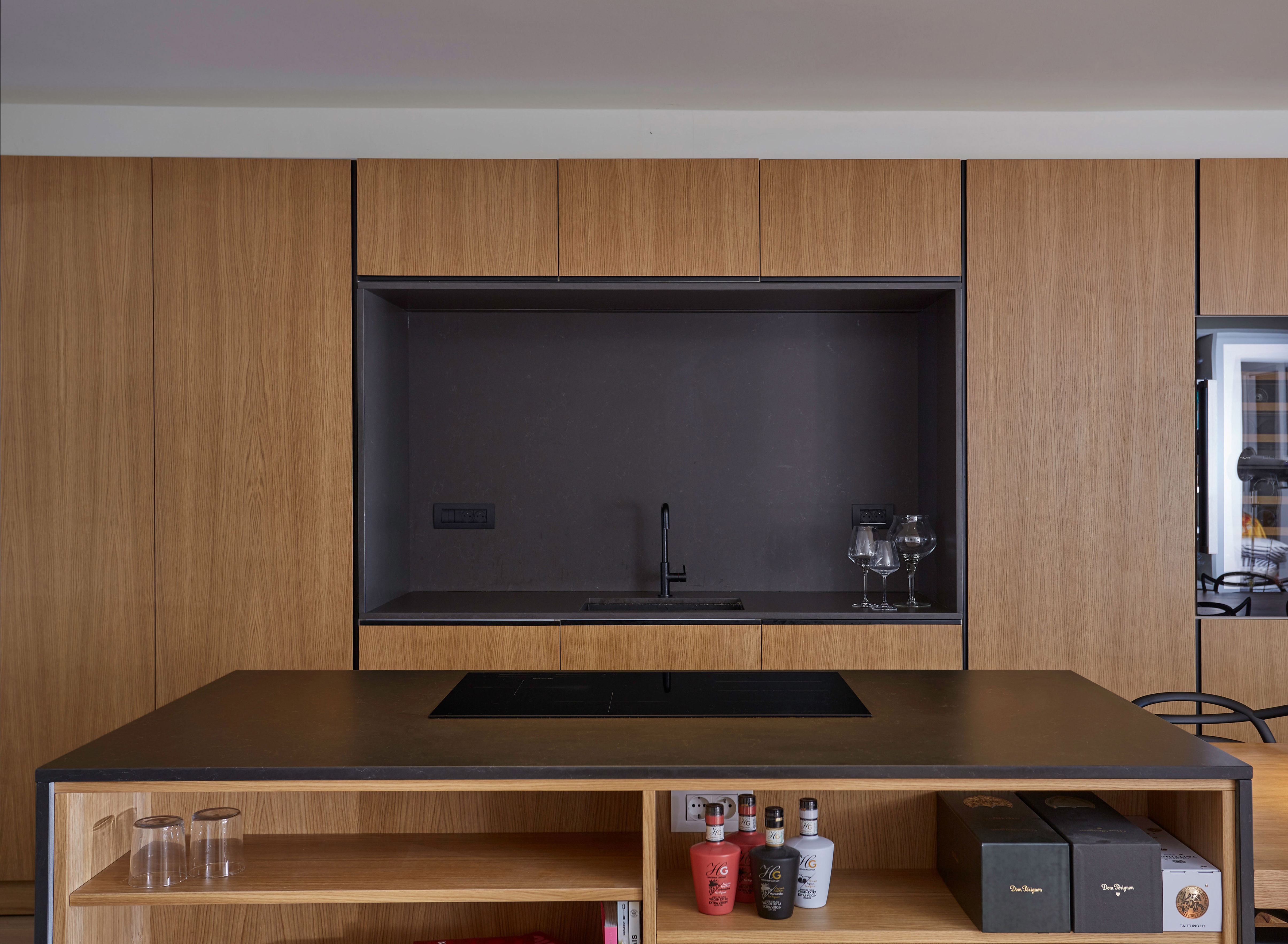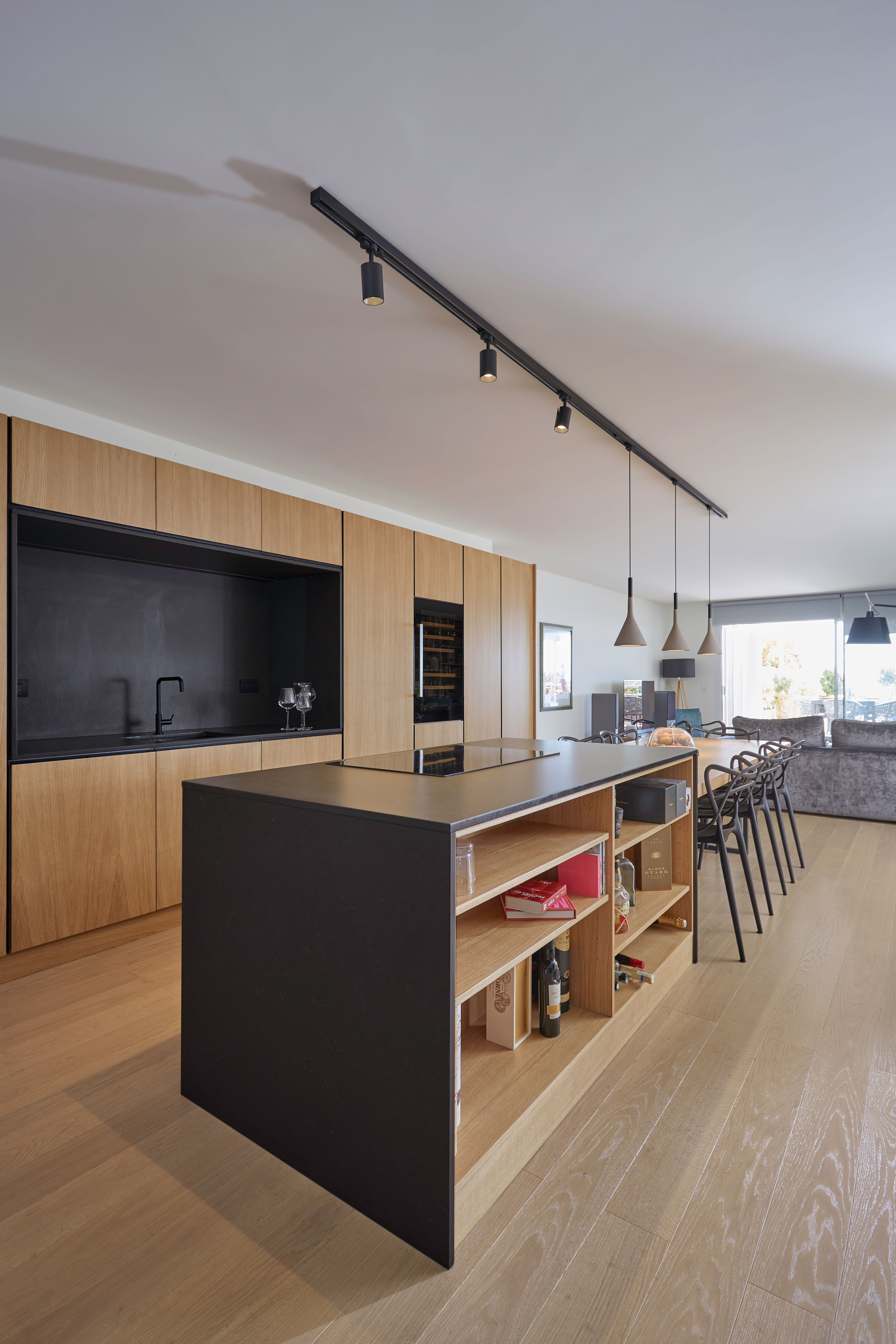 Il progetto di interior design è caratterizzato da una estetica contemporanea e lineare ed ha coinvolto il disegno e la composizione della cucina con schema ad isola e tavolo integrato, la cui finitura è in legno di rovere per le pannellature e in neolith di colore nero per i piani lavoro, pensata per essere elemento nodale e di convivialità.