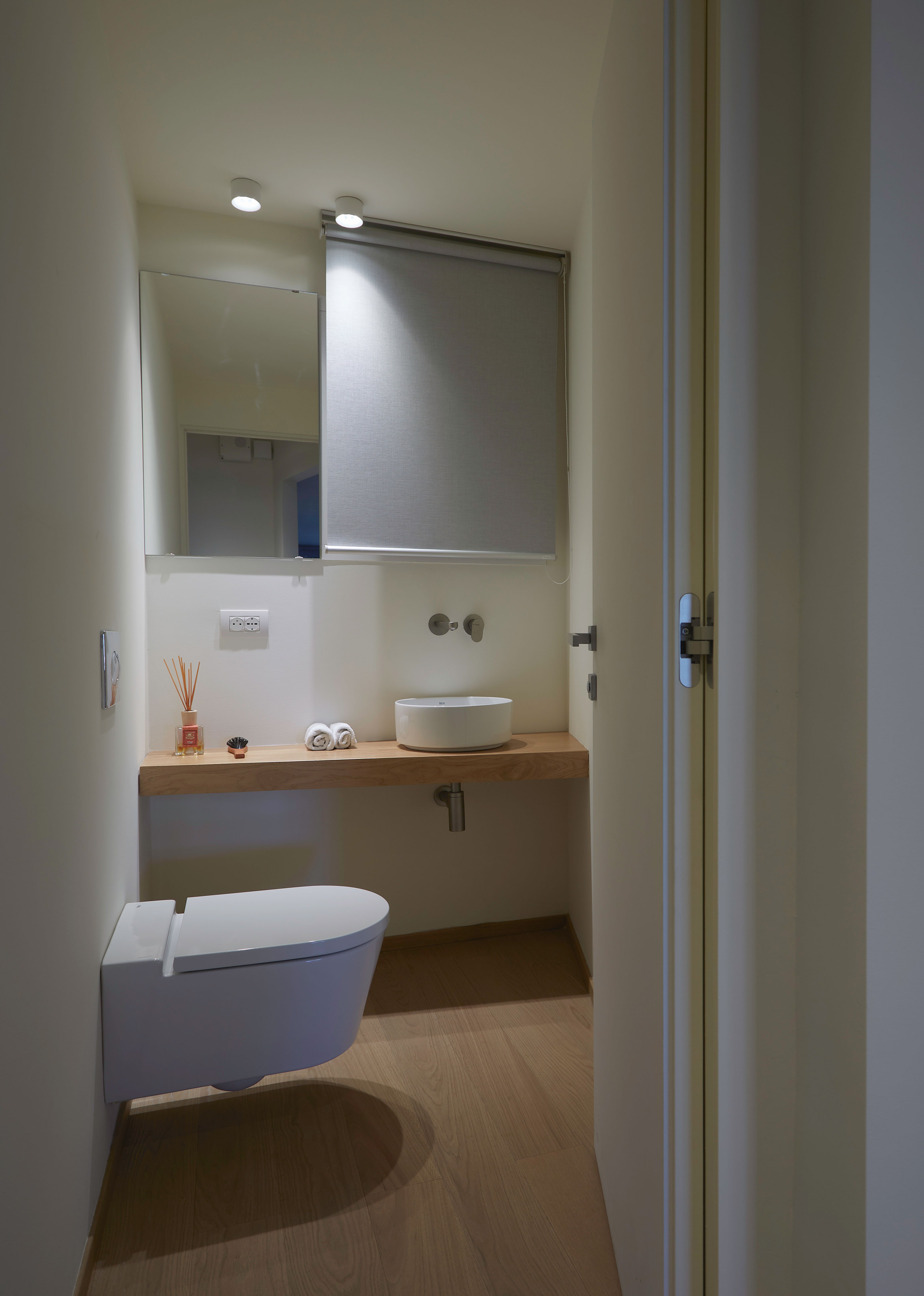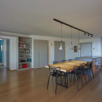 Abbiamo quindi ragionato su uno schema di distribuzione interna che potesse valorizzare la vista sull’ ampia terrazza in modo che questa, rappresentasse una estensione degli spazi di soggiorno dell’alloggio.