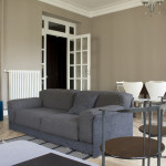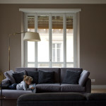 Le vecchie porte sono state trattate a smalto e integrate con nuove porte raso muro e scorrevoli, che delle vecchie porte seguono solo l’altezza fuori standard. Maniglie e pomoli sono stati riproposti in stile, con finitura nichelata. In soggiorno i vecchi imbottiti dei proprietari trovano nuova vita: un fascinoso divano anni Settanta, è stato rivestito in tessuto bouclé nei toni del grigio scuro e un più moderno divano ad L, in parte riadattato secondo una linea più soft, è stato rivestito in tessuto a trama sottile color grigio perla. Arredi e oggettistica di modernariato trovano una giusta collocazione in questa casa dall’atmosfera vintage.