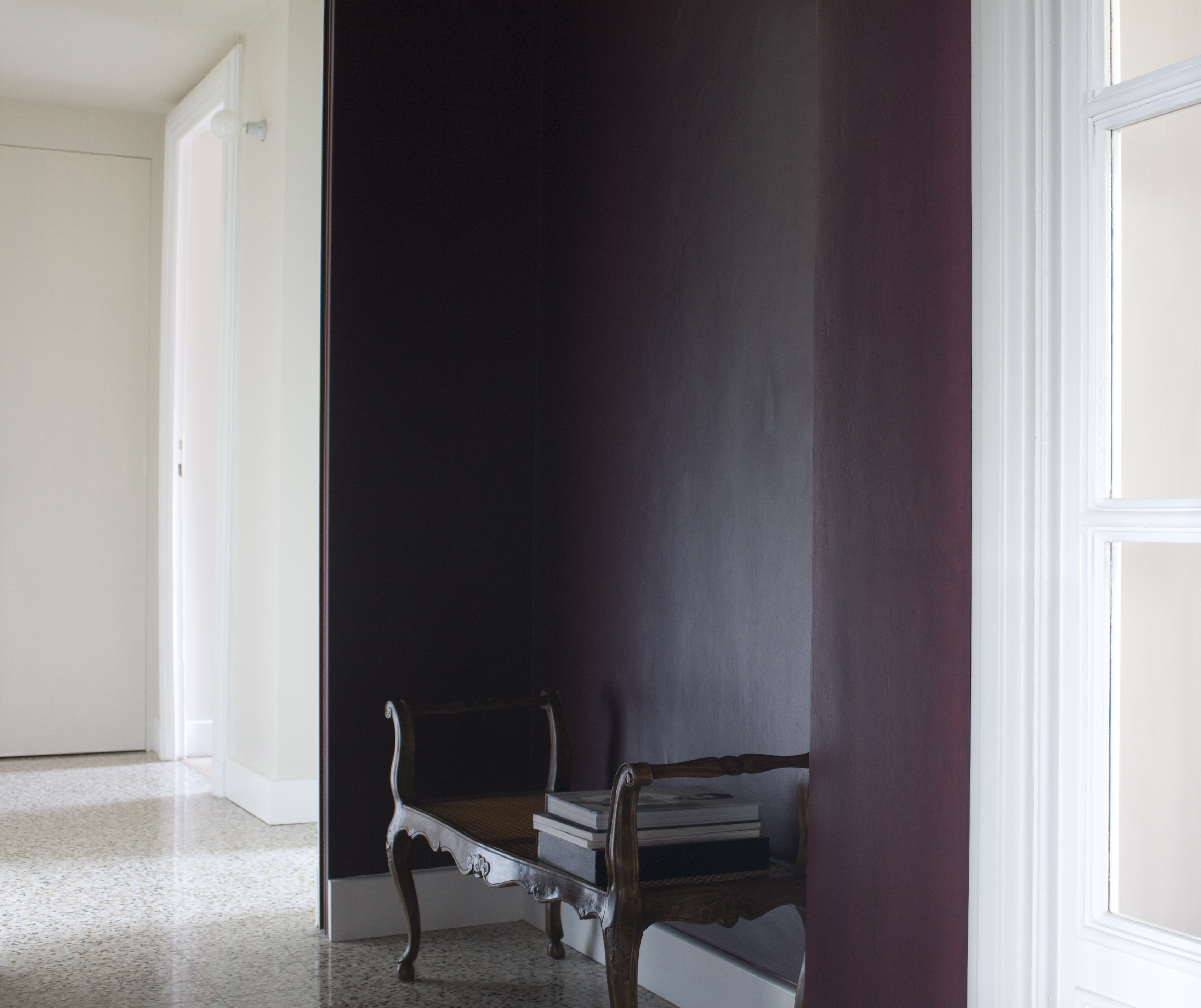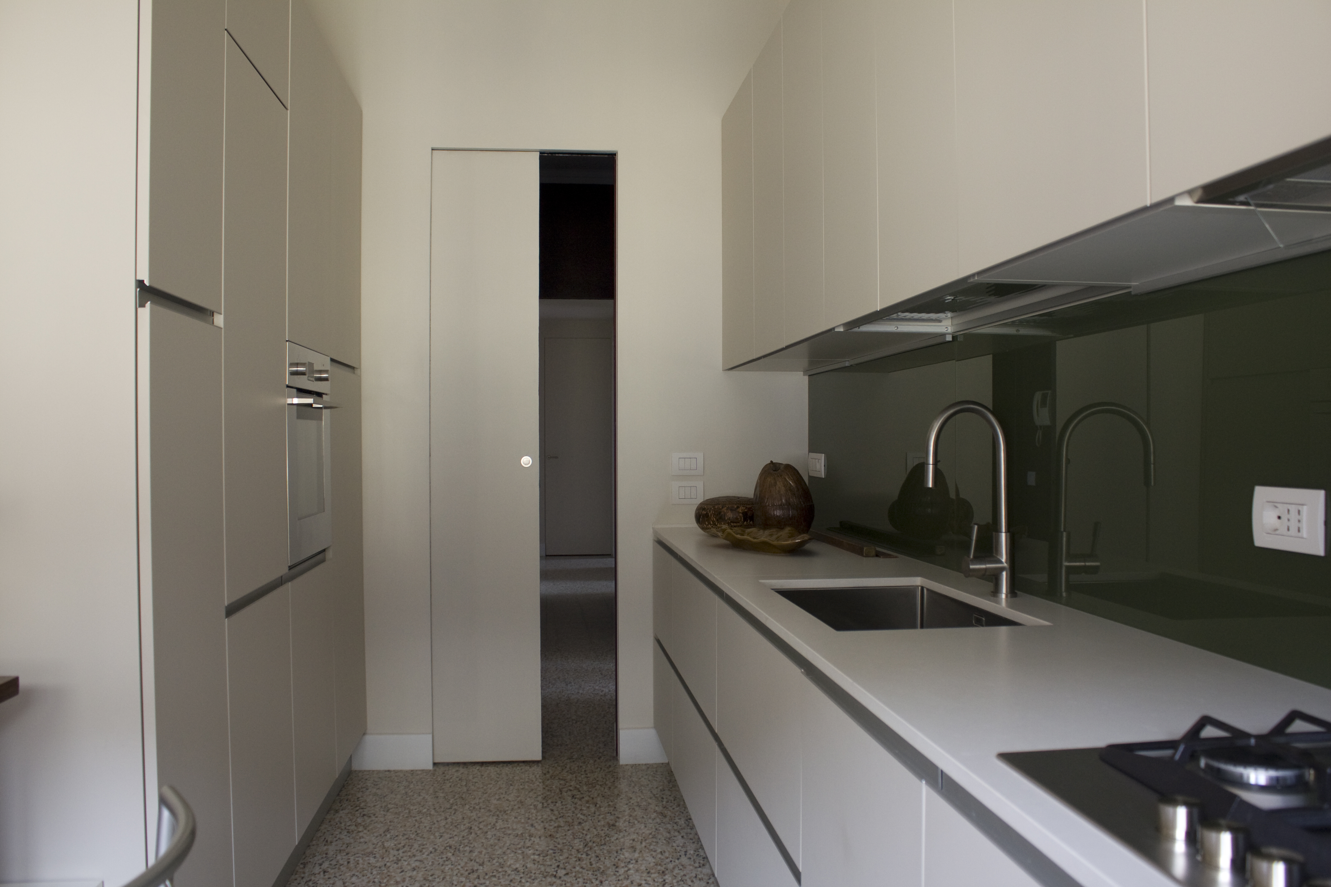 I pavimenti in legno esistenti di camere e living sono stati trattati, restituendogli una finitura opaca più contemporanea. La porzione dei nuovi pavimenti (ingresso, cucina, disimpegno zona notte e cabina armadi) è stata rivestita con una graniglia realizzata su misura da un artigiano locale, scegliendo granulometria e colore di pasta e pietre. Per i bagni dal gusto rétro, sono state scelte le diamantine di Etruria Design dai toni neutri: mandorla, rosa cipria e verde oliva. Col contributo della committente, grafica di professione e dal gusto ricercato, si è dato ampio spazio al colore nella scelta della palette murale: dall’ingresso color amaranto, al soggiorno color tortora e alle sue declinazioni più chiare nelle camere e nella cucina, fino al mauve per la camera della bambina, rosa antico e mandorla per il bagno femminile in diamantine lucide. E’ stato scelto un color oliva per i rivestimenti del bagno maschile e un verde bottiglia per il fondale in vetro della cucina lineare, realizzata con pannelli a finitura opaca color canapa.