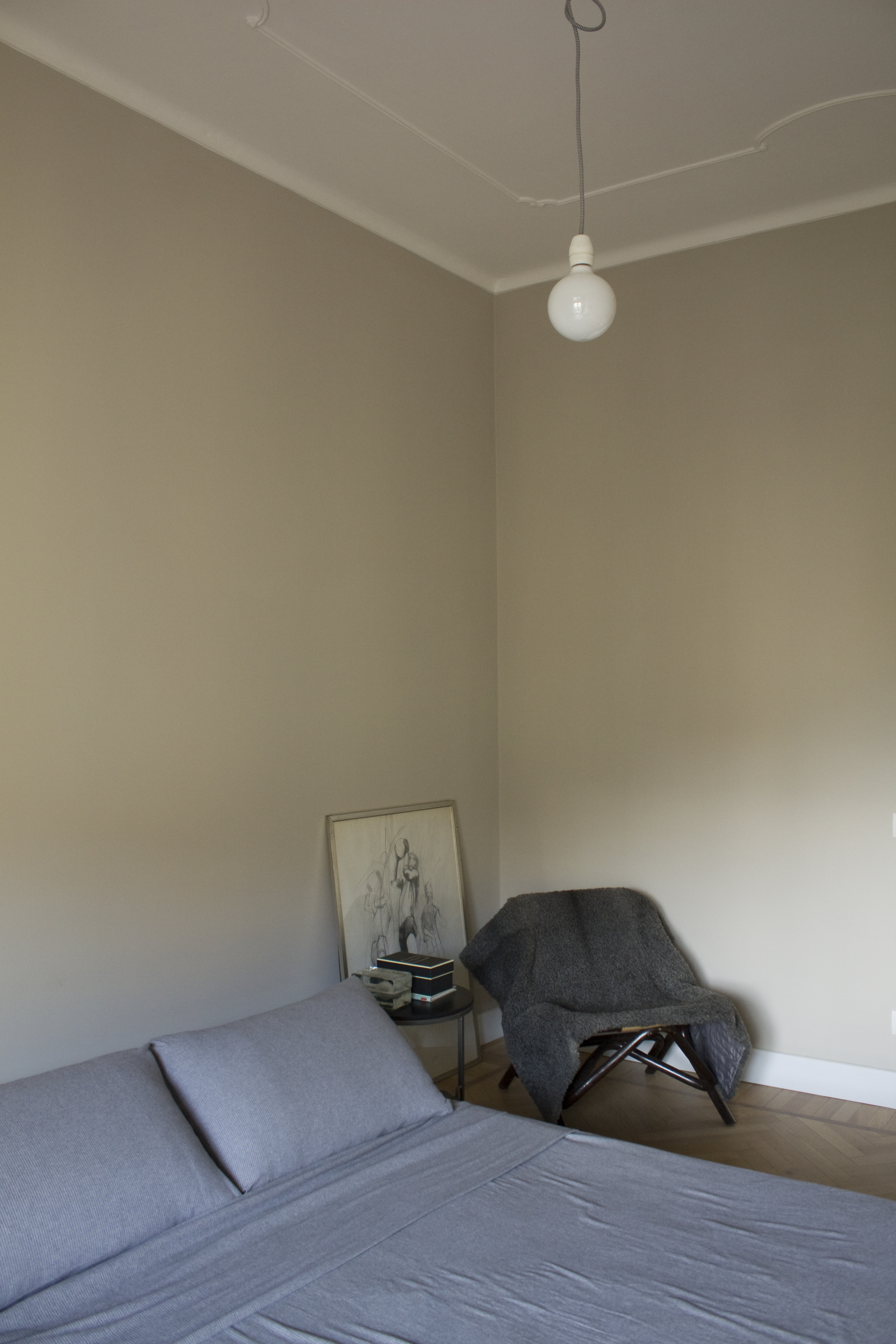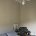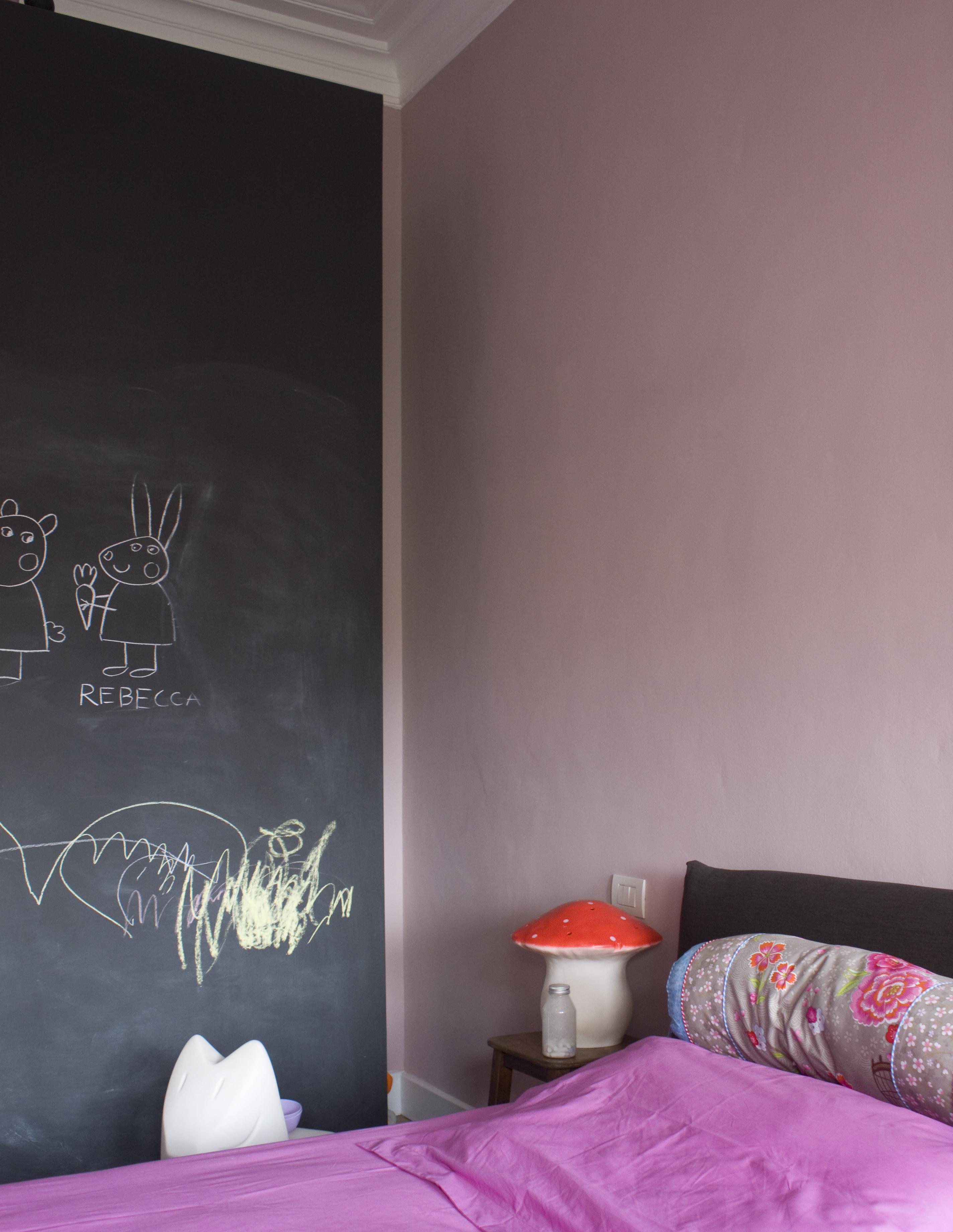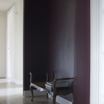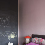 Si ripensa alla distribuzione interna in modo da separare meglio la zona notte e servizi dalla zona giorno e destinando al grande soggiorno una posizione angolare molto luminosa. Il lungo corridoio sparisce, in parte assorbito dall’area d’ingresso e in parte dal disimpegno della zona notte. Qui si ricava un vano lavanderia nascosto, chiuso da pannelli filo muro disegnati su misura. Non ci sono armadi nelle camere, ma viene ricavata una spaziosa cabina armadio che in pianta sembra invadere parte della camera della bambina, e invece, da questa intersezione di pareti, si ricava uno scenografico fondale, la parete lavagna per la piccola Emma. In questa porzione della casa si adotta un’utile soluzione salva spazio, sfruttando l’altezza dei soffitti e realizzando un controsoffitto portante, che diventa un ripostiglio con accesso dalla cabina guardaroba.