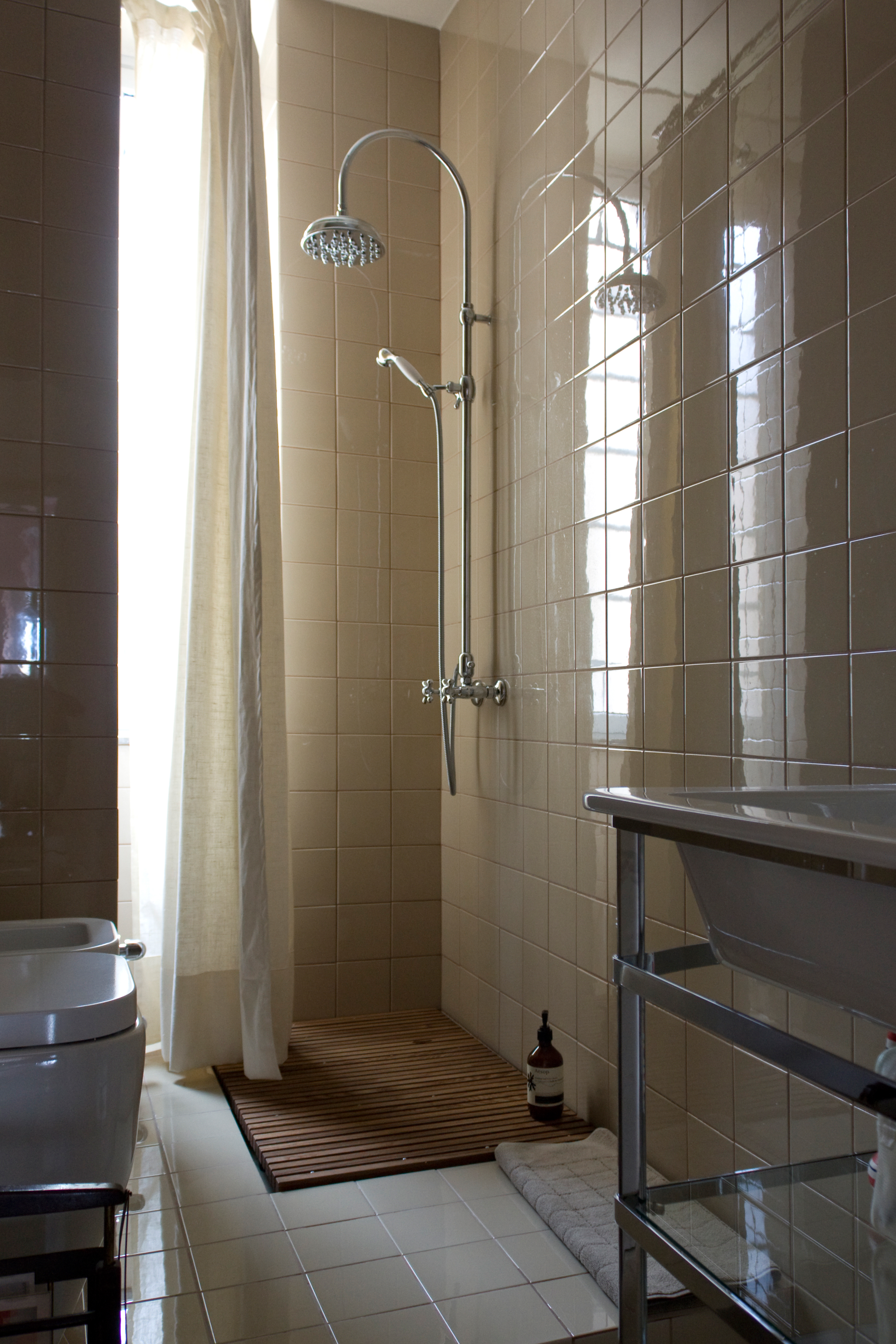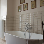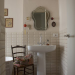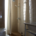 Nei bagni ai sanitari dalla linea classica associamo la vasca a catino in tecnoril del bagno dedicato alle ragazze e una doccia filo-pavimento nel bagno maschile.