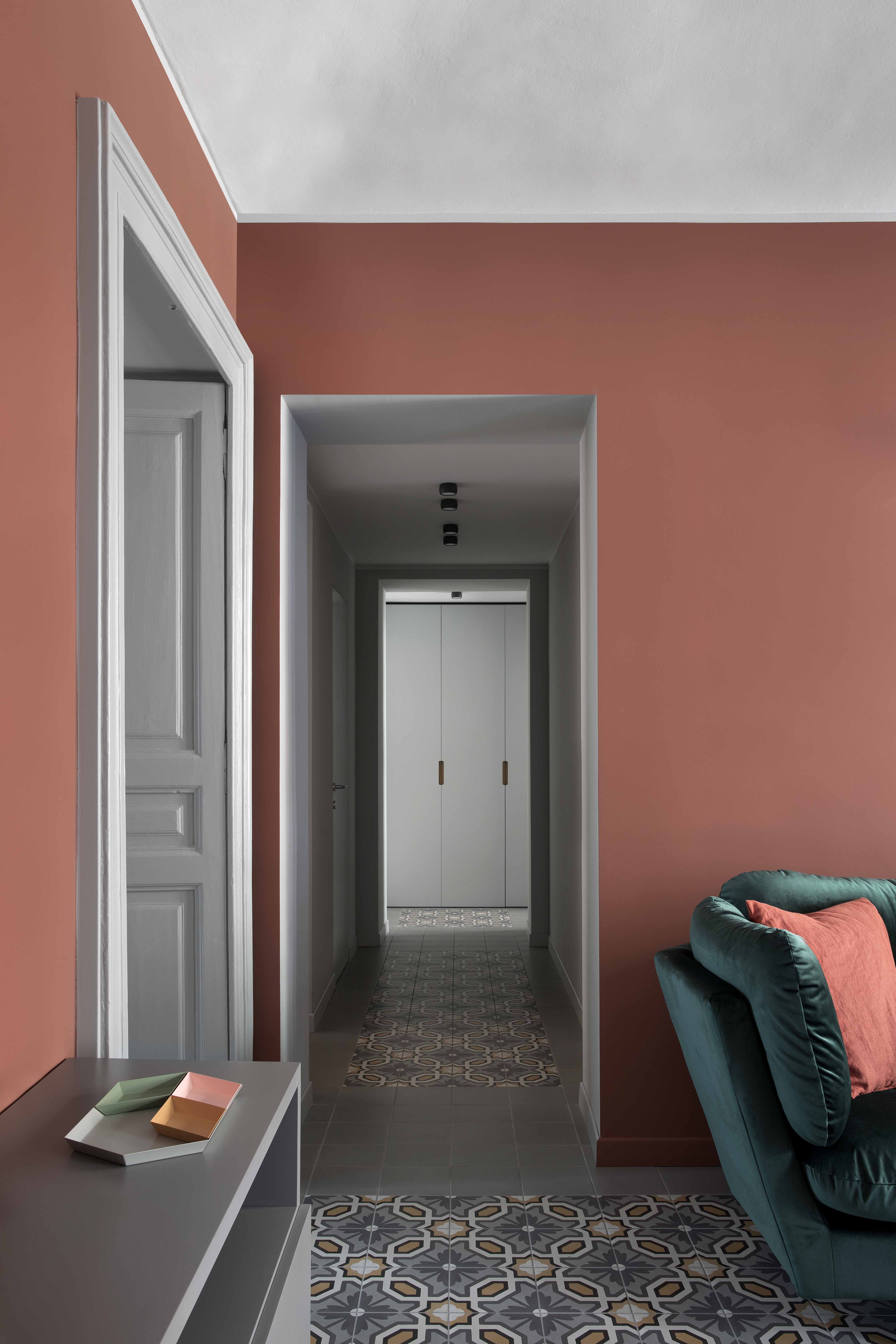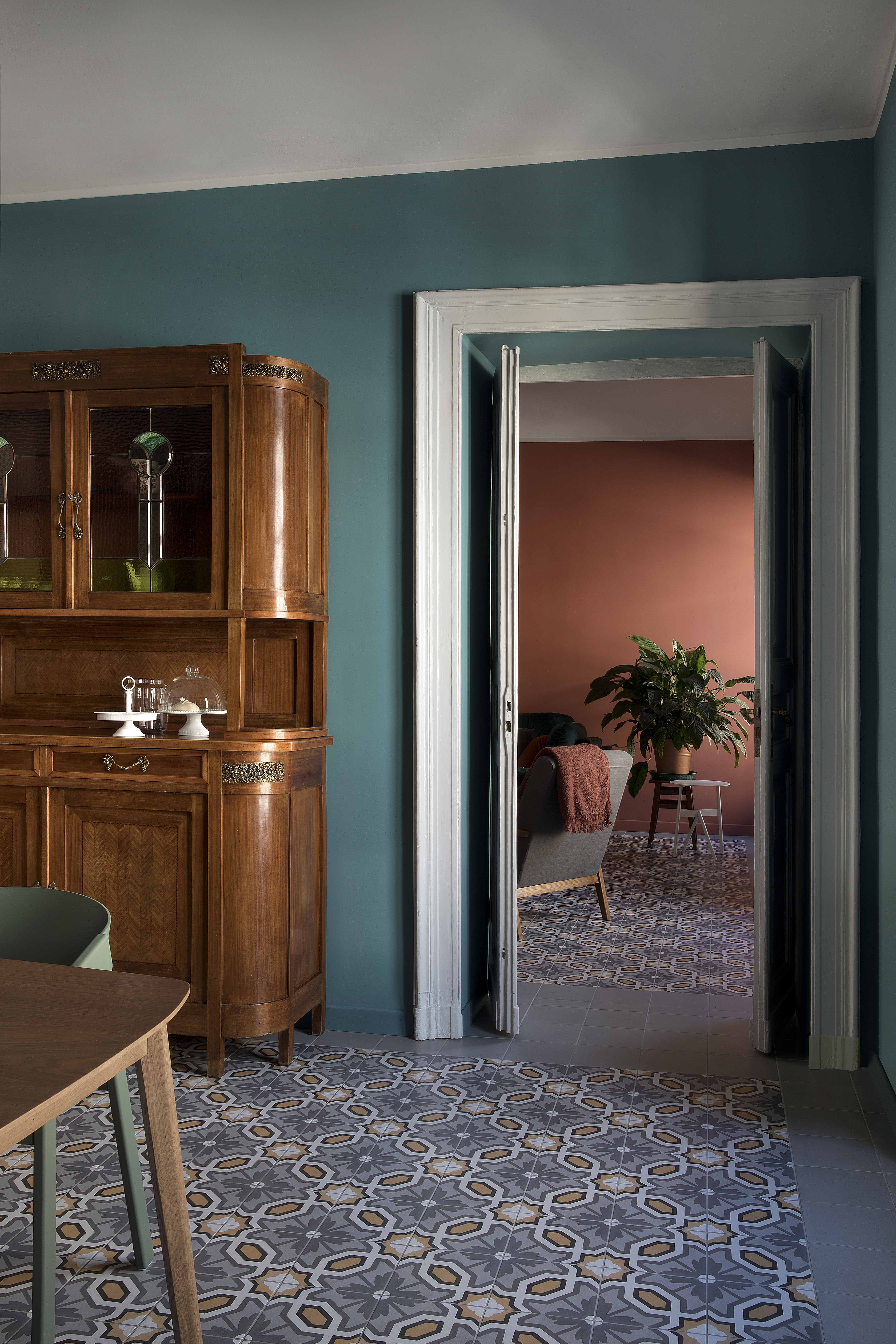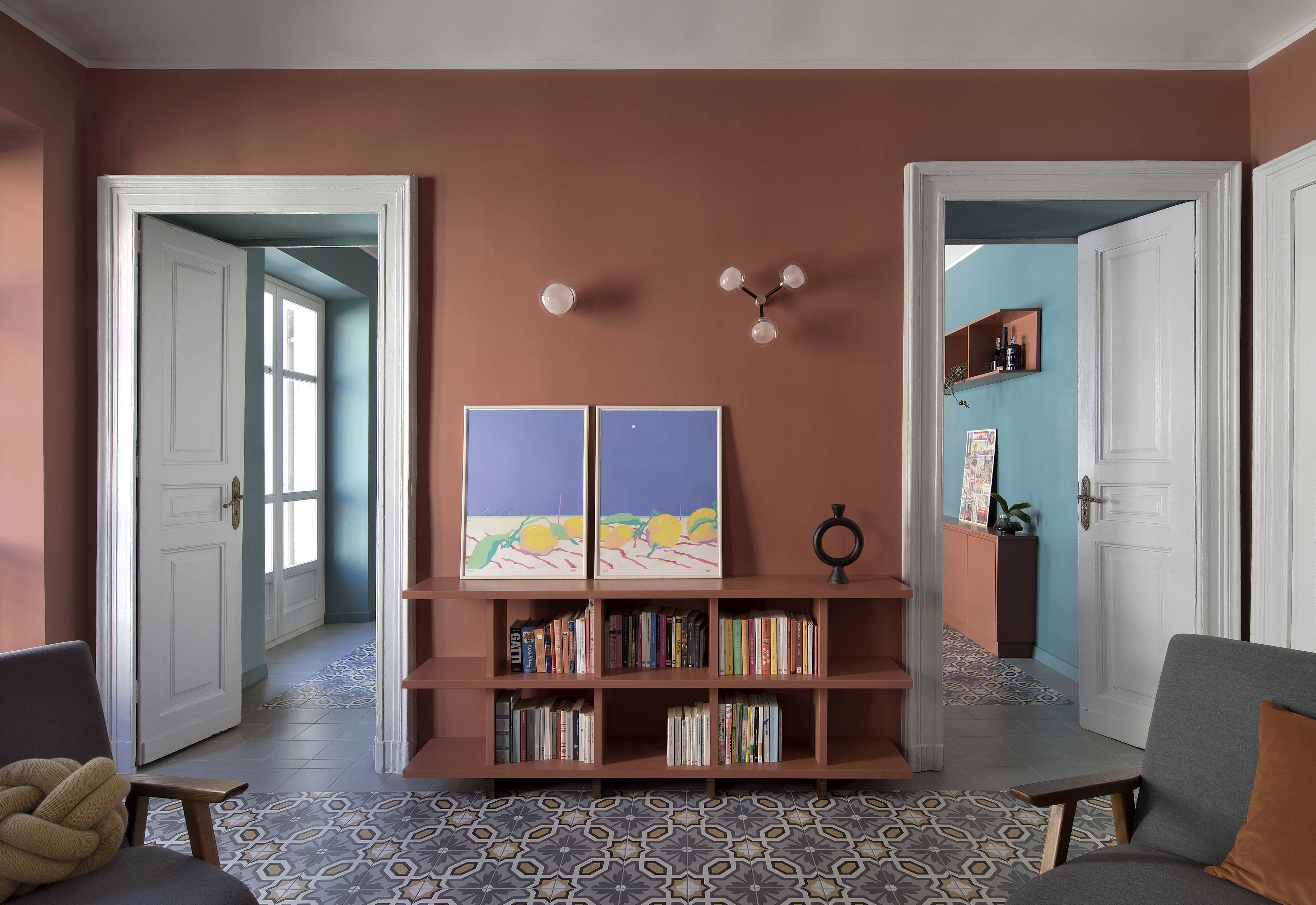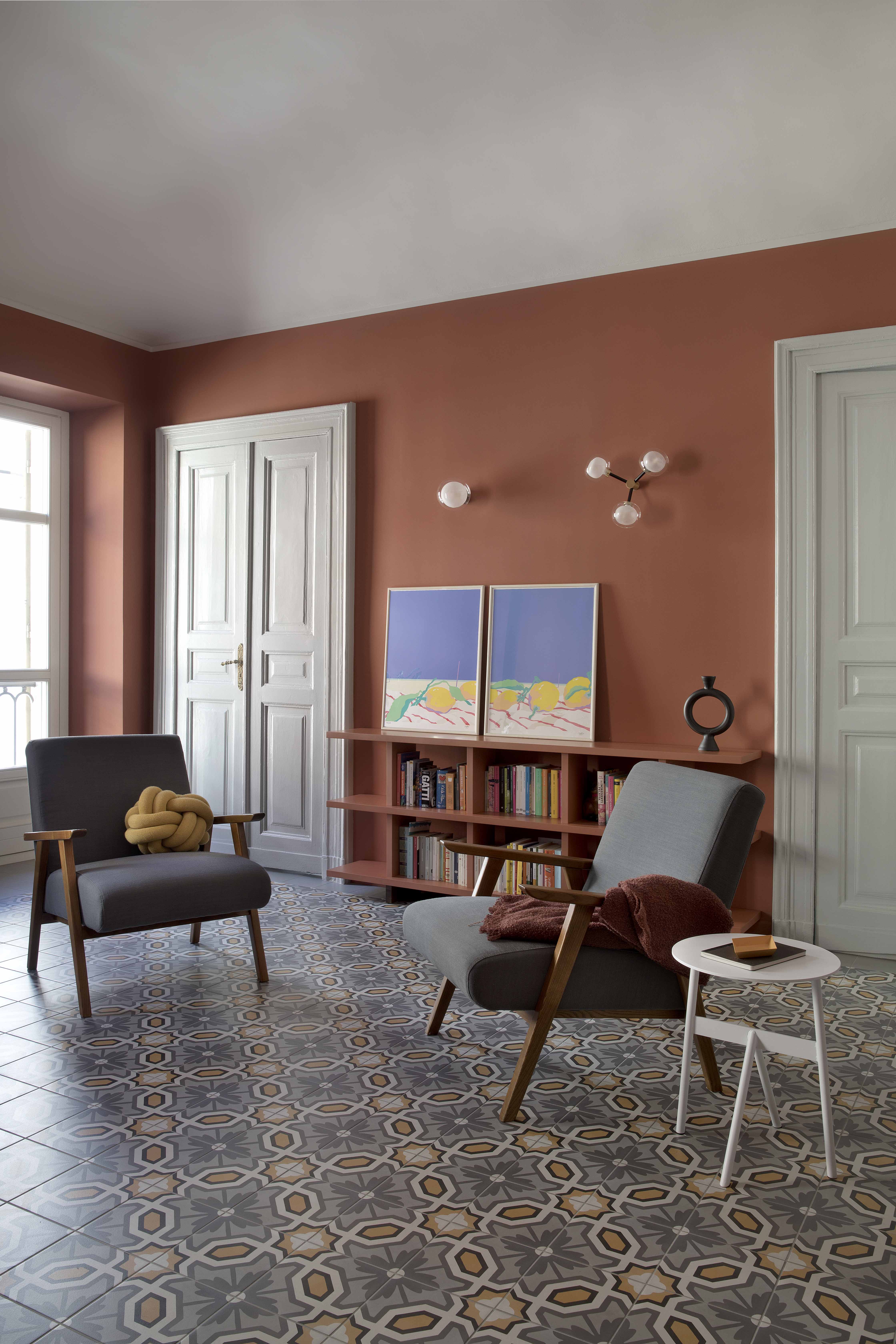 Queste piastrelle decò sono state posate come tappeti, in ognuno degli ambienti principali, in un mix di toni caldi e freddi intorno a cui ruota tutta la palette cromatica delle decorazioni murarie e degli arredi.