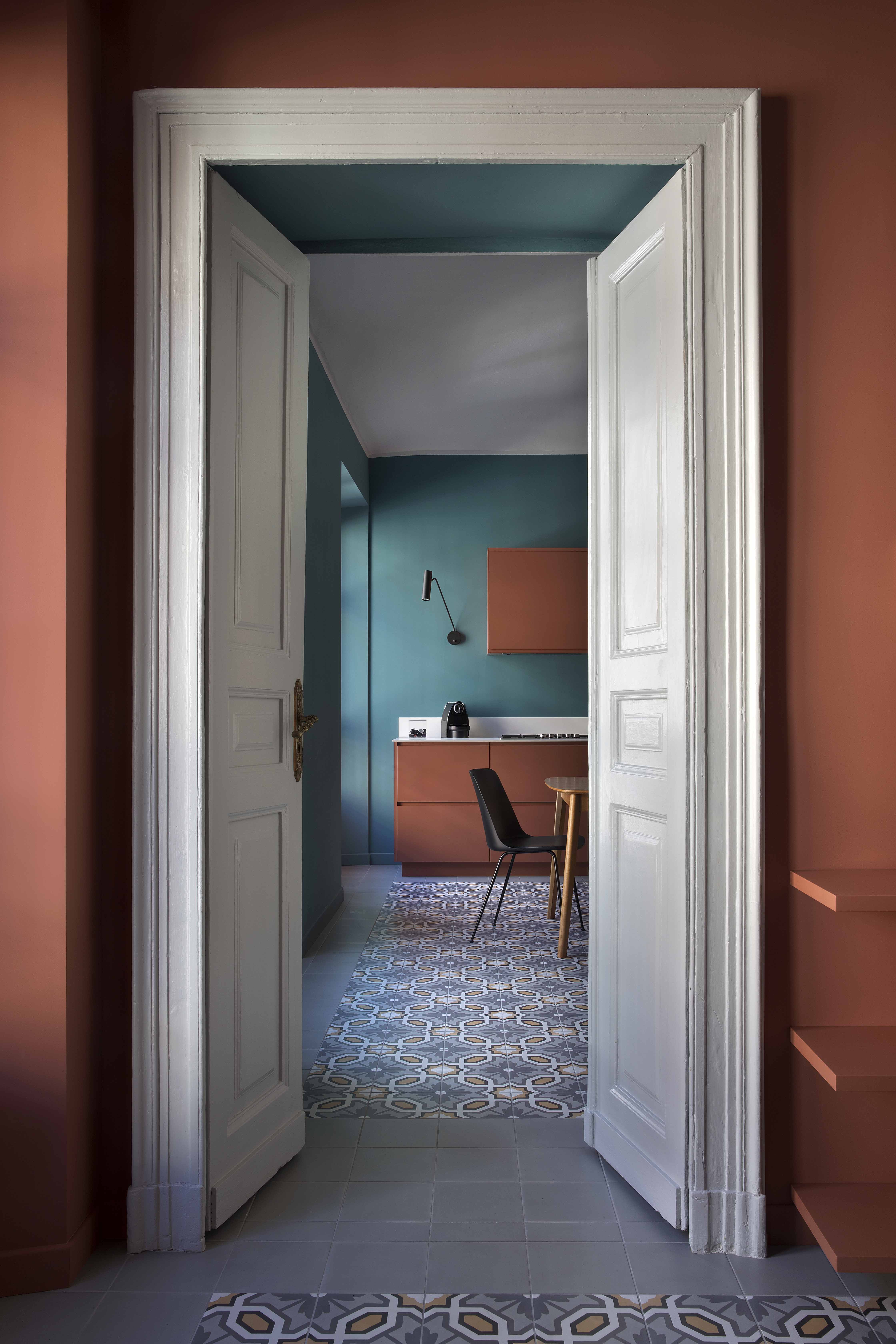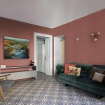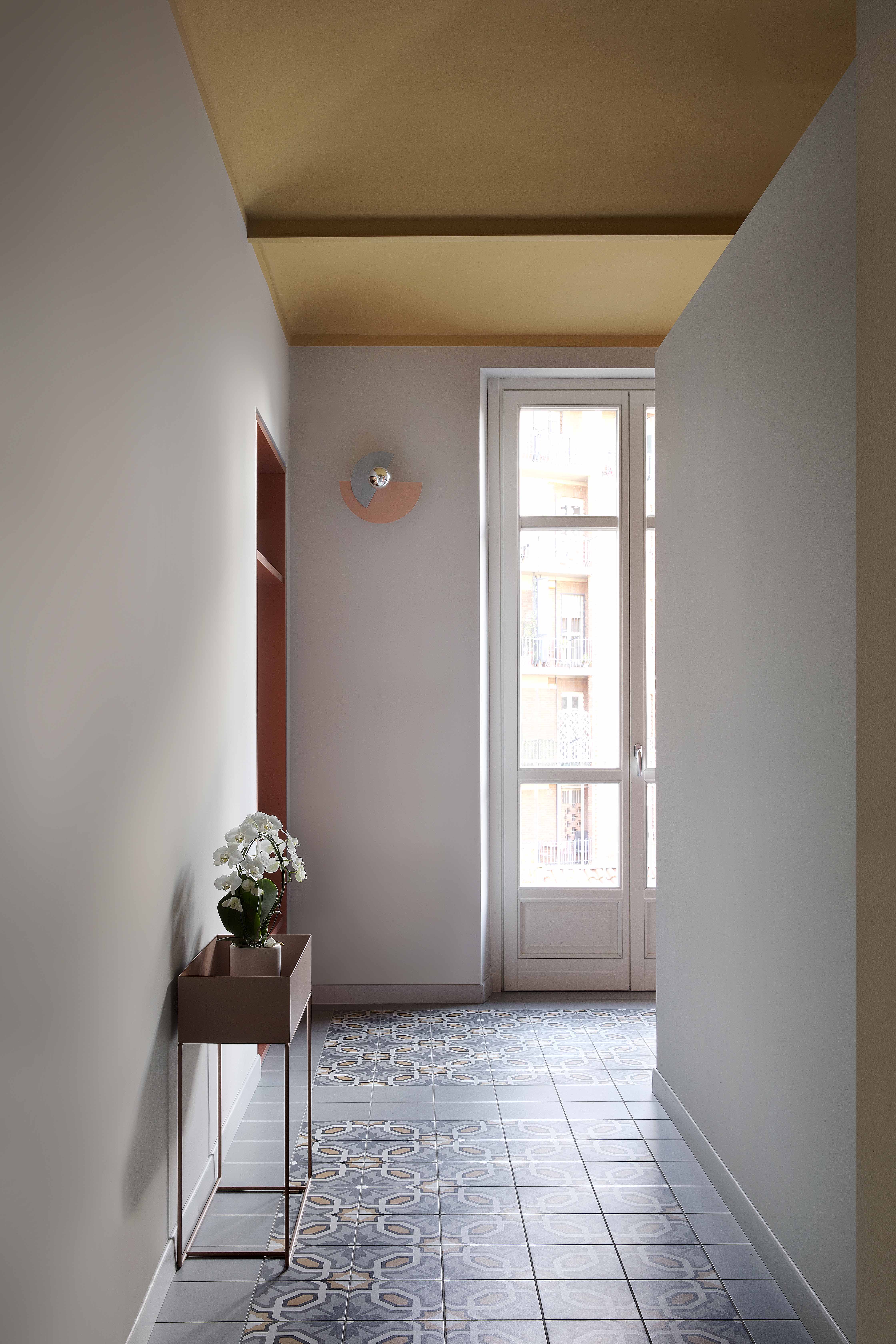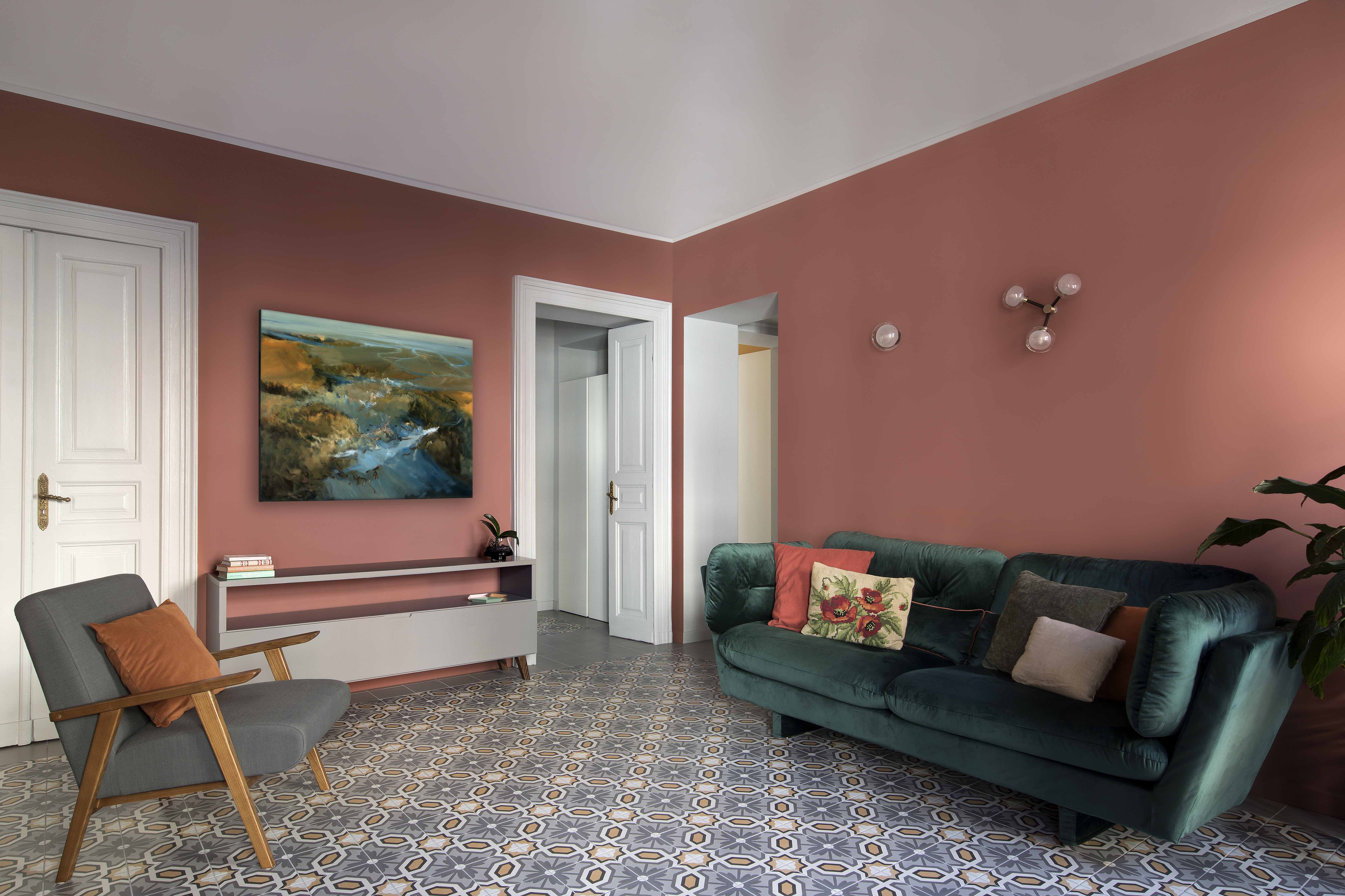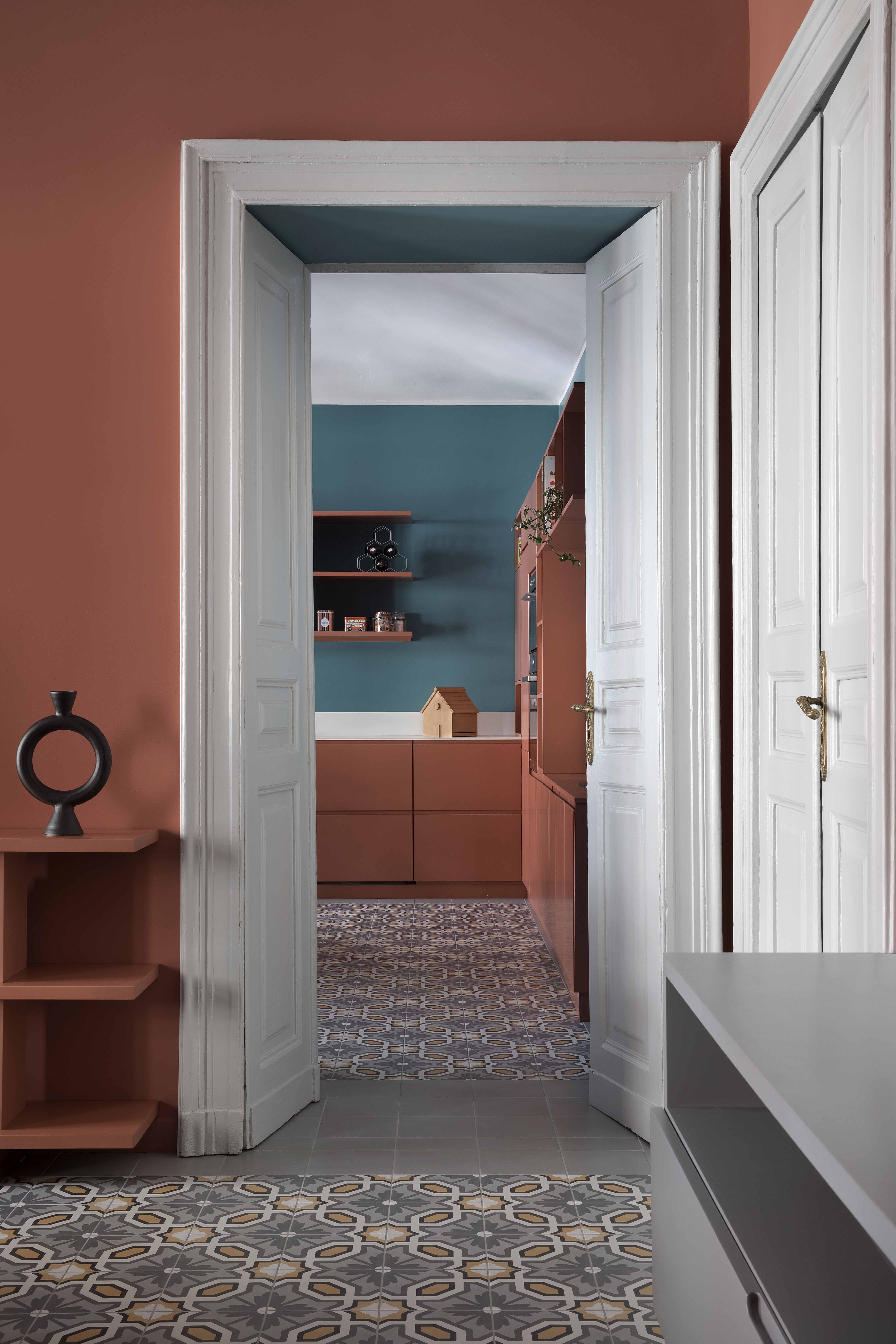 Queste piastrelle decò sono state posate come tappeti, in ognuno degli ambienti principali, in un mix di toni caldi e freddi intorno a cui ruota tutta la palette cromatica delle decorazioni murarie e degli arredi.