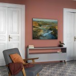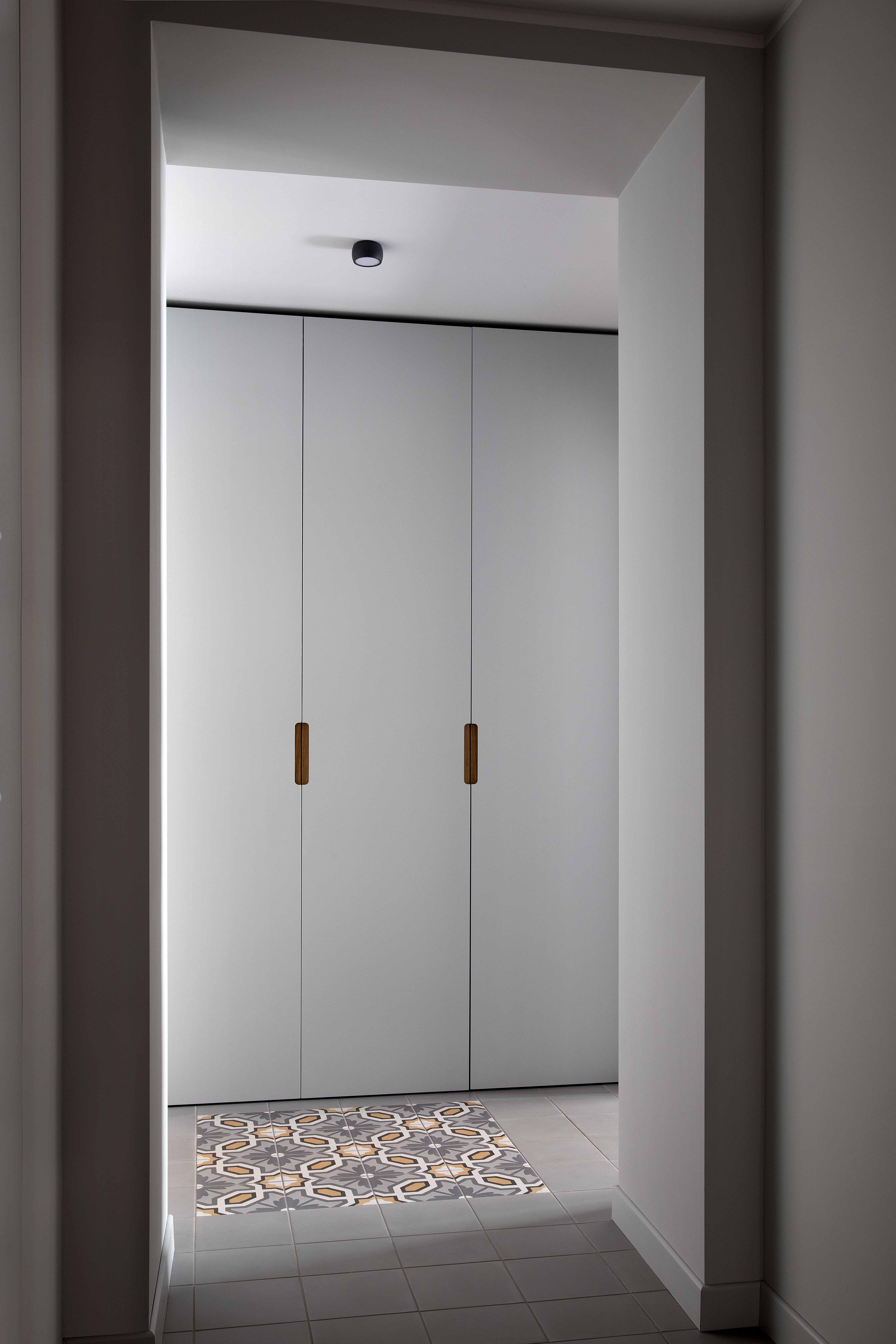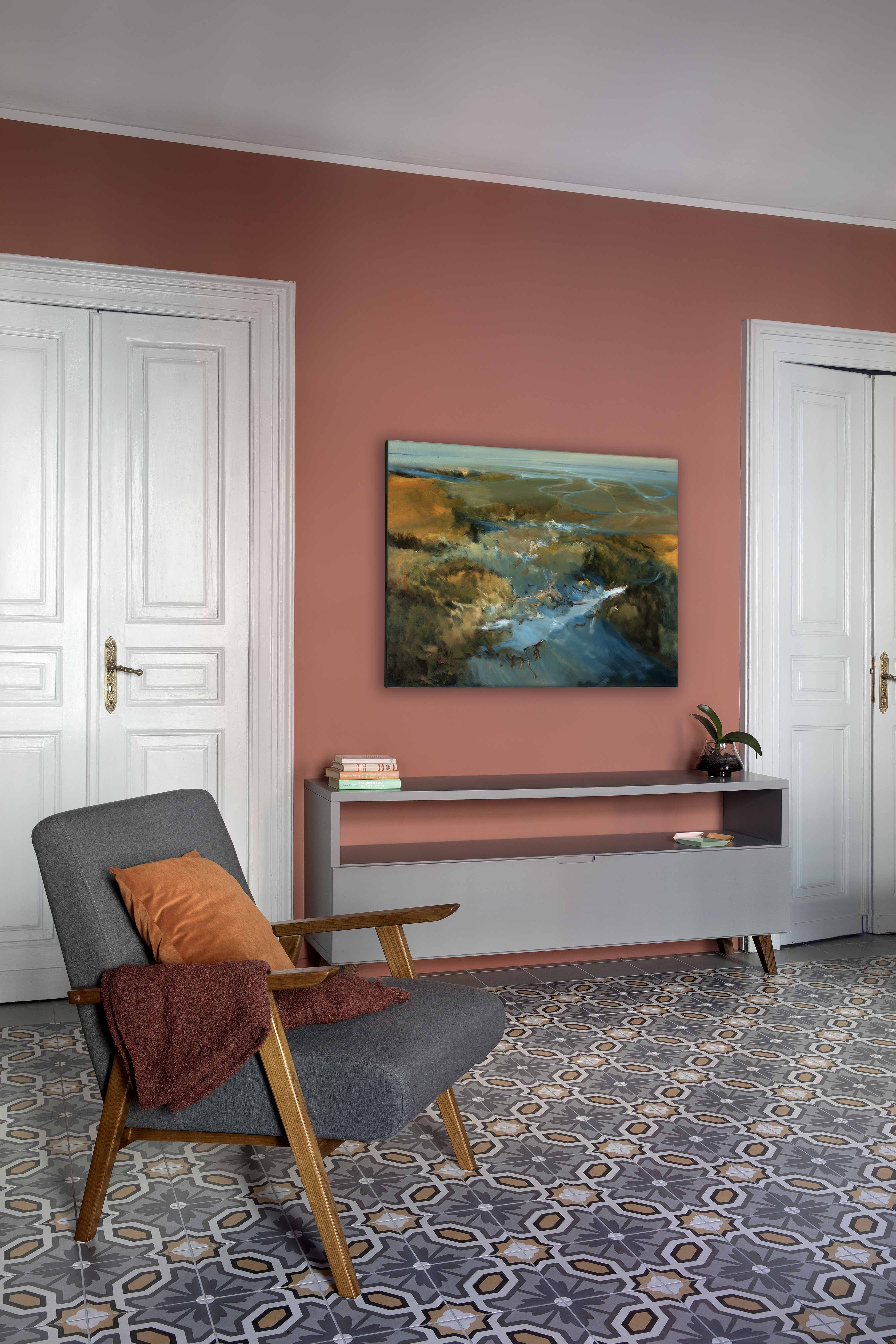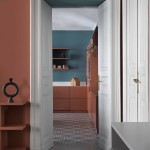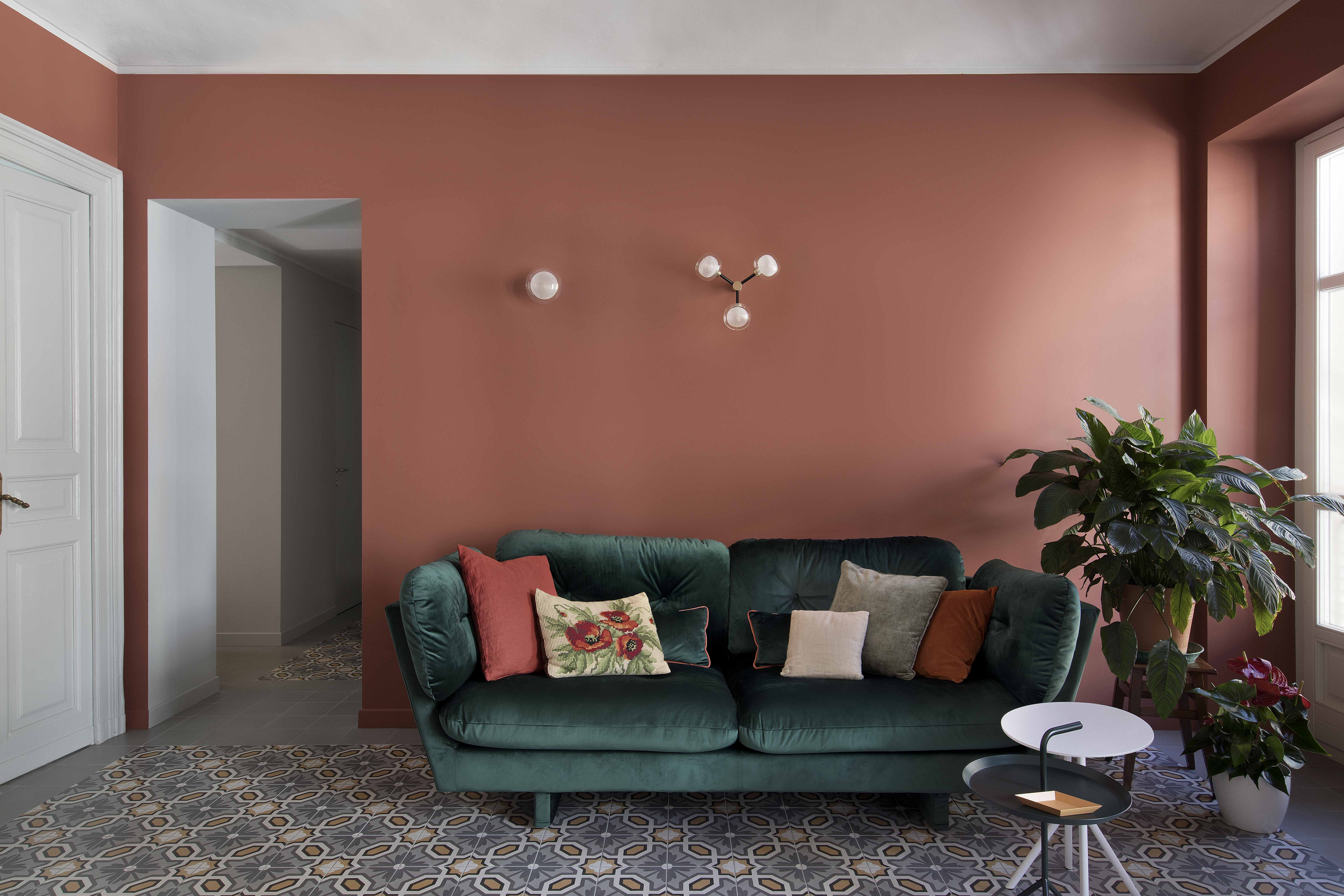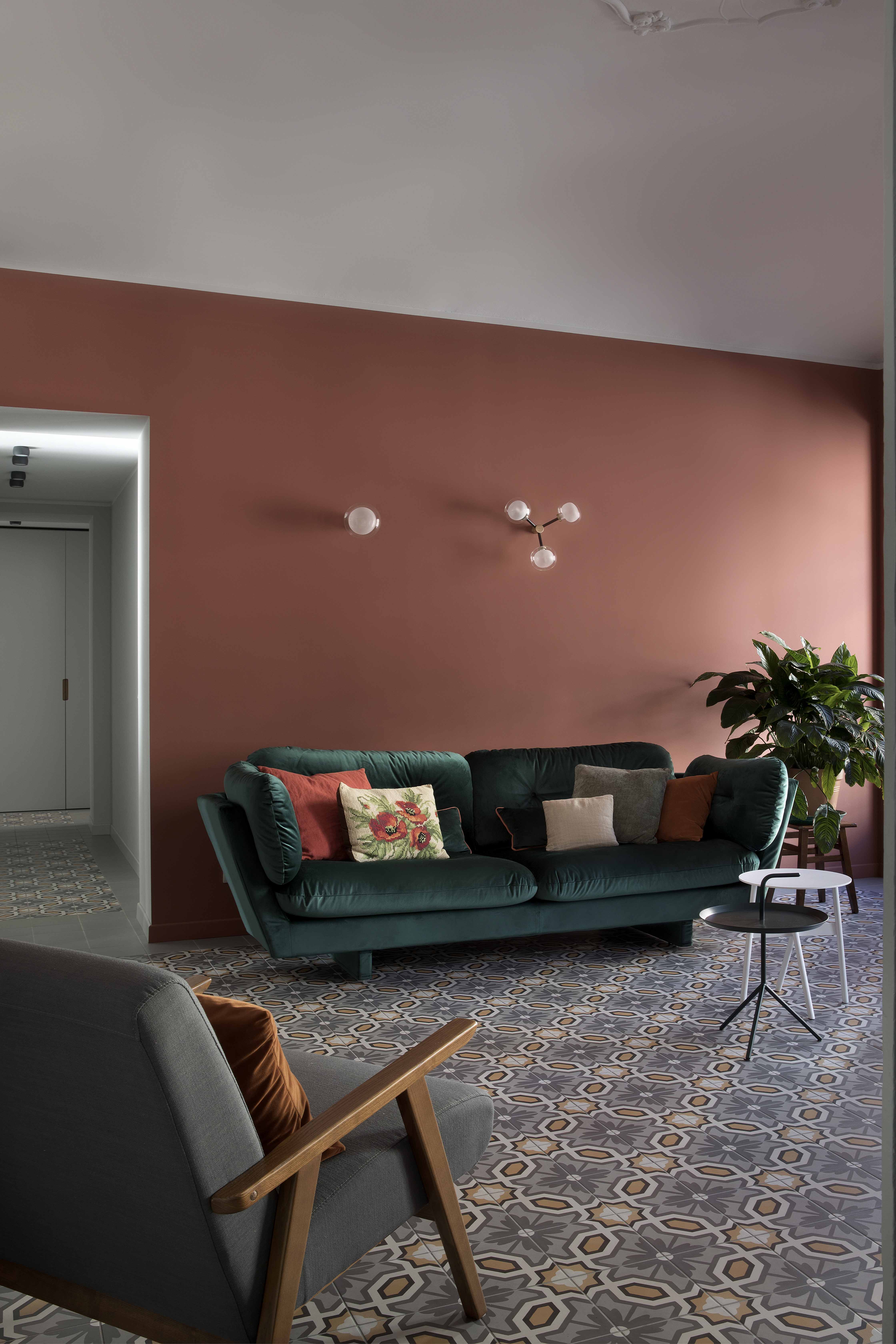 Queste piastrelle decò sono state posate come tappeti, in ognuno degli ambienti principali, in un mix di toni caldi e freddi intorno a cui ruota tutta la palette cromatica delle decorazioni murarie e degli arredi.
