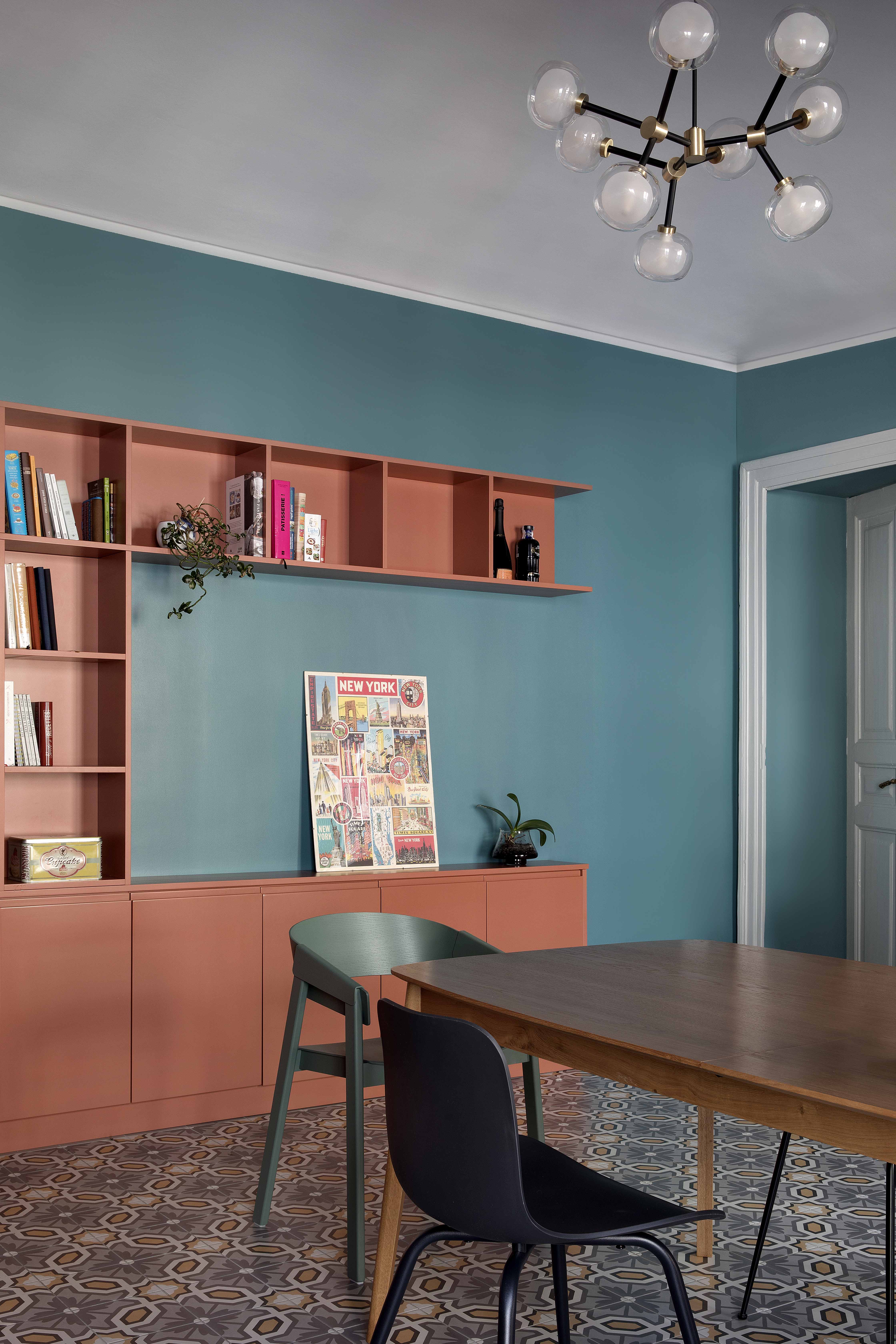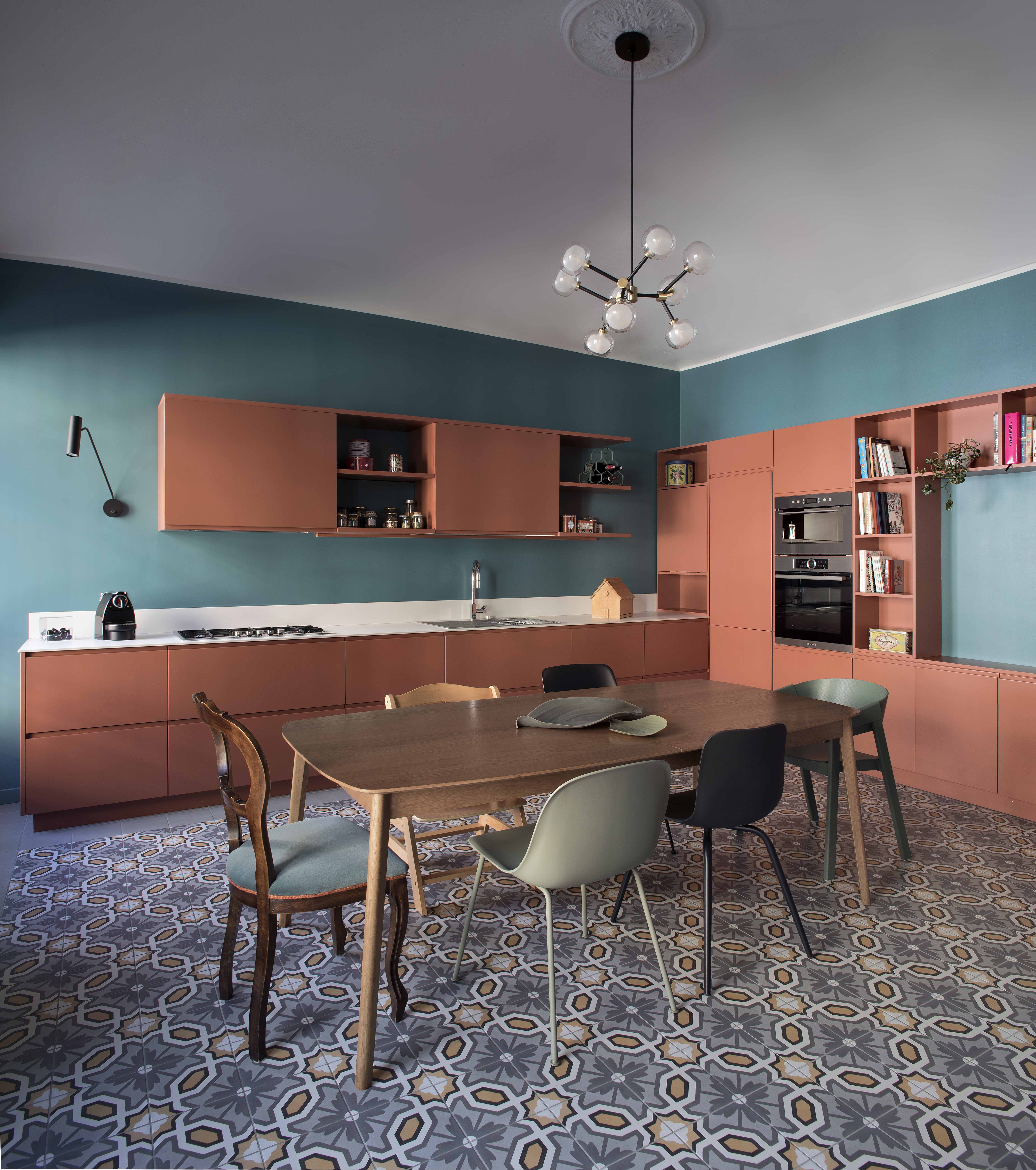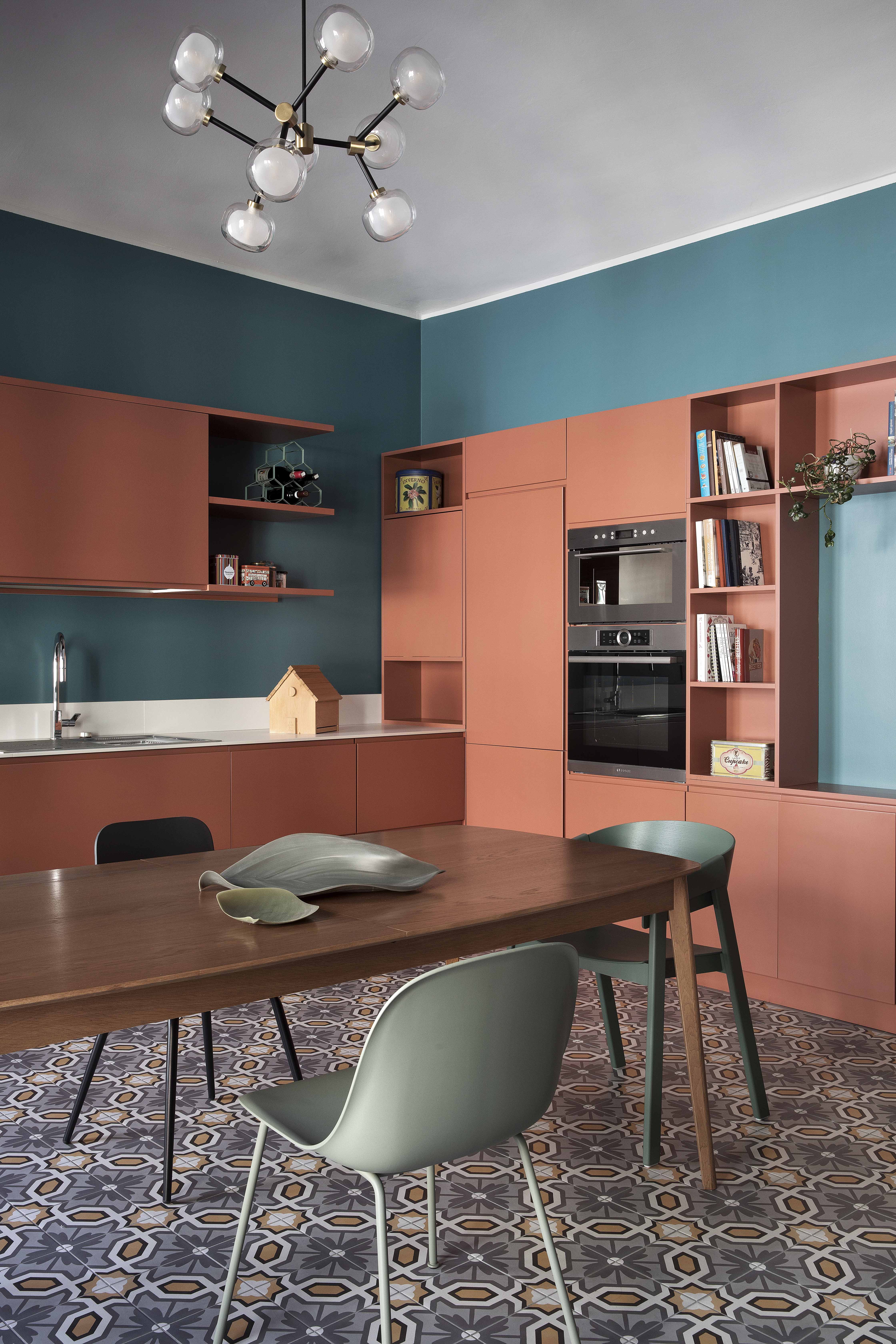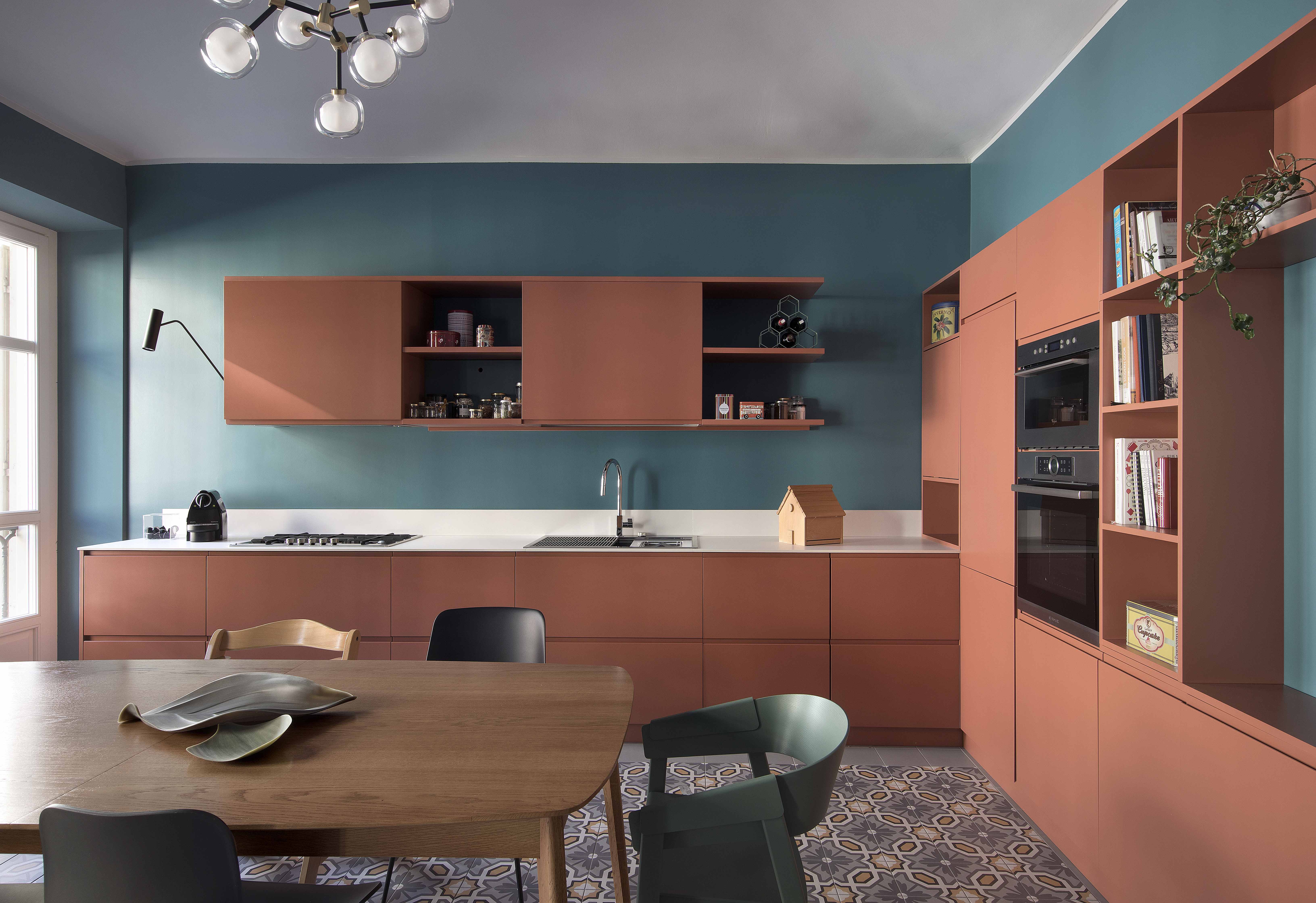 Anche la spaziosa e scenografica cucina che fa da fondale al soggiorno è stata interamente realizzata su disegno per ottimizzare lo sfruttamento di una nicchia in cui è stato inserito il blocco dei grandi elettrodomestici, nonché per sfruttare le due pareti libere della camera. Vani a giorno a vani pensili chiusi dal caldo color marsala si alternano, dando così ritmo e leggerezza alla grande cucina angolare. Il rimando cromatico tra le pareti e la libreria del soggiorno e la cucina è volutamente studiato per dare a questi due ambienti una prospettiva di reciprocità.  Tra i due ambienti si alternano i toni del petrolio dei muri e dei verdi del velluto del divano a quelli terracotta (tuscan red N:140 di Little Greene) e dei grigi. Agli arredi su misura si accostano elementi del design nordico dalle sedie ai coffee table (Normann Copenhagen, &tradition, Muuto, Norr 11, Ferm Living). Anche nella camera padronale con pochi elementi di arredo su misura in legno è stata ricavata una intima e comoda postazione studio in nicchia.