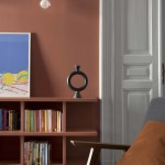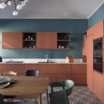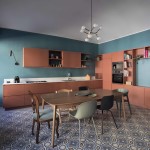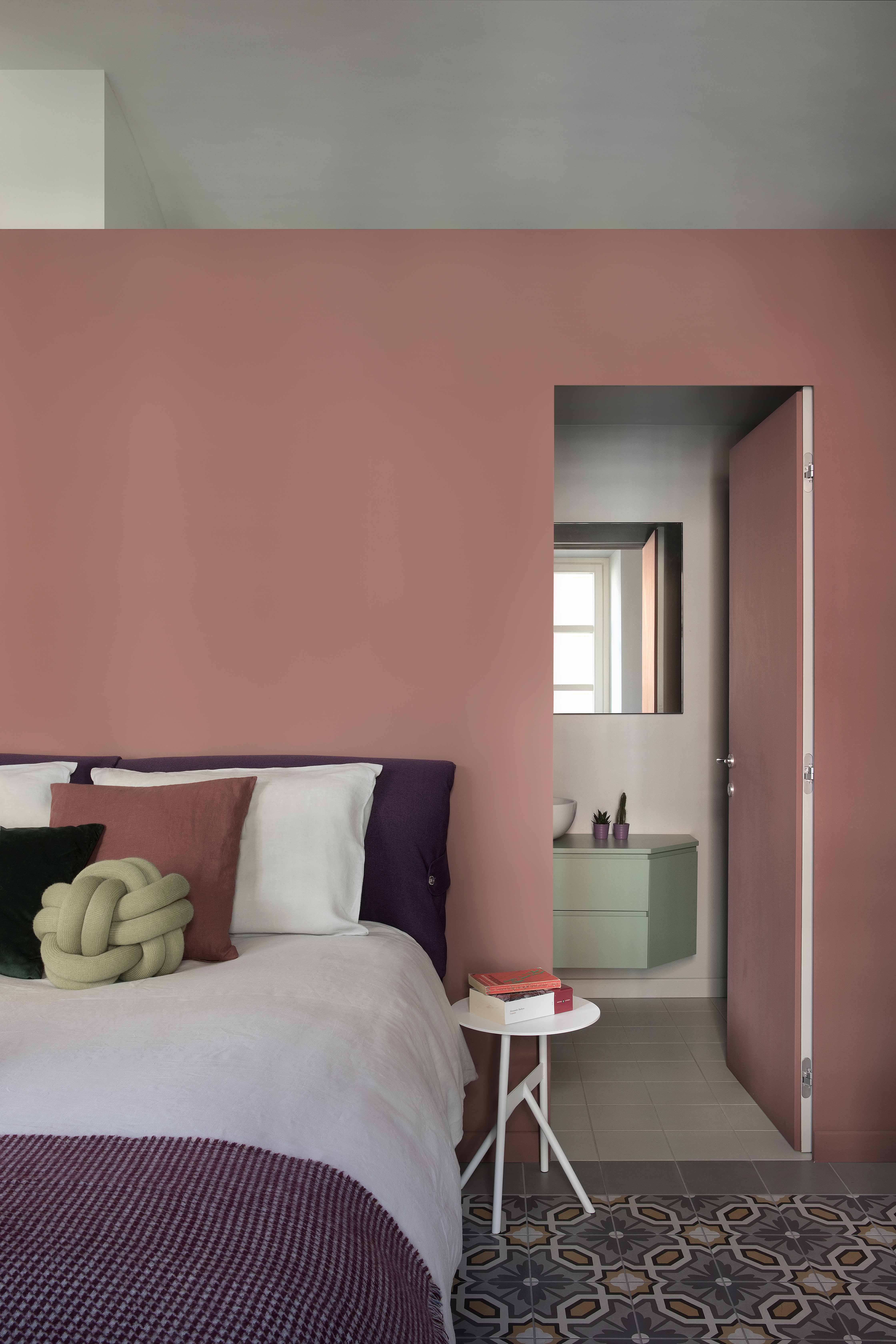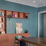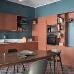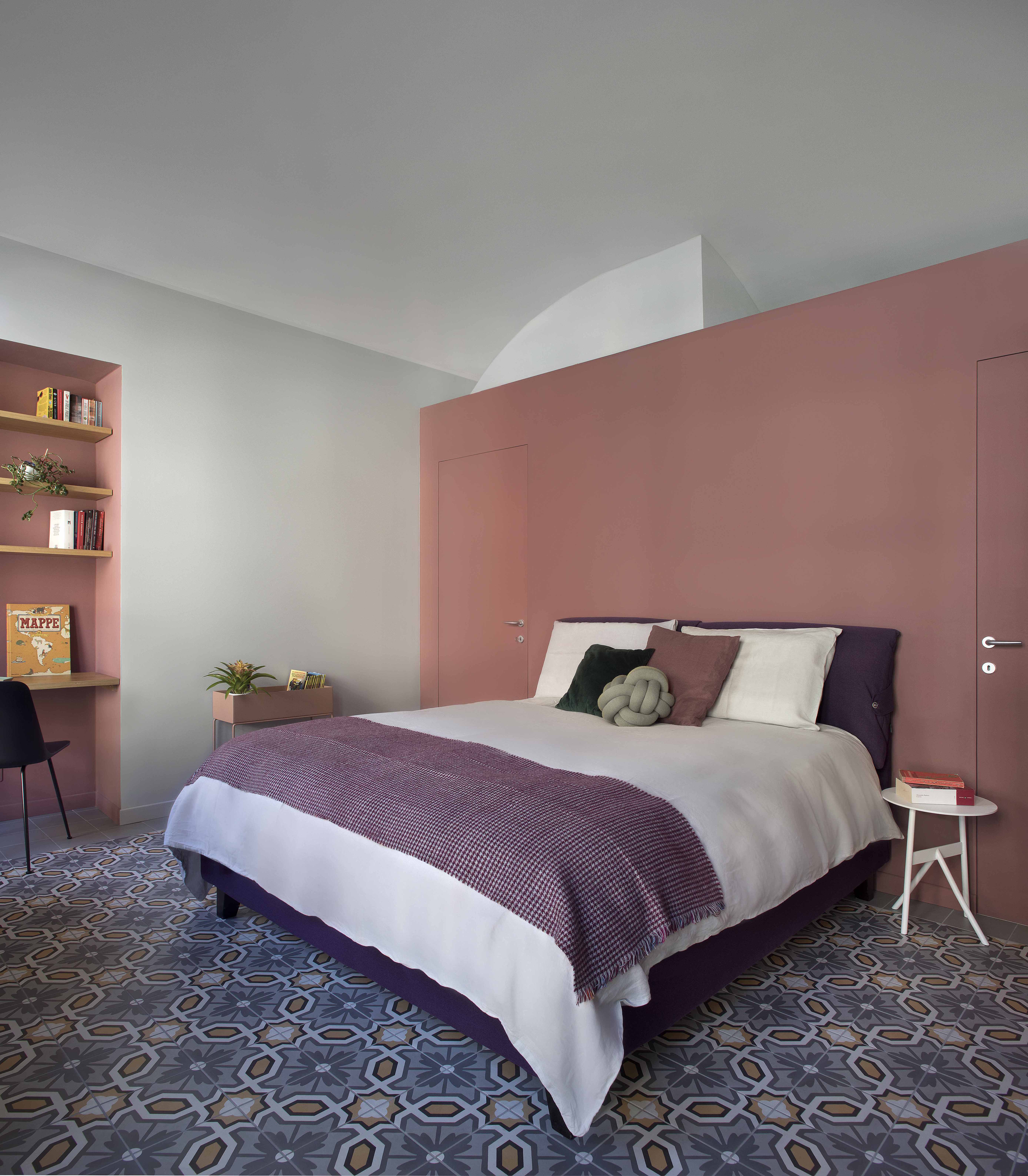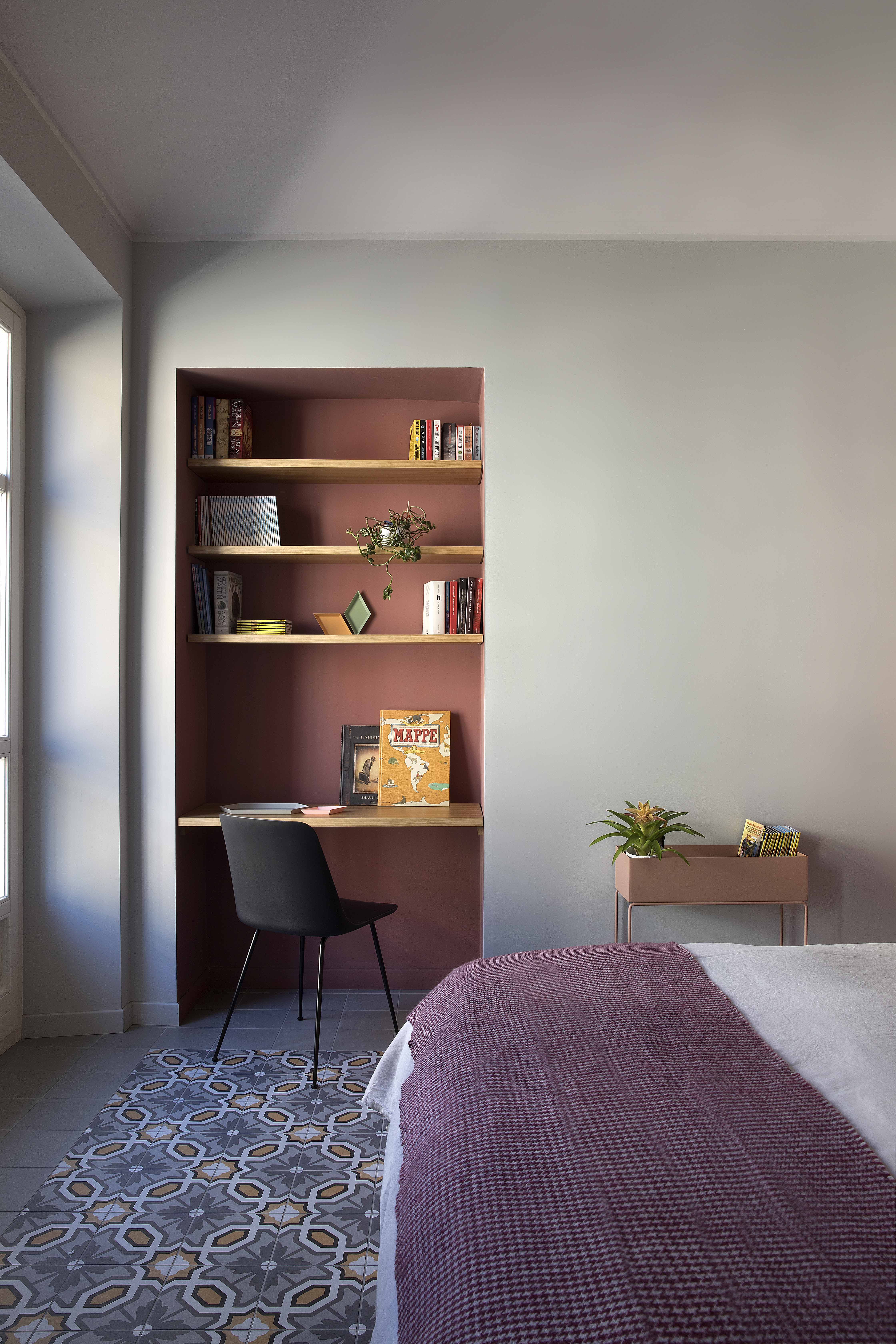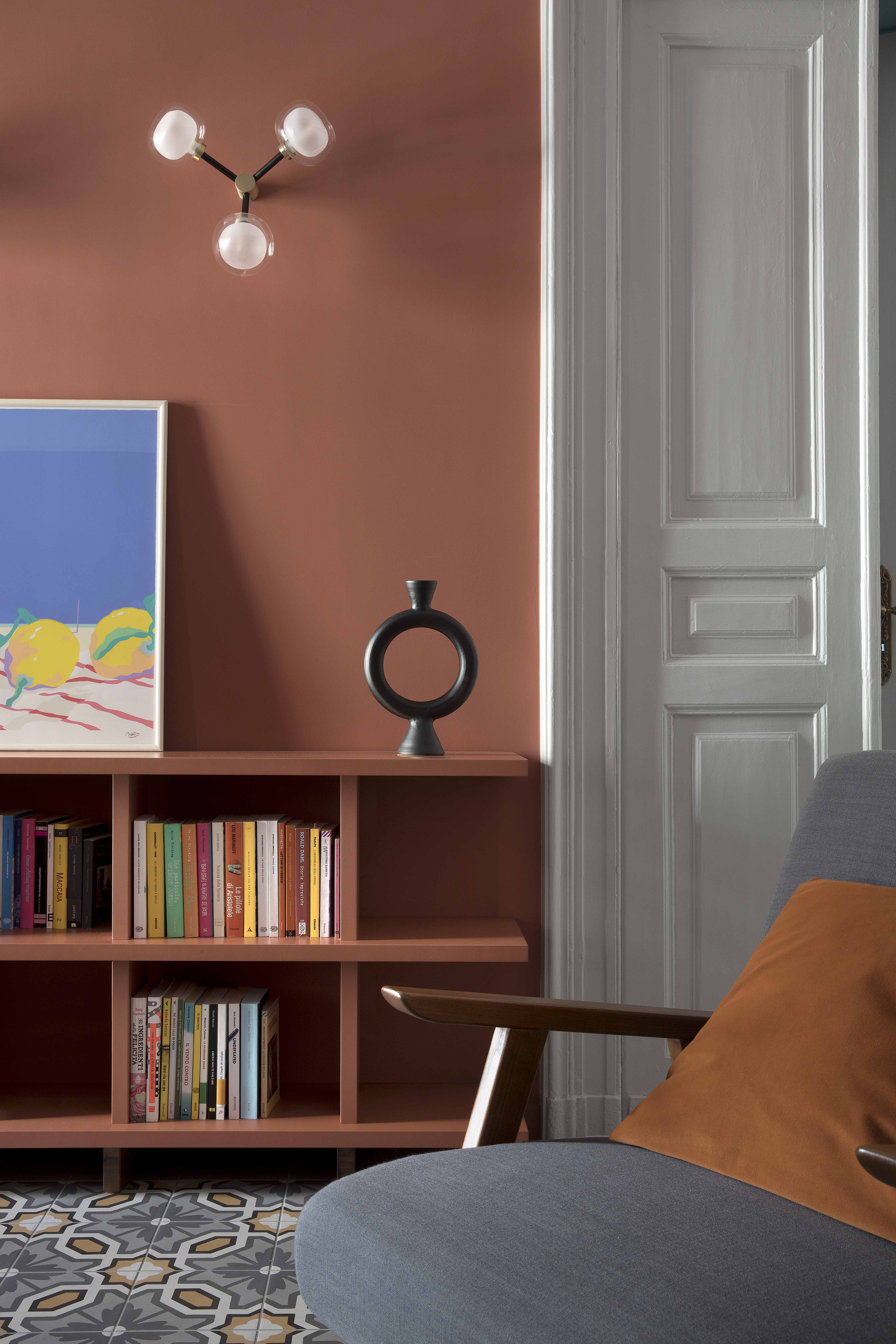 Anche la spaziosa e scenografica cucina che fa da fondale al soggiorno è stata interamente realizzata su disegno per ottimizzare lo sfruttamento di una nicchia in cui è stato inserito il blocco dei grandi elettrodomestici, nonché per sfruttare le due pareti libere della camera. Vani a giorno a vani pensili chiusi dal caldo color marsala si alternano, dando così ritmo e leggerezza alla grande cucina angolare. Il rimando cromatico tra le pareti e la libreria del soggiorno e la cucina è volutamente studiato per dare a questi due ambienti una prospettiva di reciprocità.  Tra i due ambienti si alternano i toni del petrolio dei muri e dei verdi del velluto del divano a quelli terracotta (tuscan red N:140 di Little Greene) e dei grigi. Agli arredi su misura si accostano elementi del design nordico dalle sedie ai coffee table (Normann Copenhagen, &tradition, Muuto, Norr 11, Ferm Living). Anche nella camera padronale con pochi elementi di arredo su misura in legno è stata ricavata una intima e comoda postazione studio in nicchia.