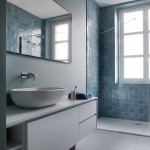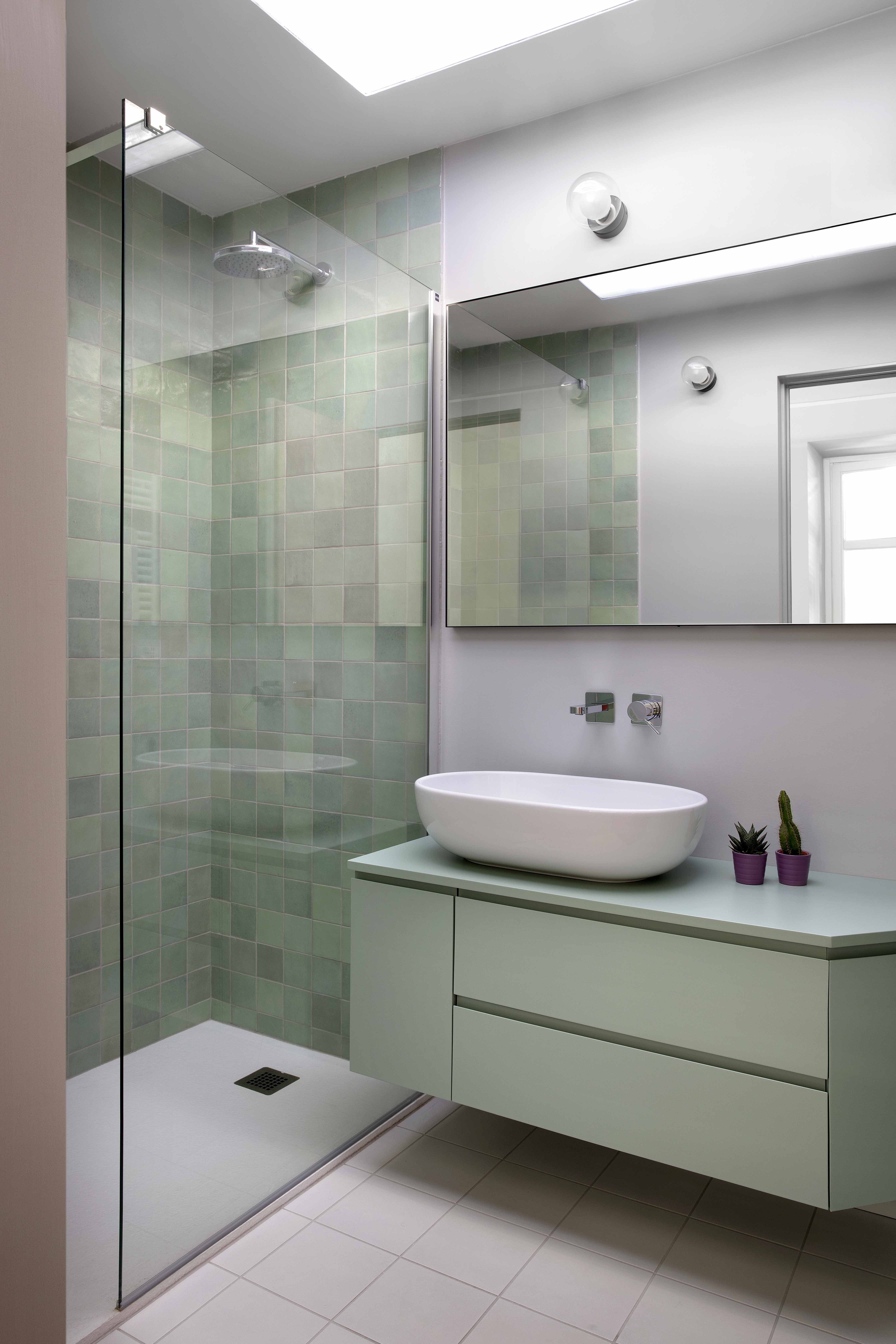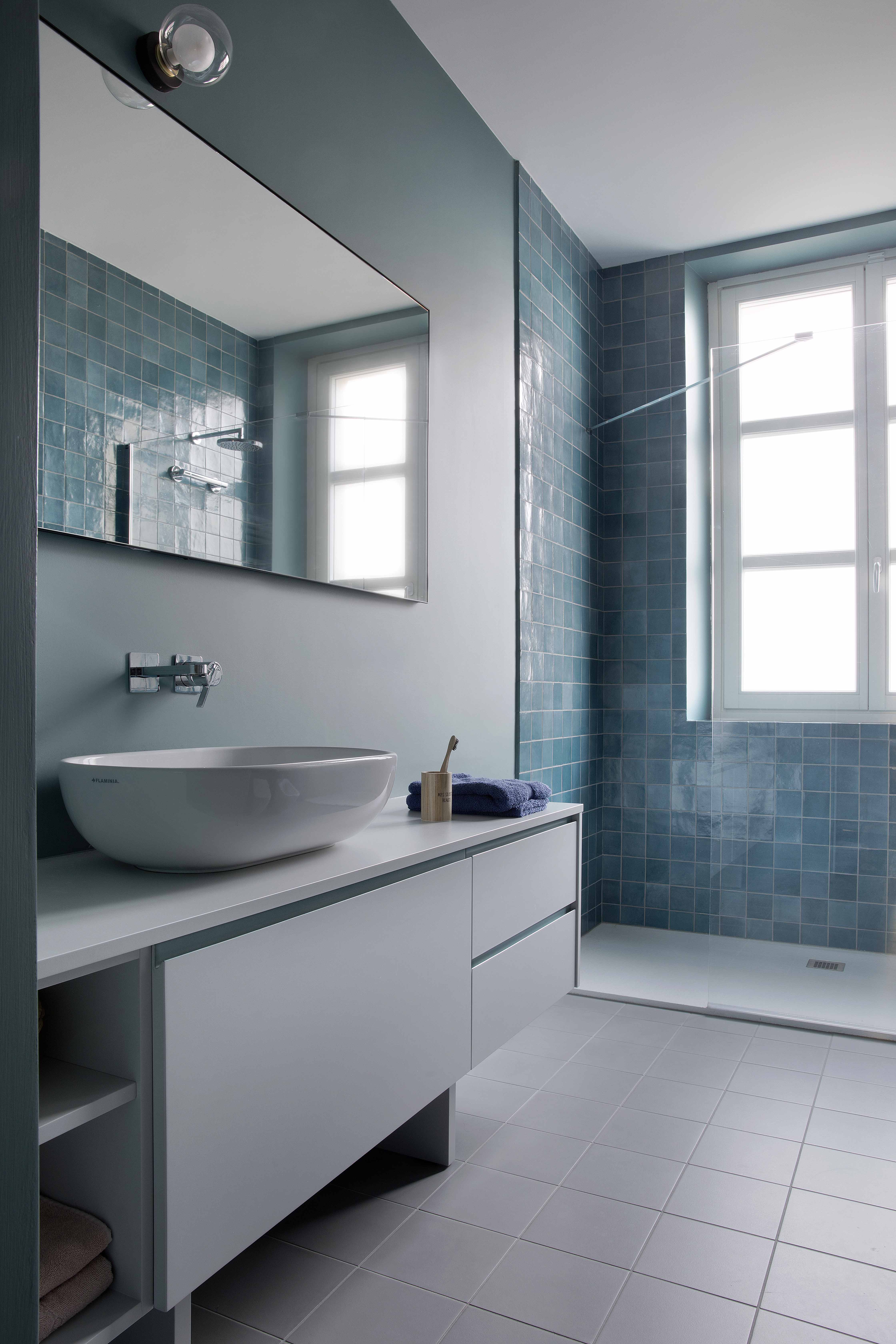 Entrambi i bagni hanno ampi box doccia interamente rivestiti con le lucide e vibranti ceramiche smaltate della serie Zellige di Marazzi, nelle due varianti cromatiche del turchese e del petrolio ai cui colori si rifanno i mobili realizzati anch’essi su disegno.
