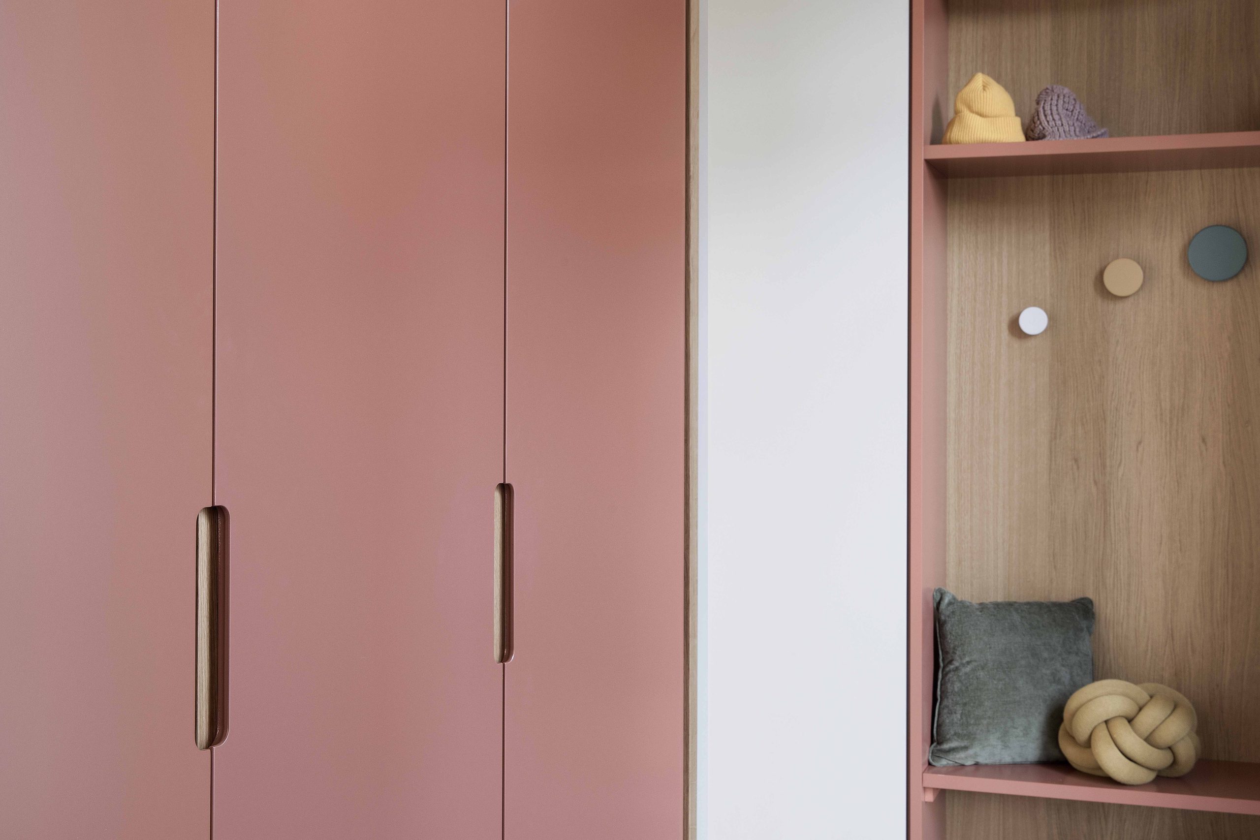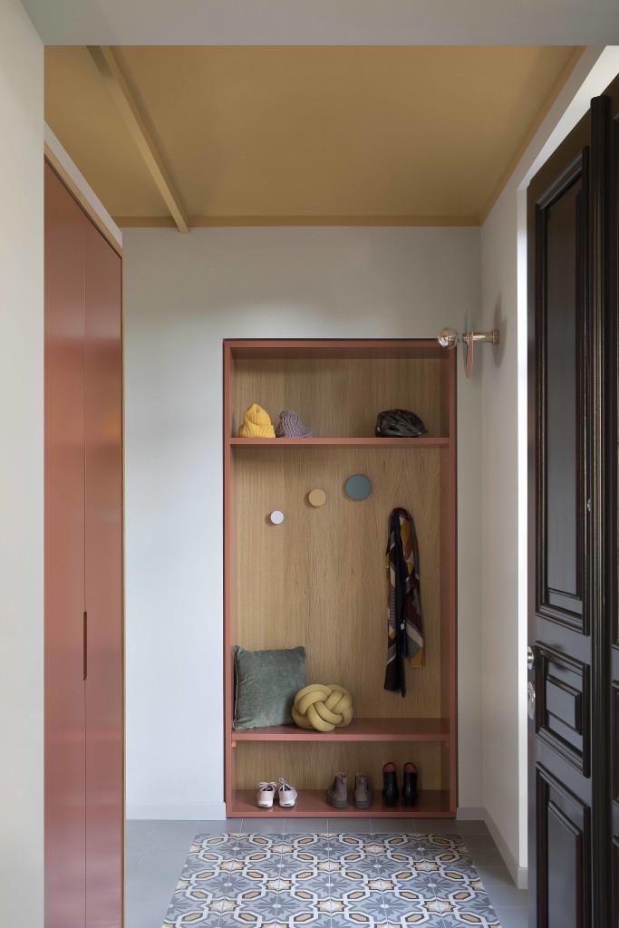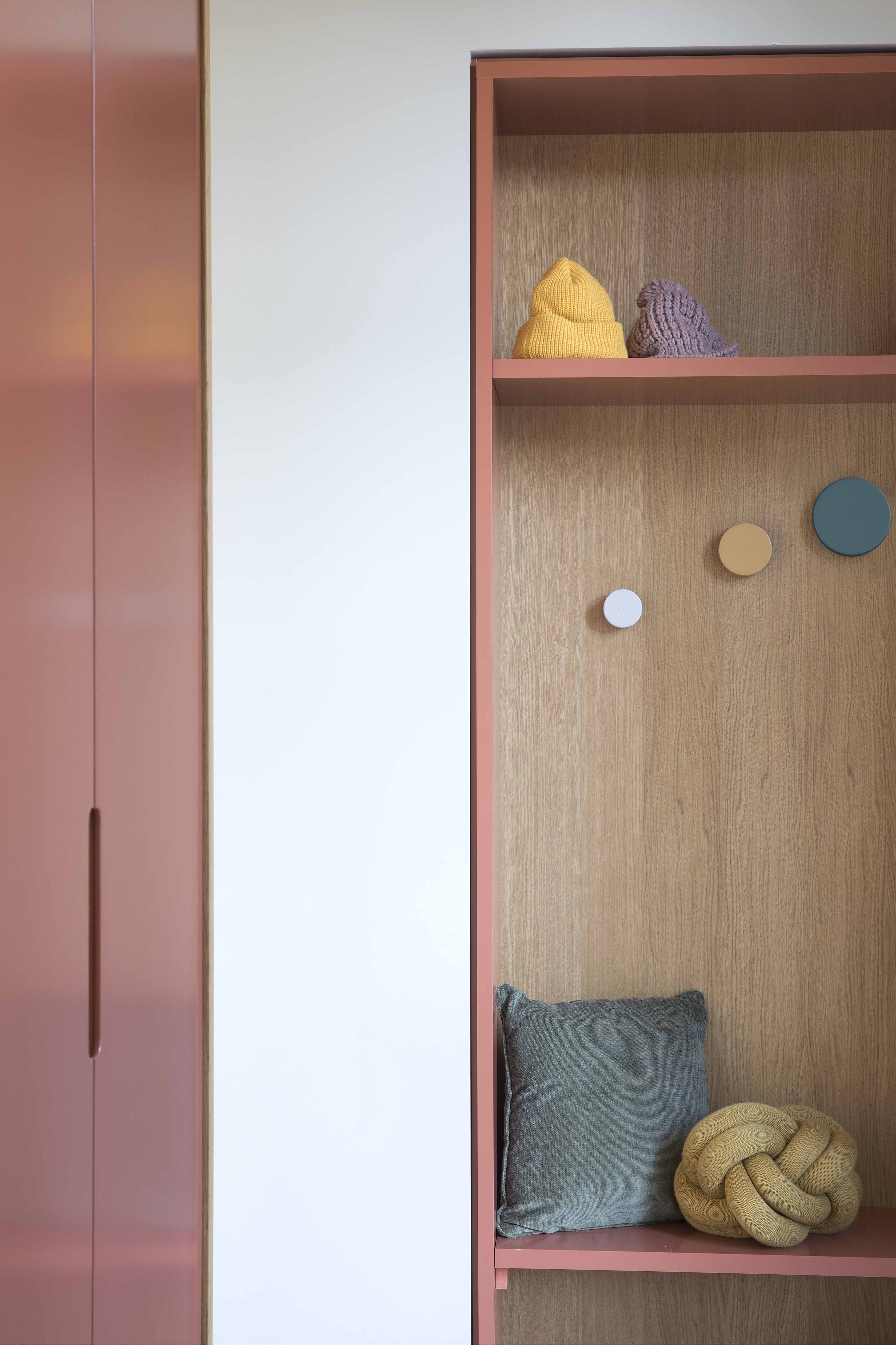 Il progetto di interior-design è caratterizzato da un’estetica contemporanea di ispirazione nordica dai colori caldi e vivaci che ha coinvolto un gran numero elementi di arredo su misura come: il guardaroba e il mobile panchetta appendi abiti che fa da sfondo all’ingresso/vestibolo o le armadiature che nascondo la zona dei servizi.