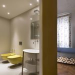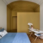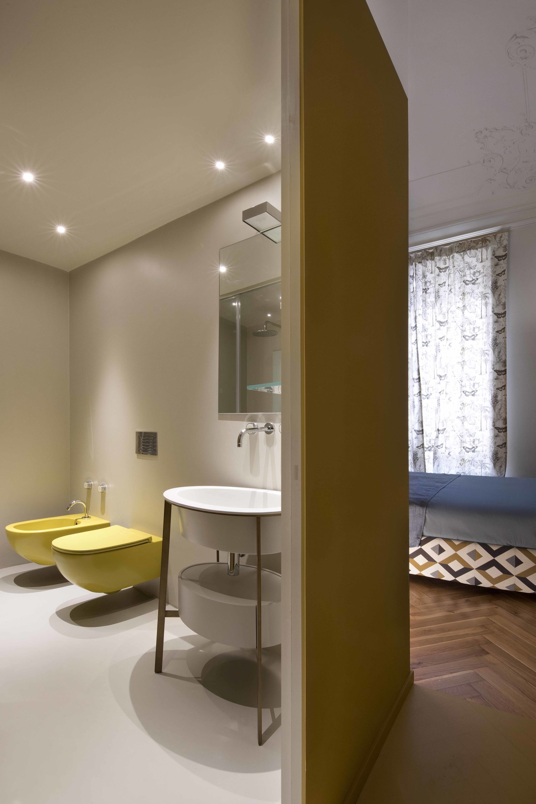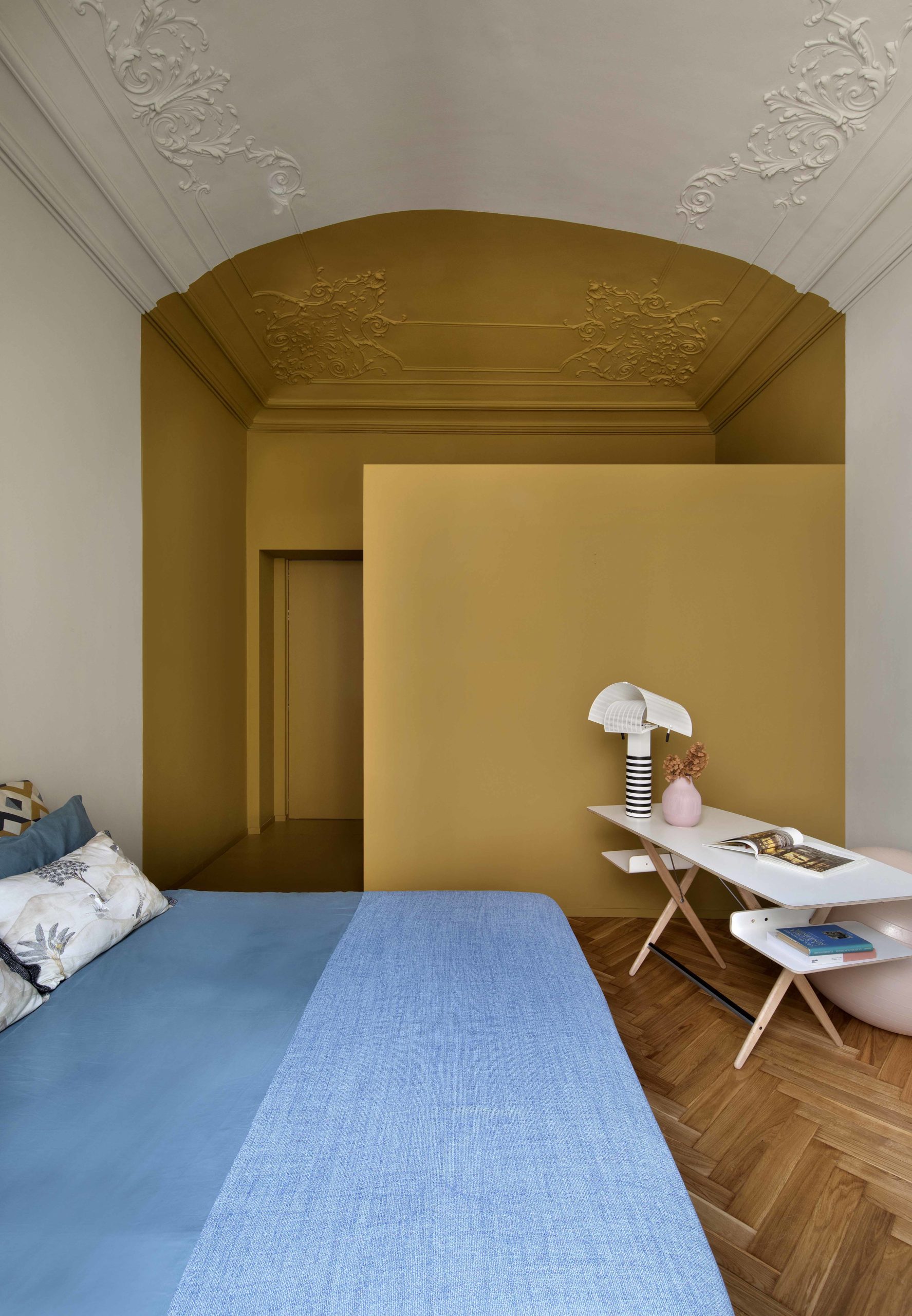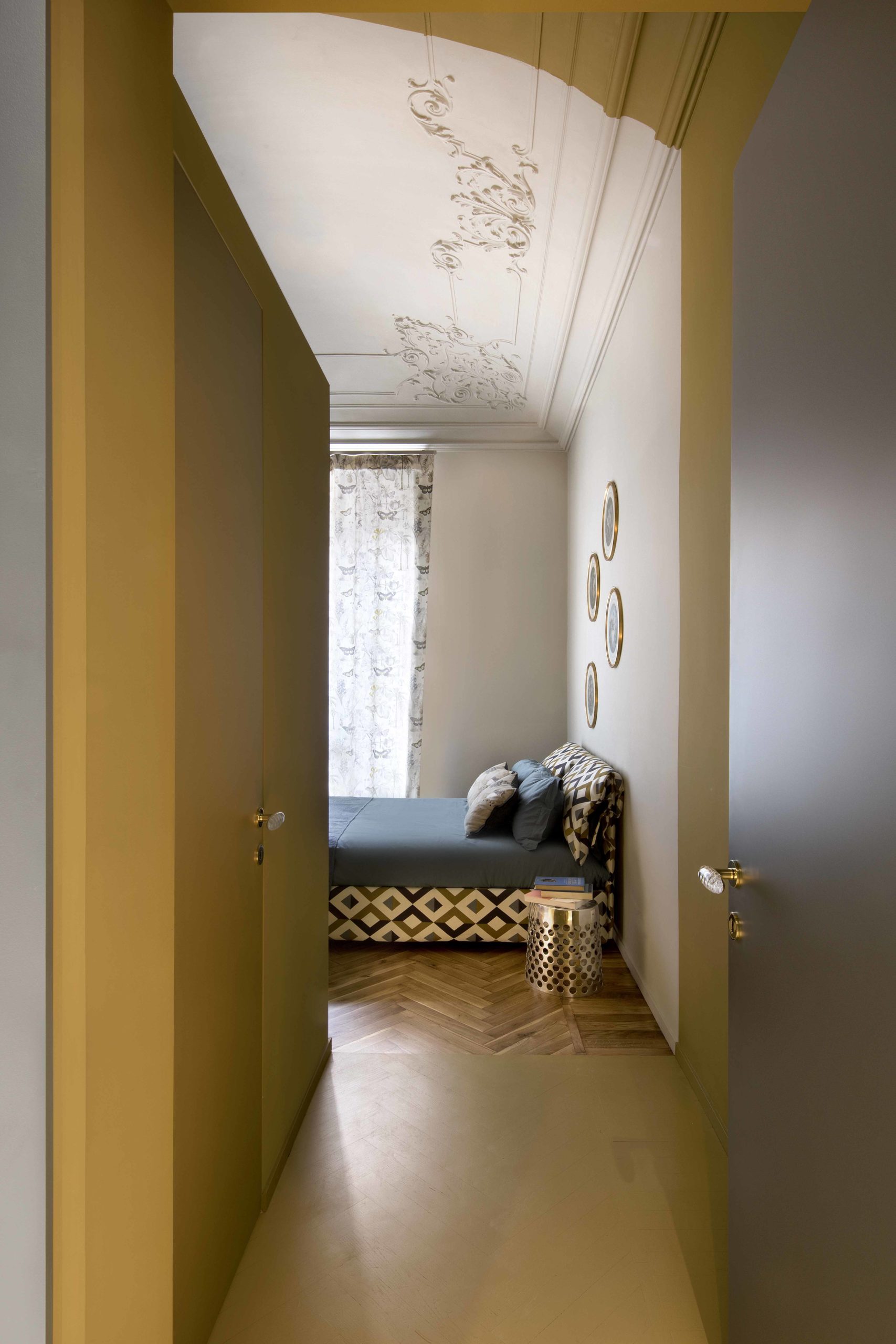 Il volume del bagno è stato ricavato come volume ribassato all’interno del volume della nuova camera da letto, coperta da una ricca volta in stucco. Questa intersezione di volumi e funzioni è stata enfatizzata dall’uso del color senape che ricopre muri, soffitto e pavimento in legno, come a dichiarare in maniera ancora una volta audace e pop l’intervento contemporaneo nella scatola d’epoca.