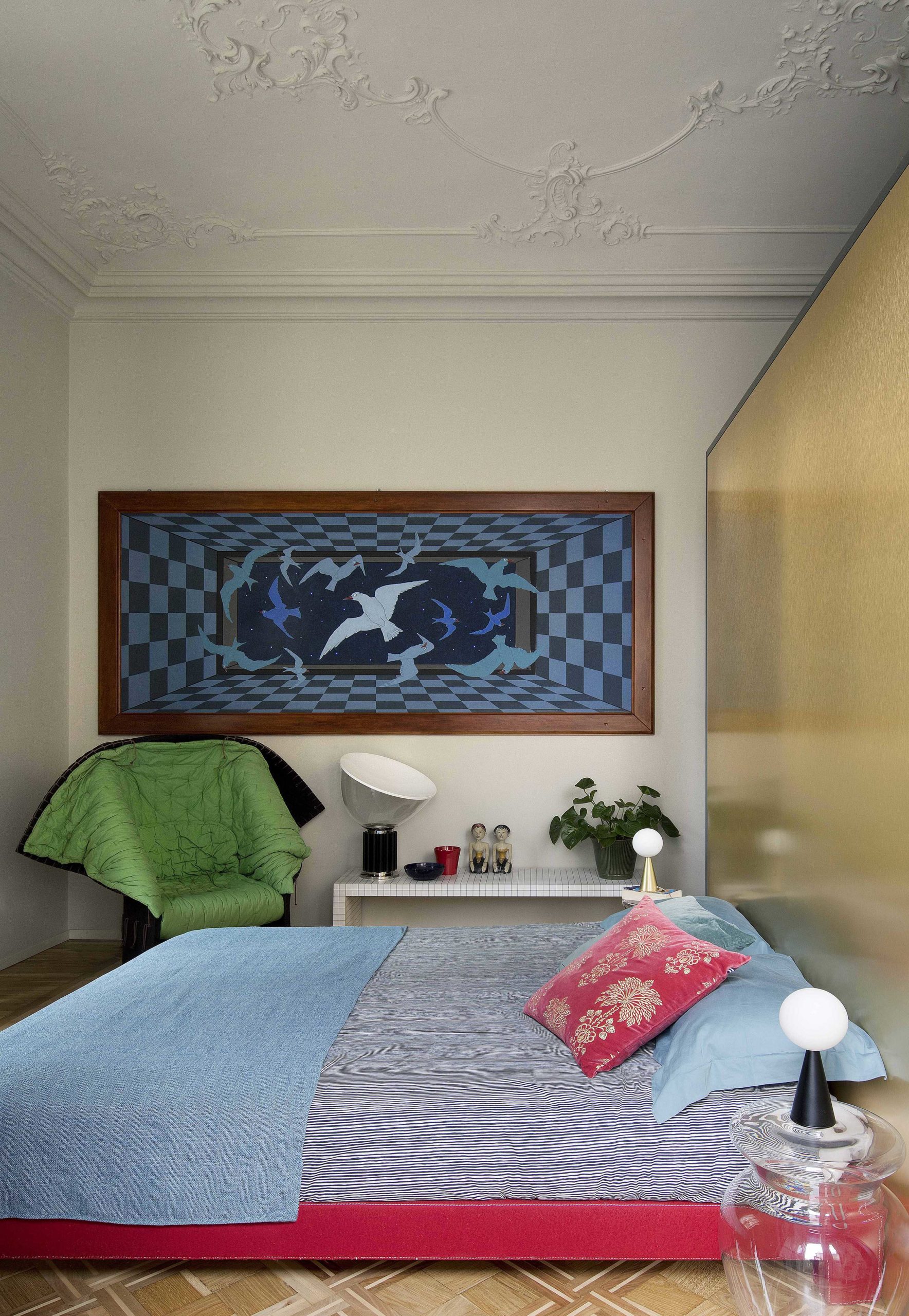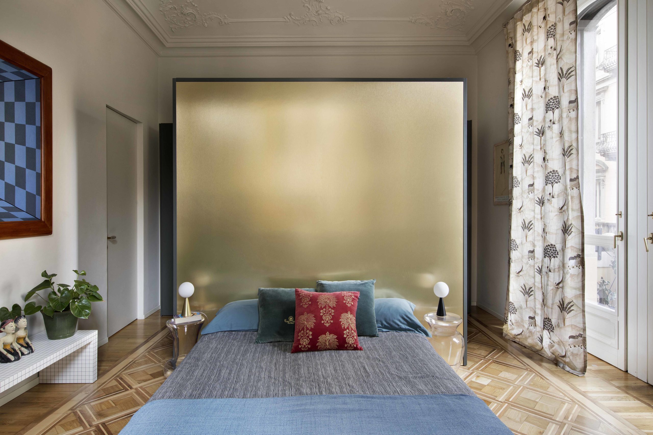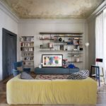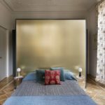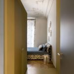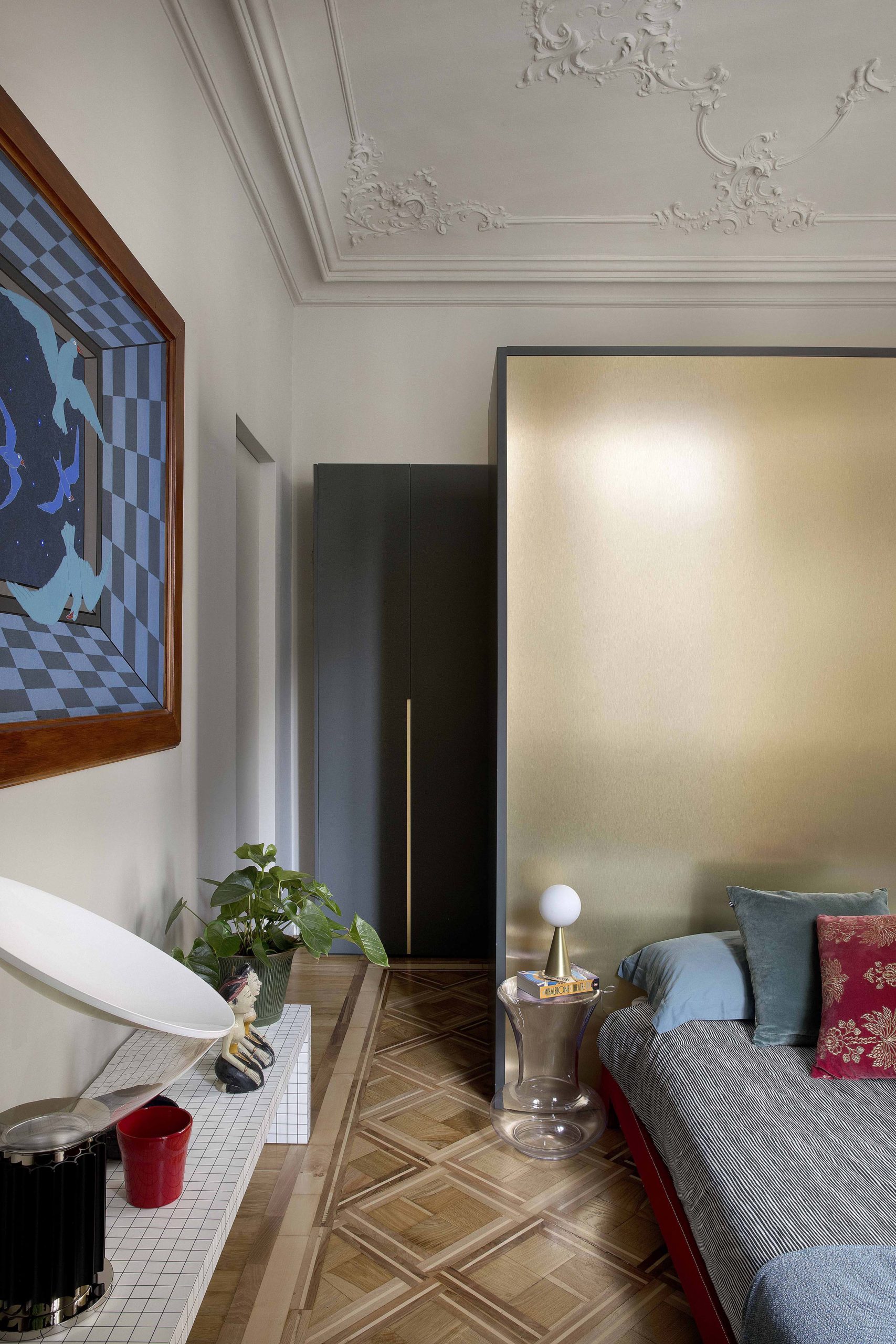 Il volume del bagno è stato ricavato come volume ribassato all’interno del volume della nuova camera da letto, coperta da una ricca volta in stucco. Questa intersezione di volumi e funzioni è stata enfatizzata dall’uso del color senape che ricopre muri, soffitto e pavimento in legno, come a dichiarare in maniera ancora una volta audace e pop l’intervento contemporaneo nella scatola d’epoca.
