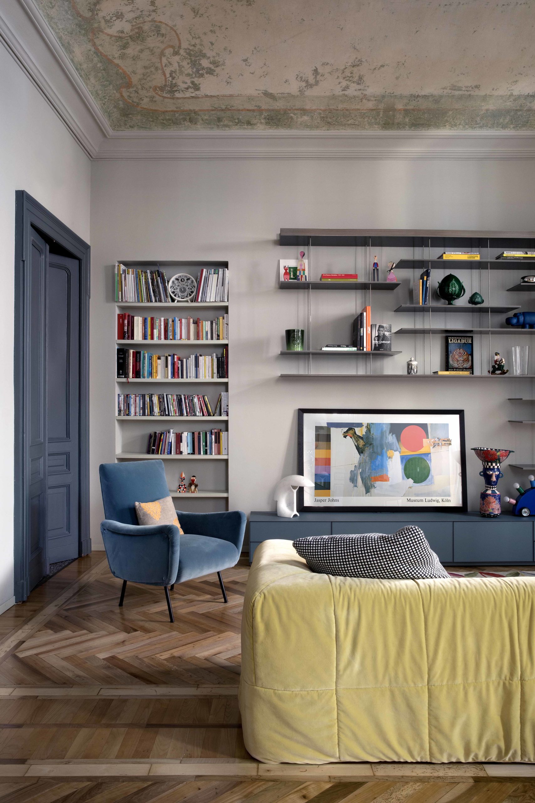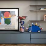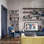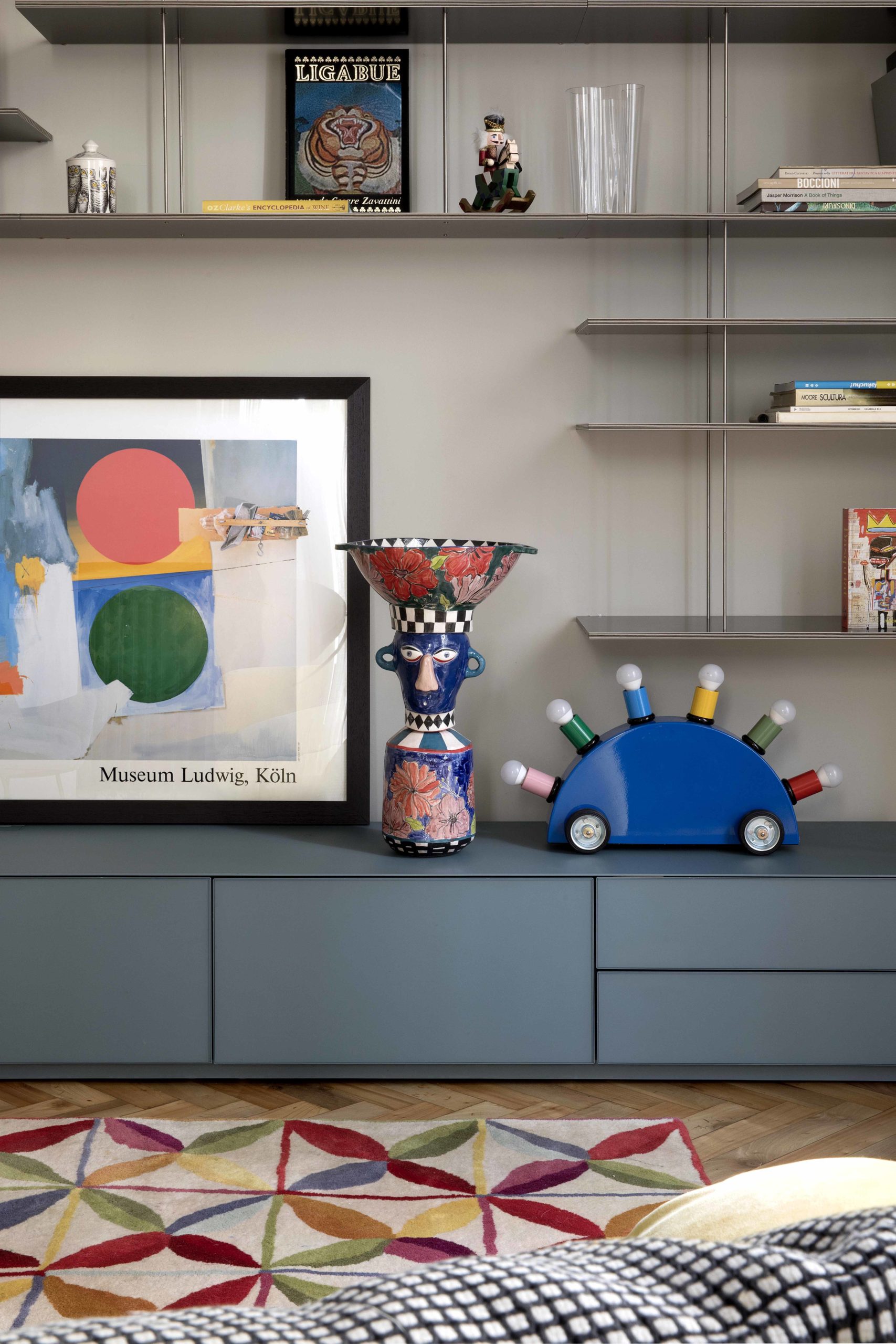 Il tema degli arredi è stato un continuo lavoro di confronto con i clienti, che essendo collezionisti, avevano a disposizione molti pezzi iconici del design italiano da ricollocare e integrare, tra questi il divano (che è stato rifoderato), il tavolo e le sedie, il letto della camera matrimoniale ecc. Ad essi abbiamo accostato nuovi arredi di serie come la libreria e il mobile tv e alcuni pezzi di famiglia restaurati come la cassettiera del soggiorno e le due poltroncine anni 50’ in velluto blu.