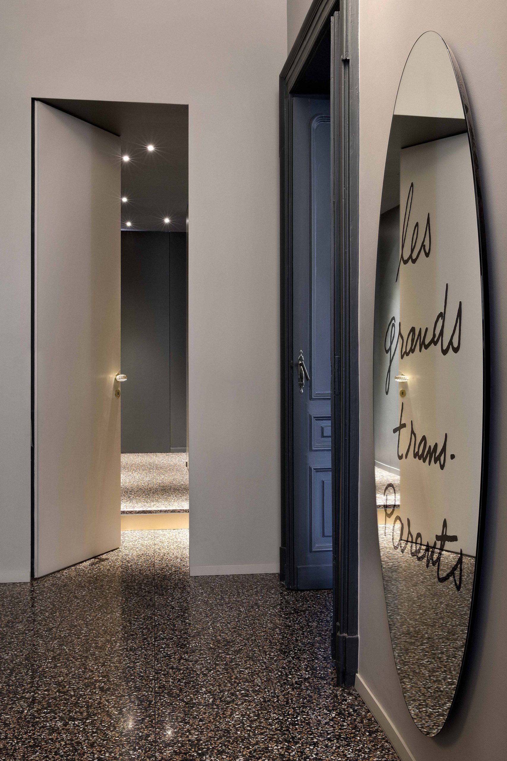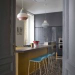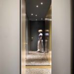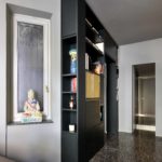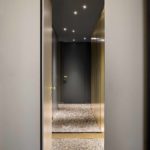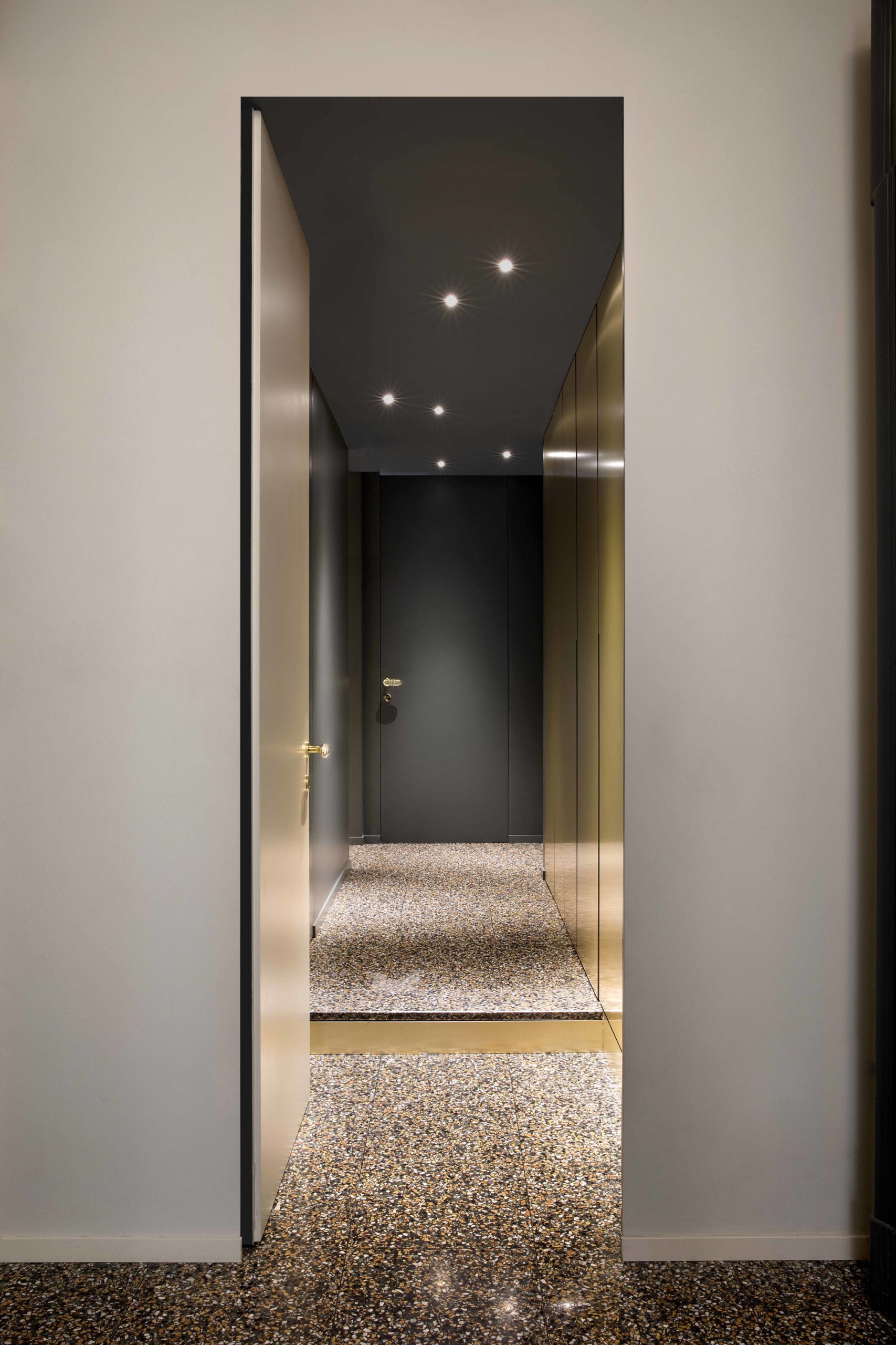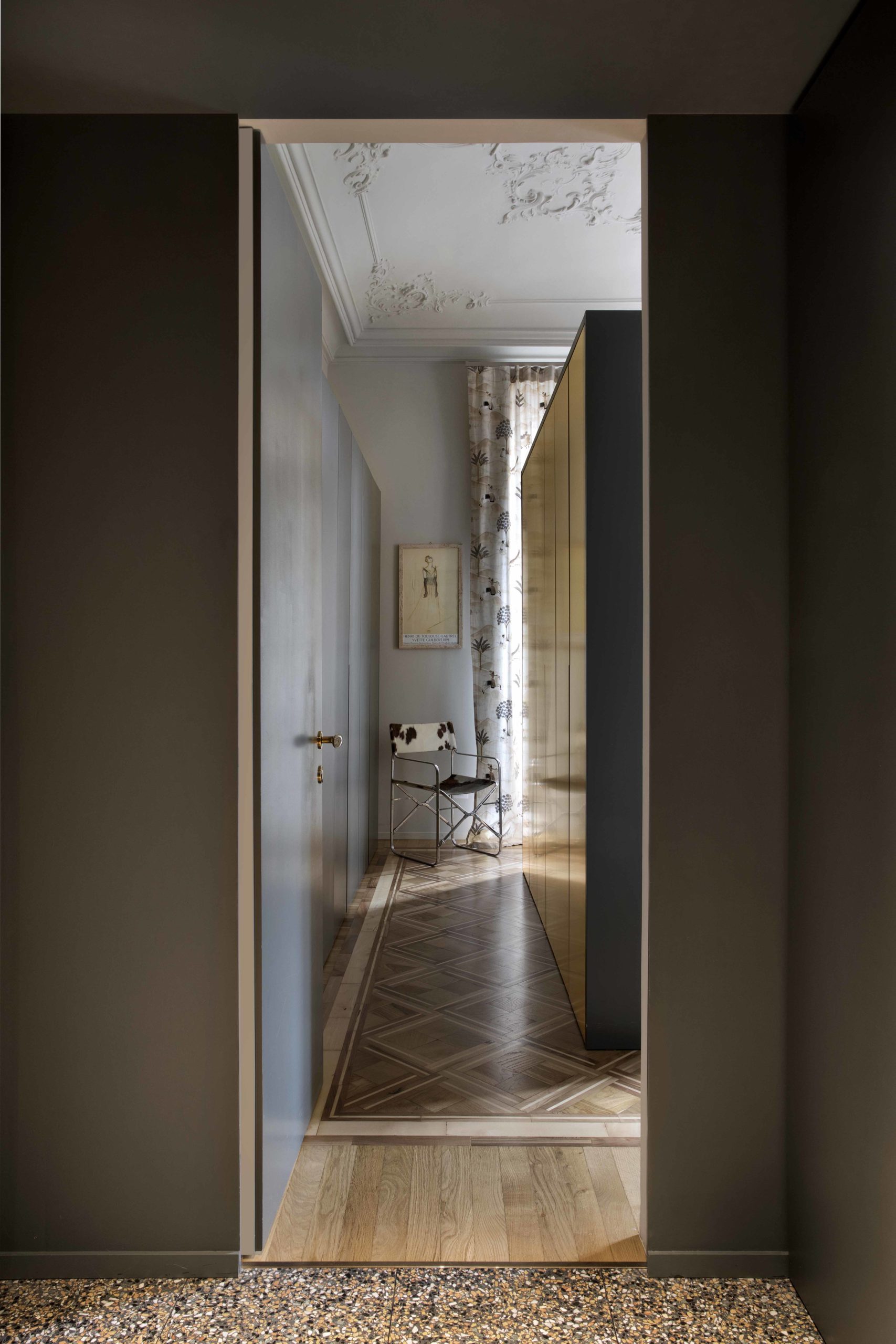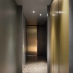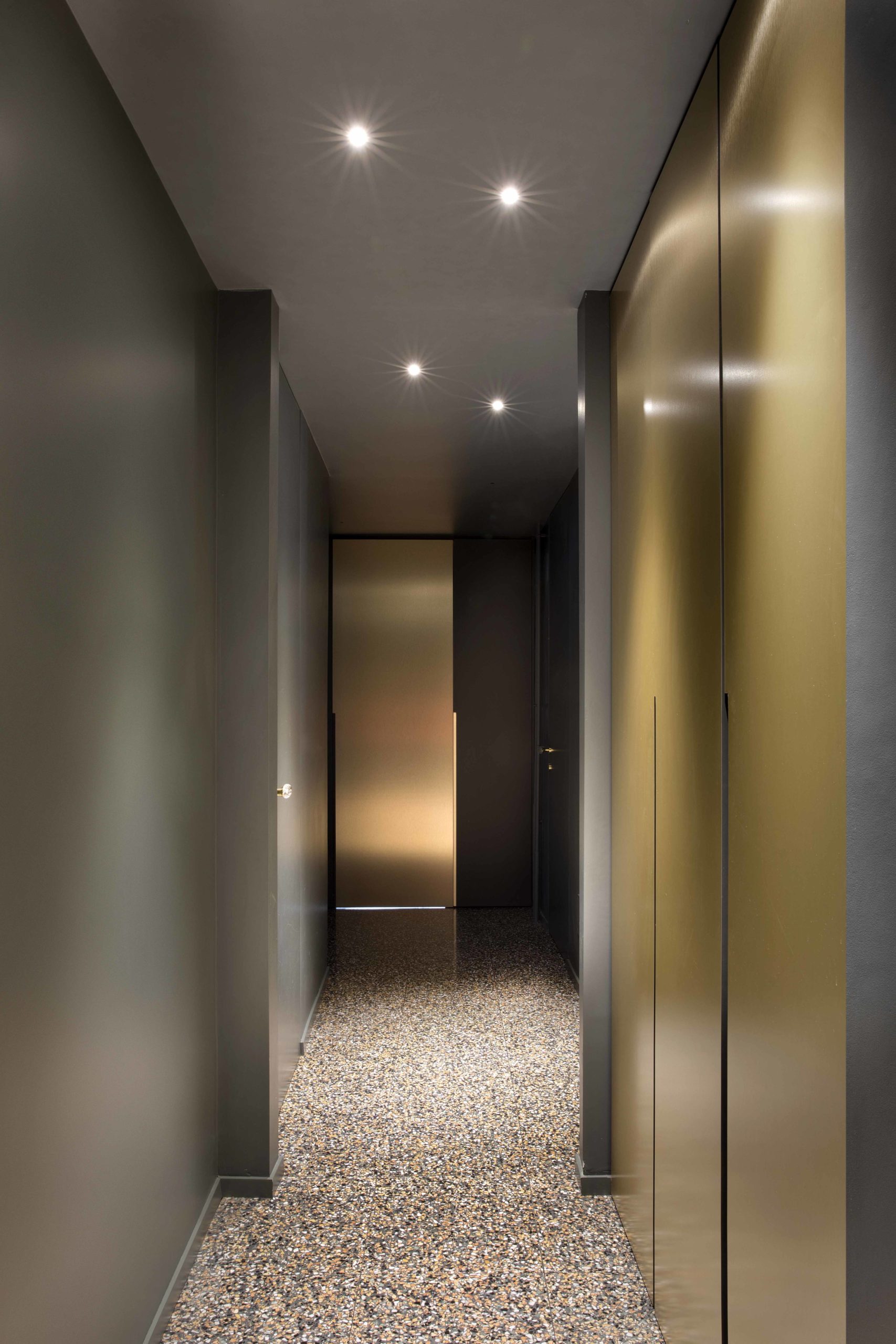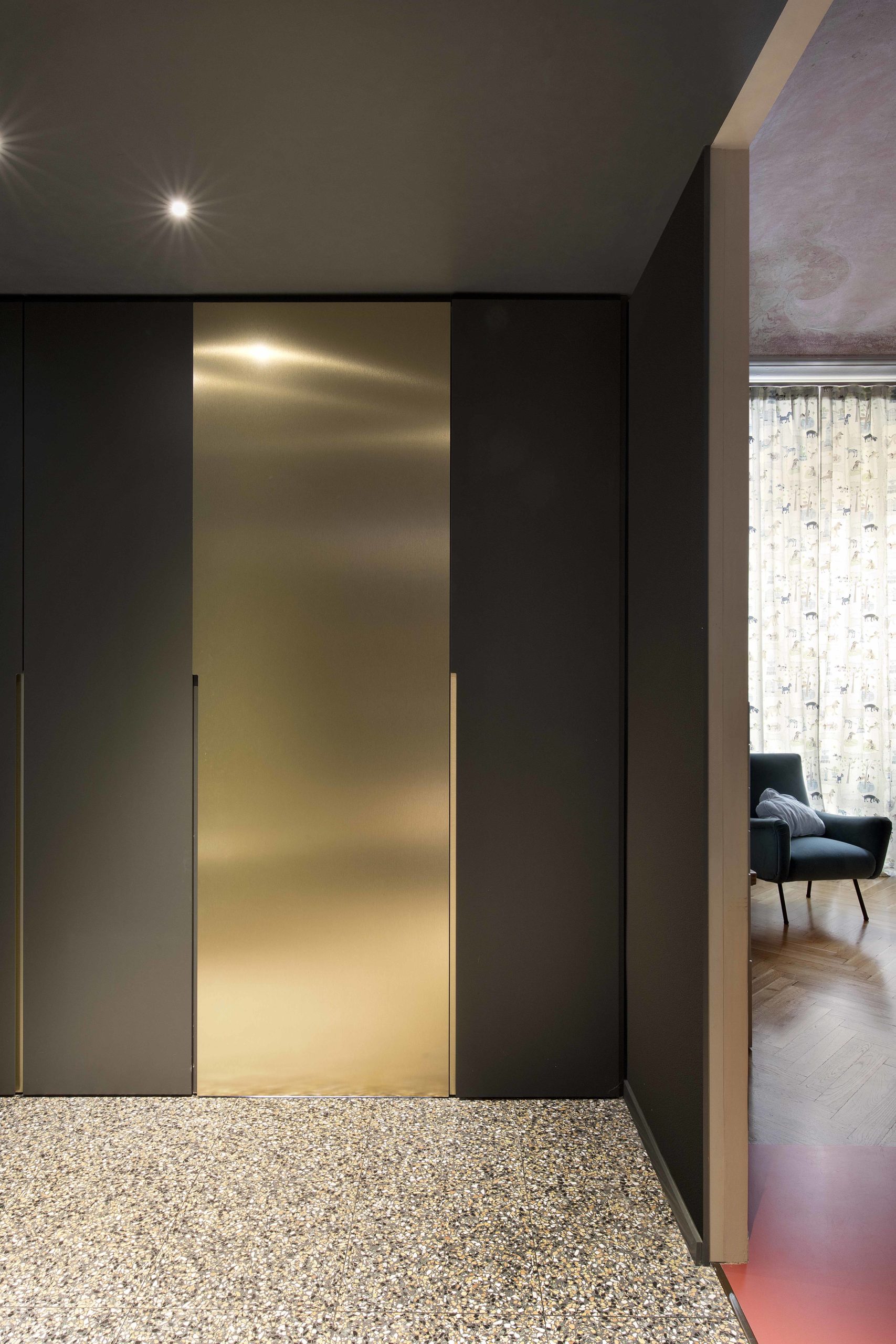 Per quanto riguarda le scelte cromatiche in casa si rincorrono i grigi declinati in una scala di diverse intensità alternati a elementi più luminosi dati o dagli arredi di serie o dalla lamina d’ottone degli arredi disegnati su misura. Anche queste scelte derivano da un lavoro di condivisione con la proprietà, che in alcuni casi ha portato a scelte “audaci”, come nel caso del corridoio, che nella nuova distribuzione ha una dimensione piuttosto ridotta, si è voluto giocare sul concetto quasi giocoso di “antro oscuro”.