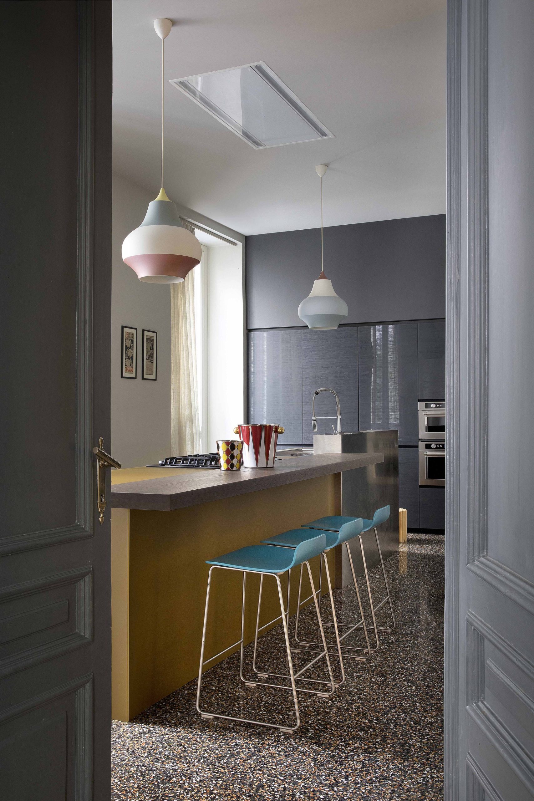 Tra questi in soggiorno e ingresso Le Appliques Foil di Davide Groppi, le Piantane Sampei di Davide Groppi ai lati del tavolo, l’iconica Fortuny di Pallucco ai lati del divano angolare tra le due finestre e la lampada da terra AJ di Louis Poulsen (col. Rossa) al lato del sofà ocra. Ad illuminare l’isola della cucina le lampade Cirque di Louis Poulsen (col. Giallo e rame). In corridoio i Faretti Nulla di Davide Groppi – corridoio. Nei bagni di servizio la lampada Toast di Davide Groppi. In una delle due camere bimbo, a parete l’onirica Nuvola di Nemo Lighting. Nella seconda camera bimbo la lampada Imu di Davide Groppi.