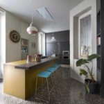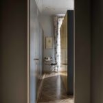 Per i nuovi pavimenti invece la scelta è ricaduta sull’utilizzo di un seminato a base scura, una scelta forte e contemporanea, che però ben si adatta alle case d’epoca, dove in origine, il seminato era presente in tutte le zone di servizio/distribuzione (oltre che nelle parti comuni come in questo caso) alternate al legno nelle stanze e nei salotti. Nello specifico il nuovo pavimento in seminato riveste tutte gli spazi della casa dove non era più presente il pavimento originale, bagni compresi. Unica deroga è stata fatta per una camera da letto, dove precedentemente era stato posato un legno a correre di minimo pregio e dove si è scelto di posare a spina un legno d’epoca, smontato da un cantiere coevo alla casa che presentava la stessa essenza (rovere) e dimensione dei pavimenti esistenti.