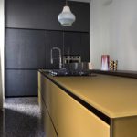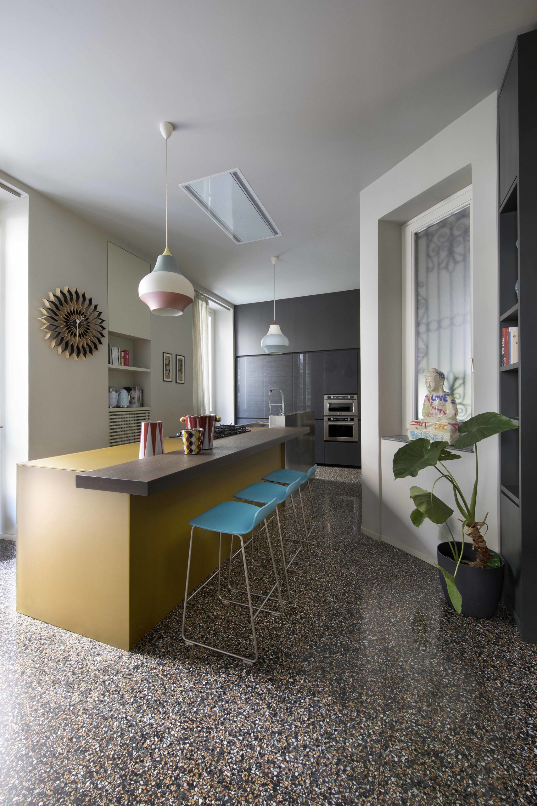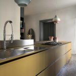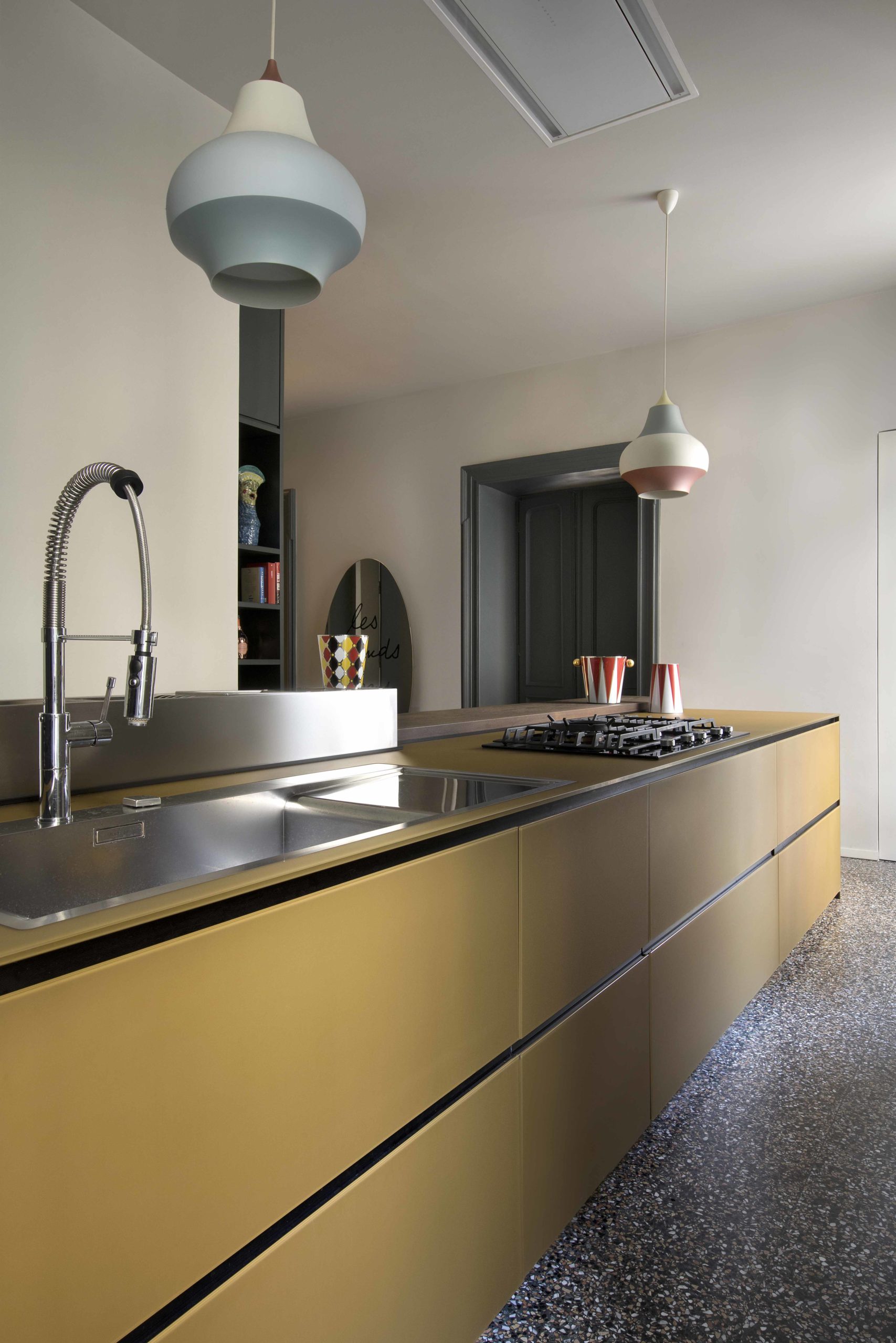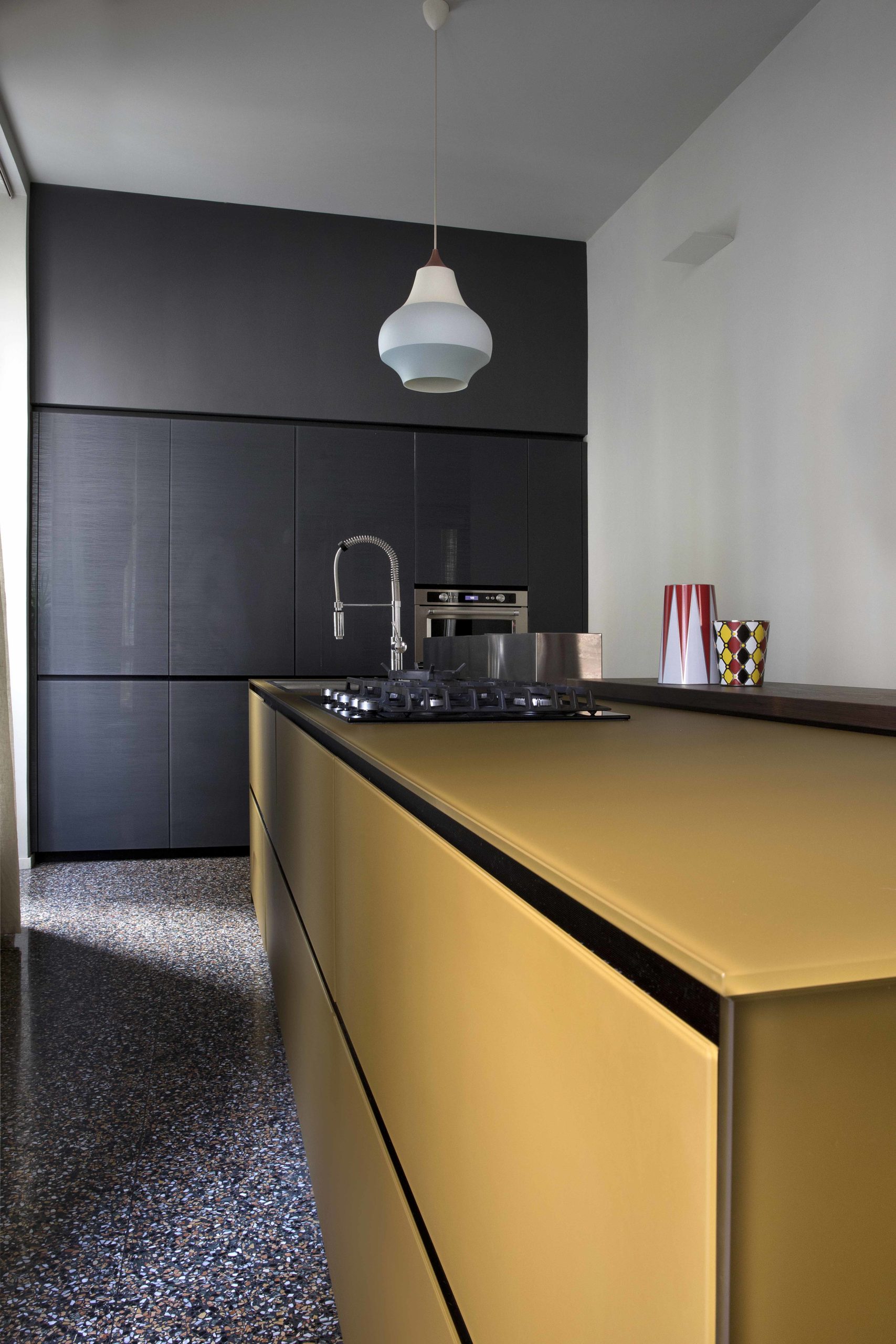 Per la cucina, nodo conviviale della casa, che si affaccia sul grande terrazzo, si è scelta una soluzione senza soluzione di continuità con l’ingresso, in essa domina una grande isola tecnica del piano lavoro e cottura della serie Artematica Vitrum di Valcucine, in vetro opaco retro-laccato, color “campo di grano” (per l’isola) e grigio cenere (per le colonne).