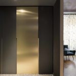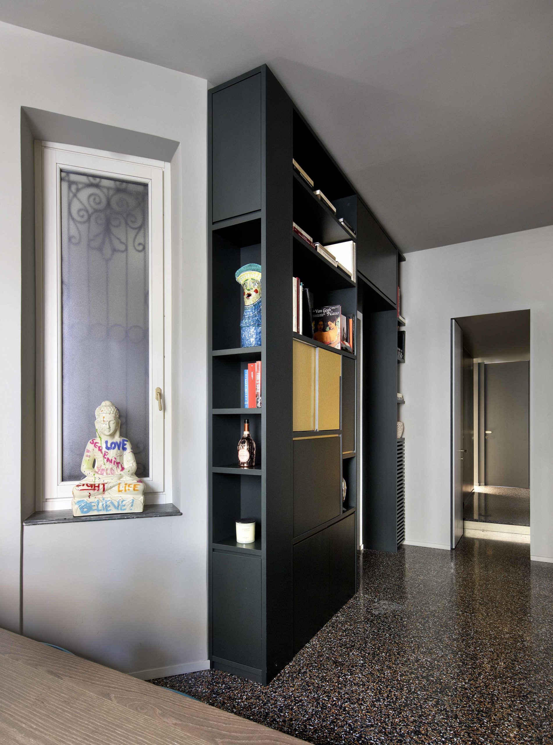 Questo tema è stato interpretato con un progetto d’arredo su misura, disegnato e fatto realizzare ad hoc, in un’alternanza di finiture in laccato opaco color grigio antracite (l’antro oscuro) e in laminato effetto ottone, che impreziosisce e illumina gli spazi di corridoio attrezzato che percorrono tutta la casa, dall’ingresso con la libreria/bussola, agli armadi contenitori che celano la porta del bagno padronale, alla camera da letto matrimoniale dove trovano spazio gli armadi della zona spogliatoio che in un concetto double face fanno anche da testiera del letto.