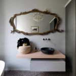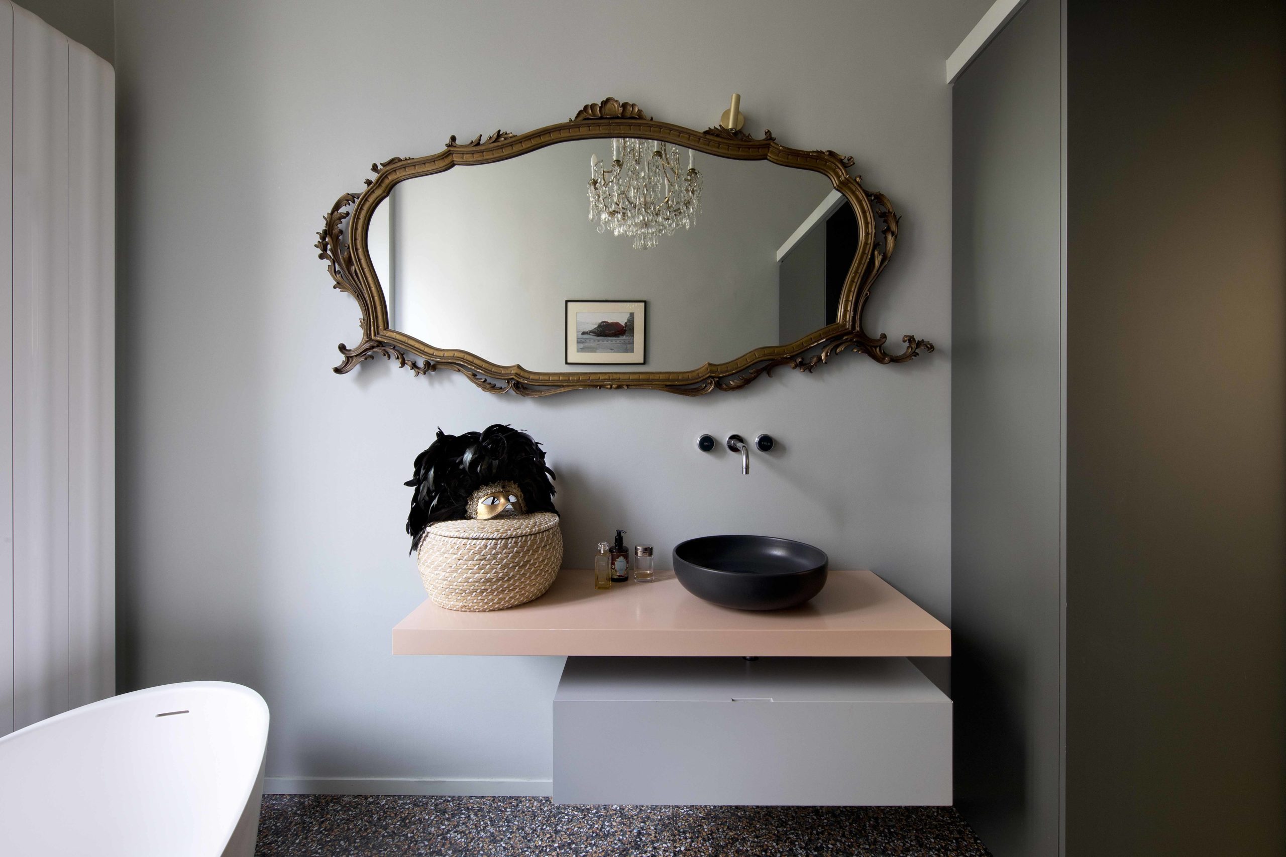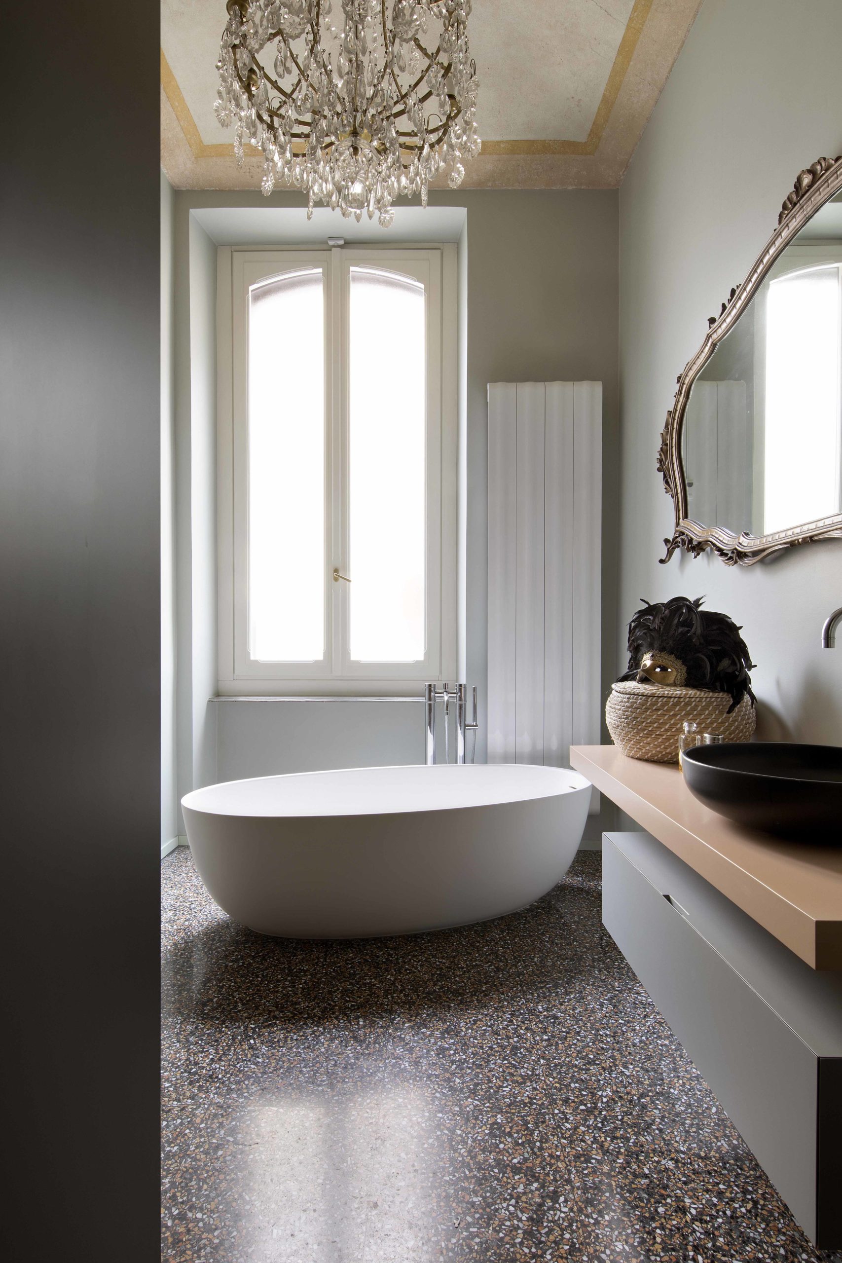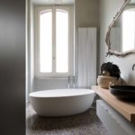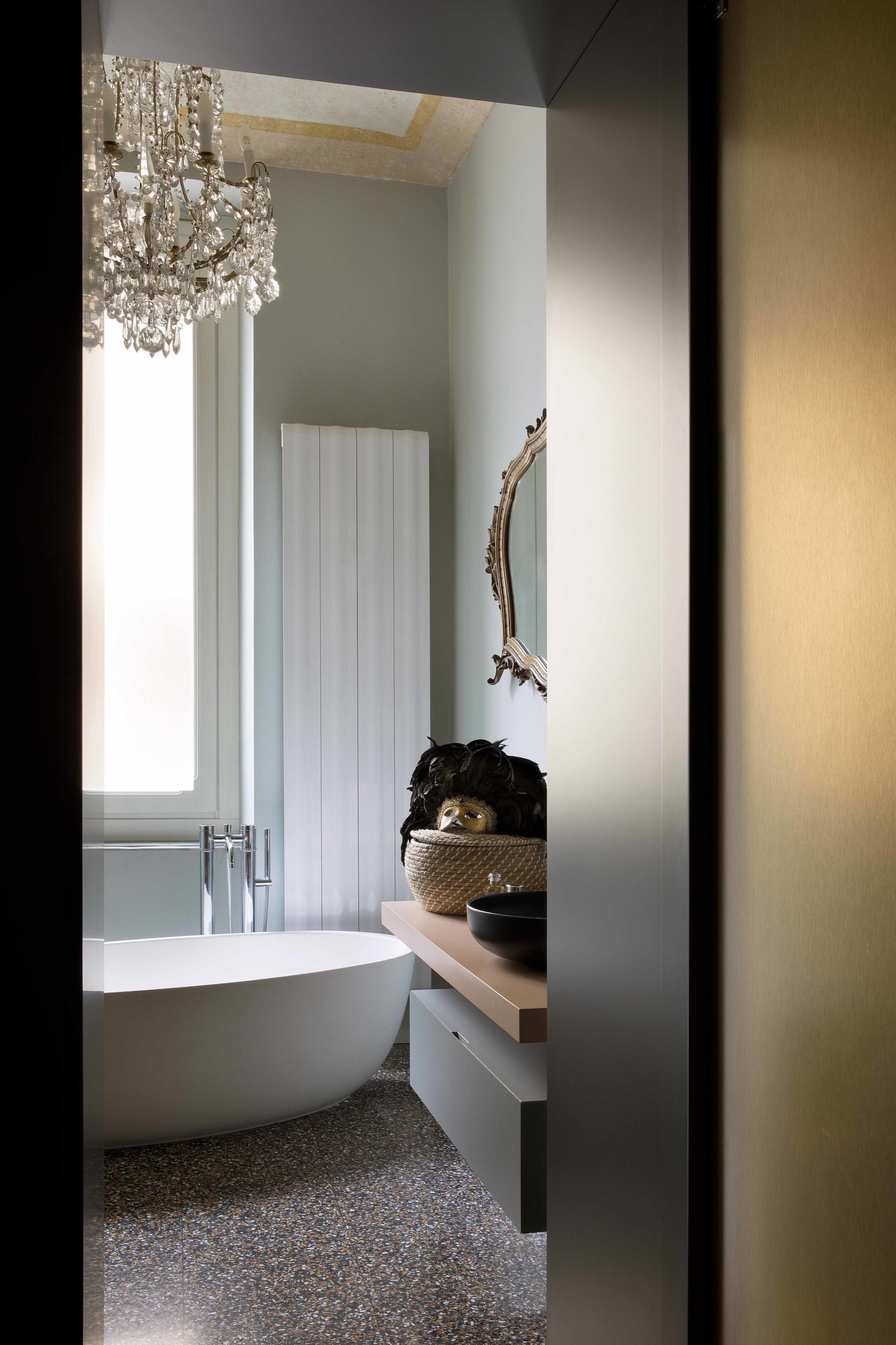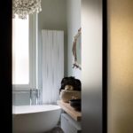 Il bagno padronale vede protagonisti, oltre la vasca free standing, anche il lampadario a chandelier in cristallo, pezzo di famiglia, restaurato per l’occasione, abbinato allo specchio antico, anch’esso appartenente alla famiglia dei proprietari.