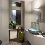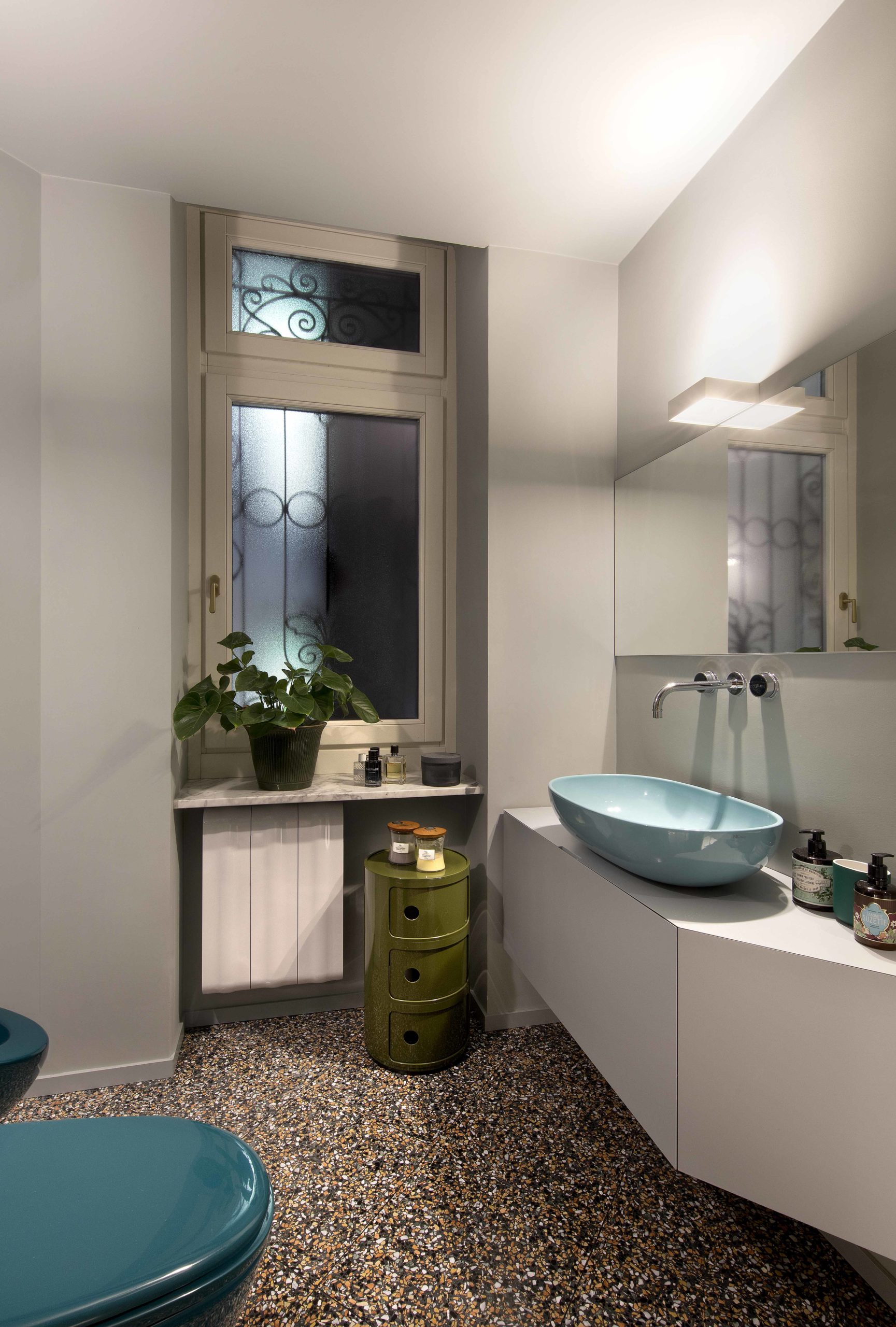 Per i bagni si è scelto di giocare sul colore, andando ad inserire sanitari dai colori vivaci (verdi/ grigio/ senape) a cui si abbinano i mobili lavabo progettati e realizzati, anch’essi, su misura nei toni che nel caso del bagno padronale, riprendono quelli di soffitti e pareti.