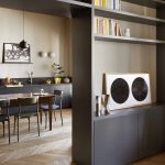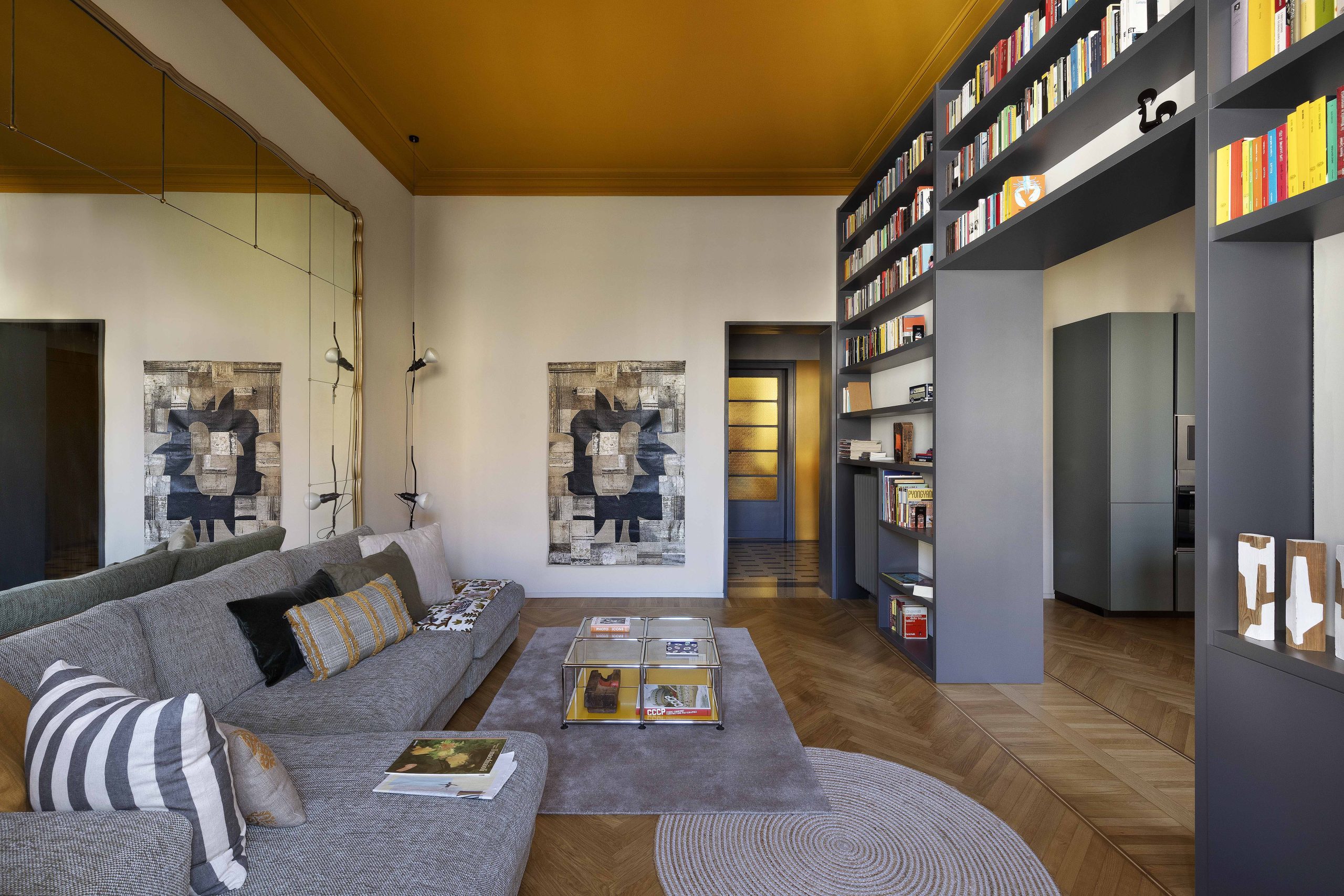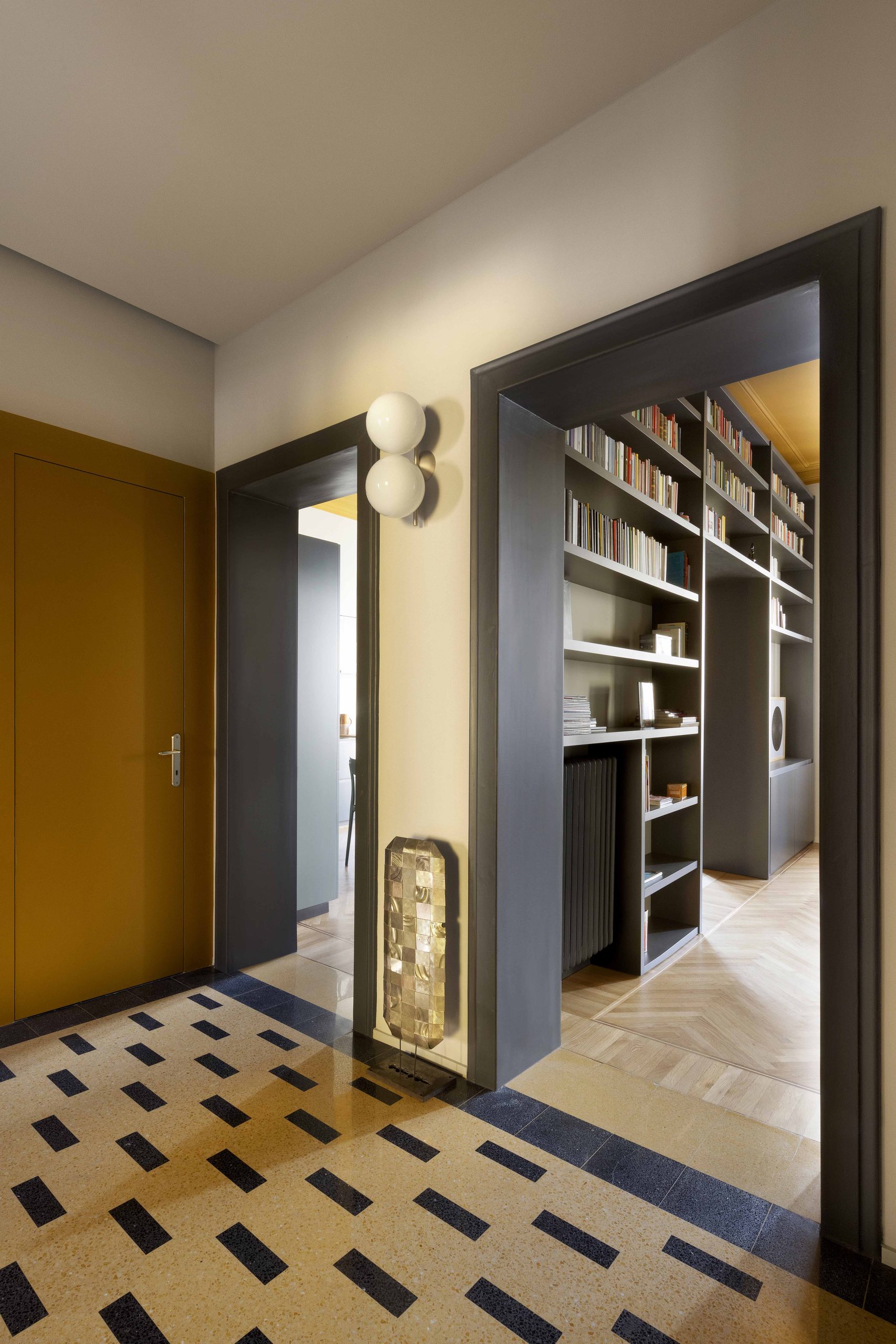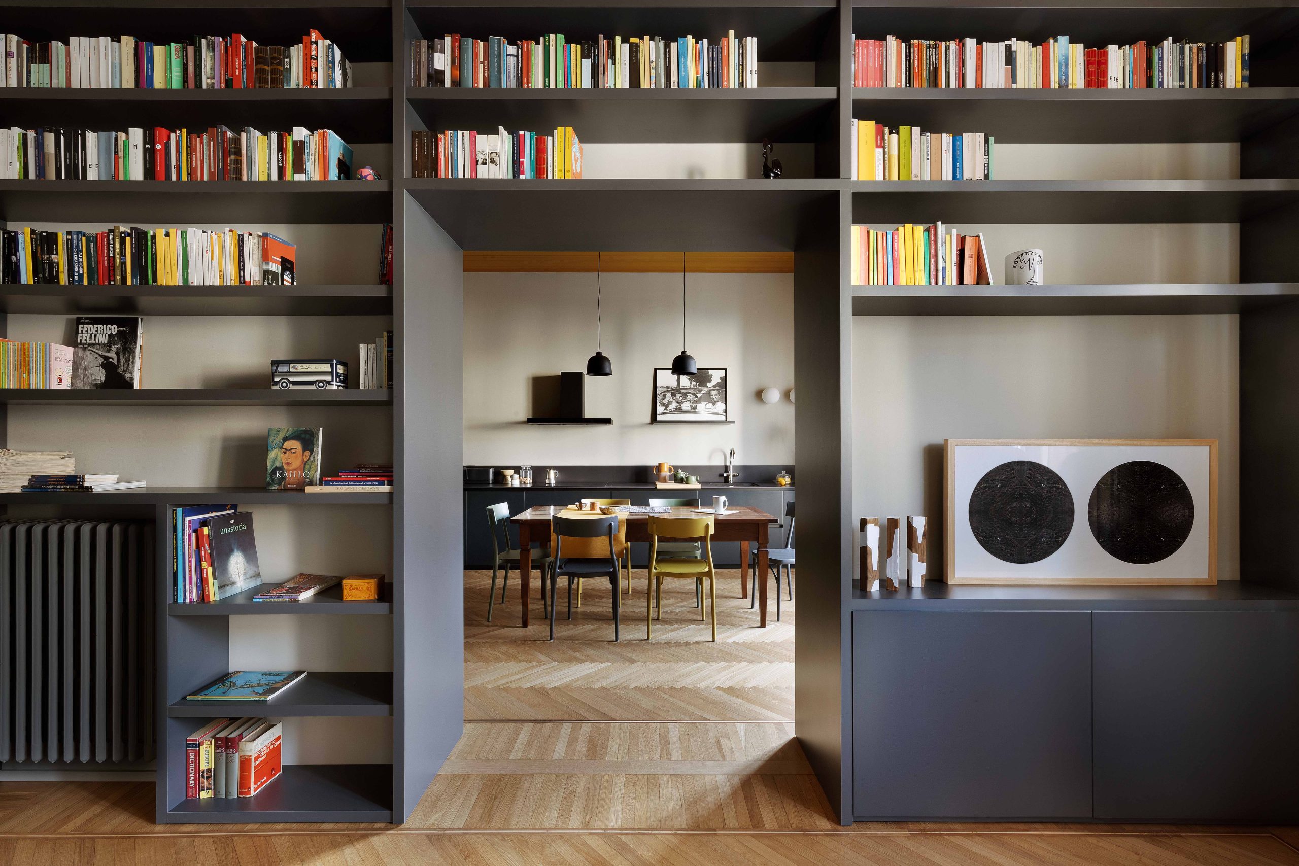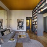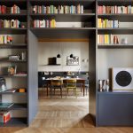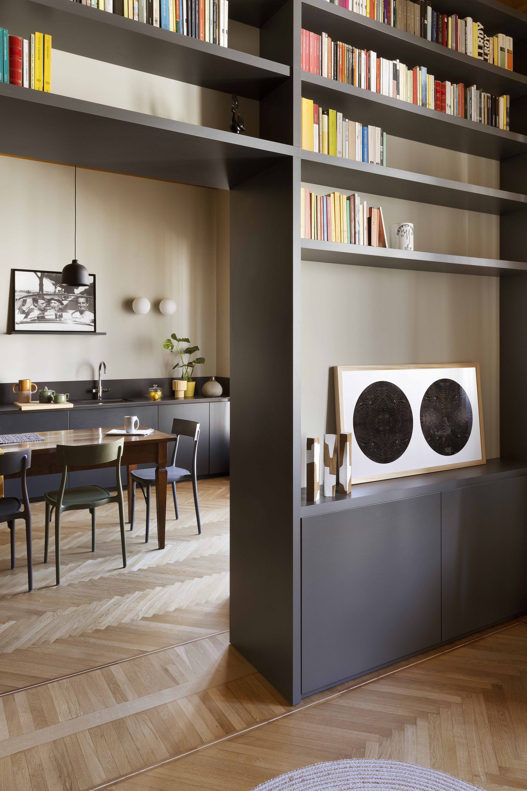 I due ambienti su via, composti da zona cucina e zona living, se da un lato risultano distinti ognuno con la propria funzione, dall’altro sono direttamente collegati tramite una nuova ampia apertura che permette di fruire di una zona giorno priva di confini generando uno spazio più conviviale. Ad incorniciare questa nuova apertura è stato realizzato un arredo su misura bifacciale: una libreria progettata dallo studio che, quasi a tutta altezza, avvolge il passaggio tra i due ambienti.Sulle due pareti opposte alla libreria, da un lato è collocata la cucina ad angolo, dall’altro la zona sofà, alle cui spalle si trova uno specchio originario della casa, che facendo da fondale amplia lo spazio e crea un gioco di riflessi, ponendo ancora l’attenzione sull’elemento libreria.