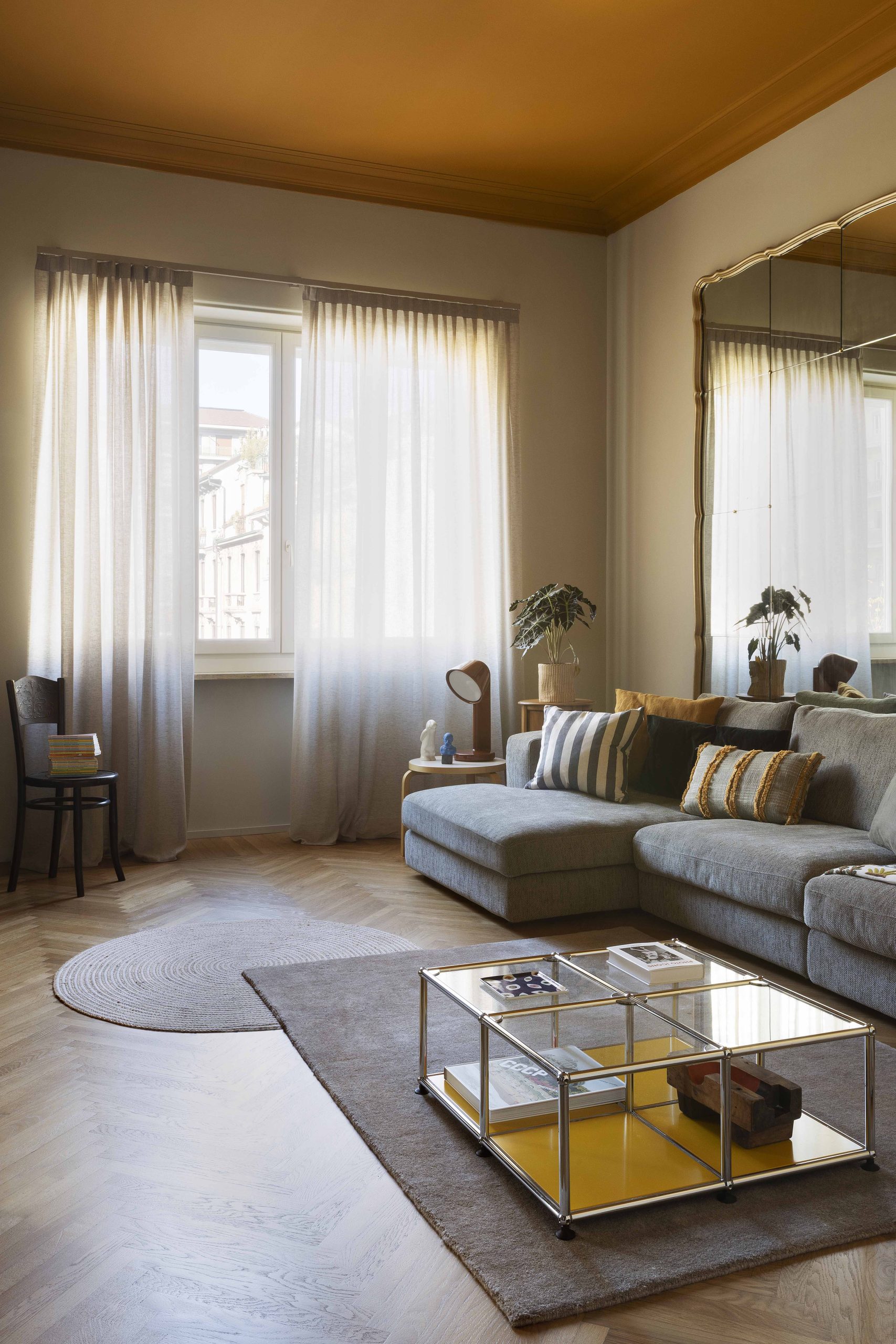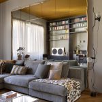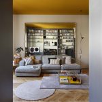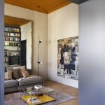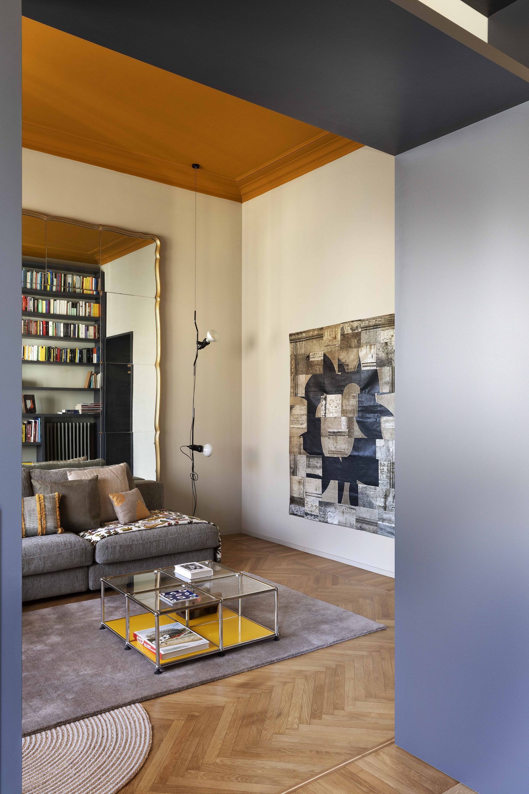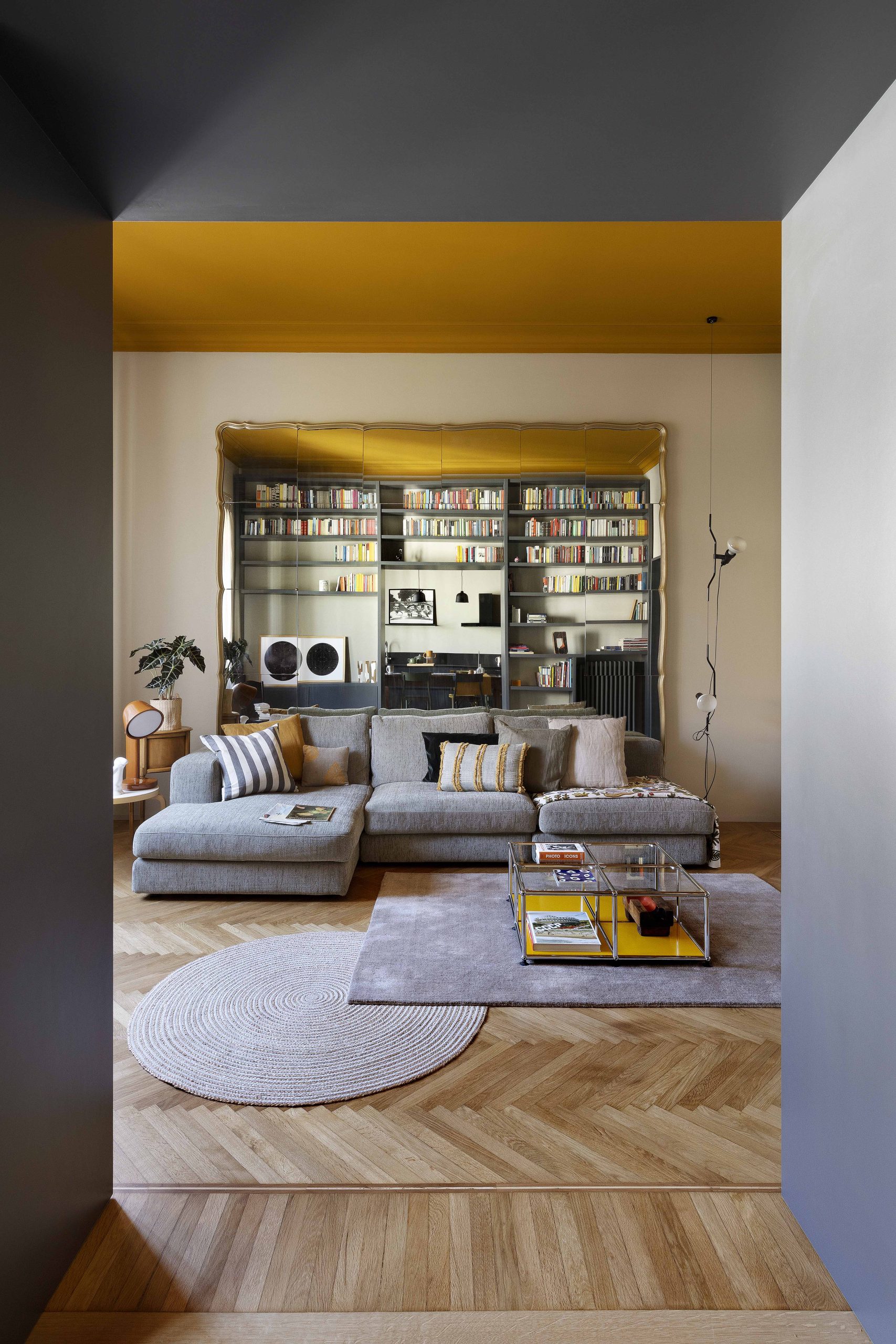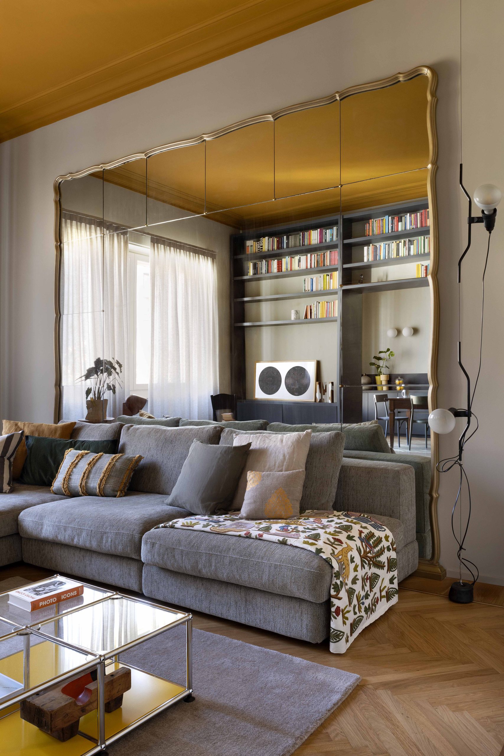 I due ambienti su via, composti da zona cucina e zona living, se da un lato risultano distinti ognuno con la propria funzione, dall’altro sono direttamente collegati tramite una nuova ampia apertura che permette di fruire di una zona giorno priva di confini generando uno spazio più conviviale. Ad incorniciare questa nuova apertura è stato realizzato un arredo su misura bifacciale: una libreria progettata dallo studio che, quasi a tutta altezza, avvolge il passaggio tra i due ambienti.Sulle due pareti opposte alla libreria, da un lato è collocata la cucina ad angolo, dall’altro la zona sofà, alle cui spalle si trova uno specchio originario della casa, che facendo da fondale amplia lo spazio e crea un gioco di riflessi, ponendo ancora l’attenzione sull’elemento libreria.