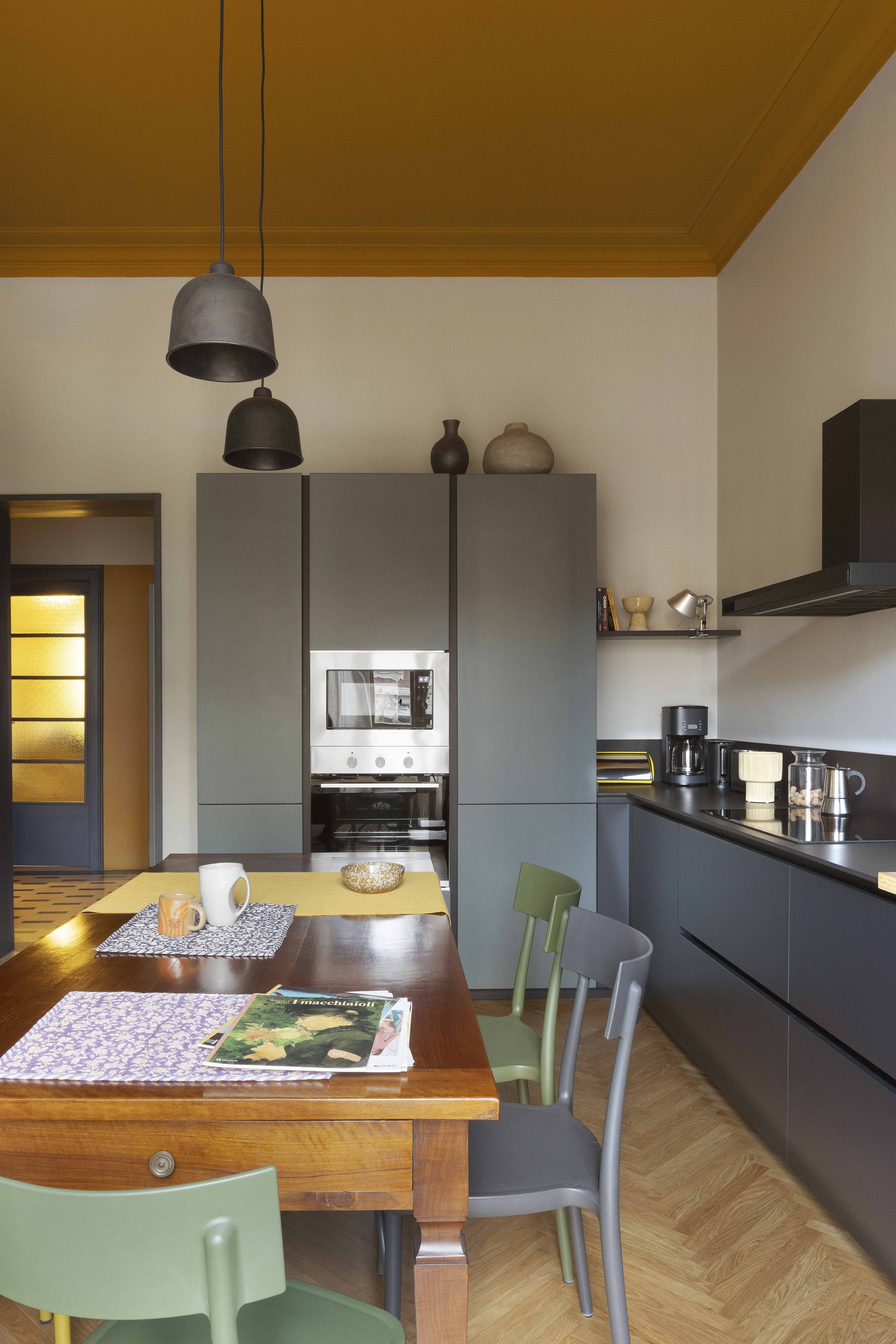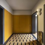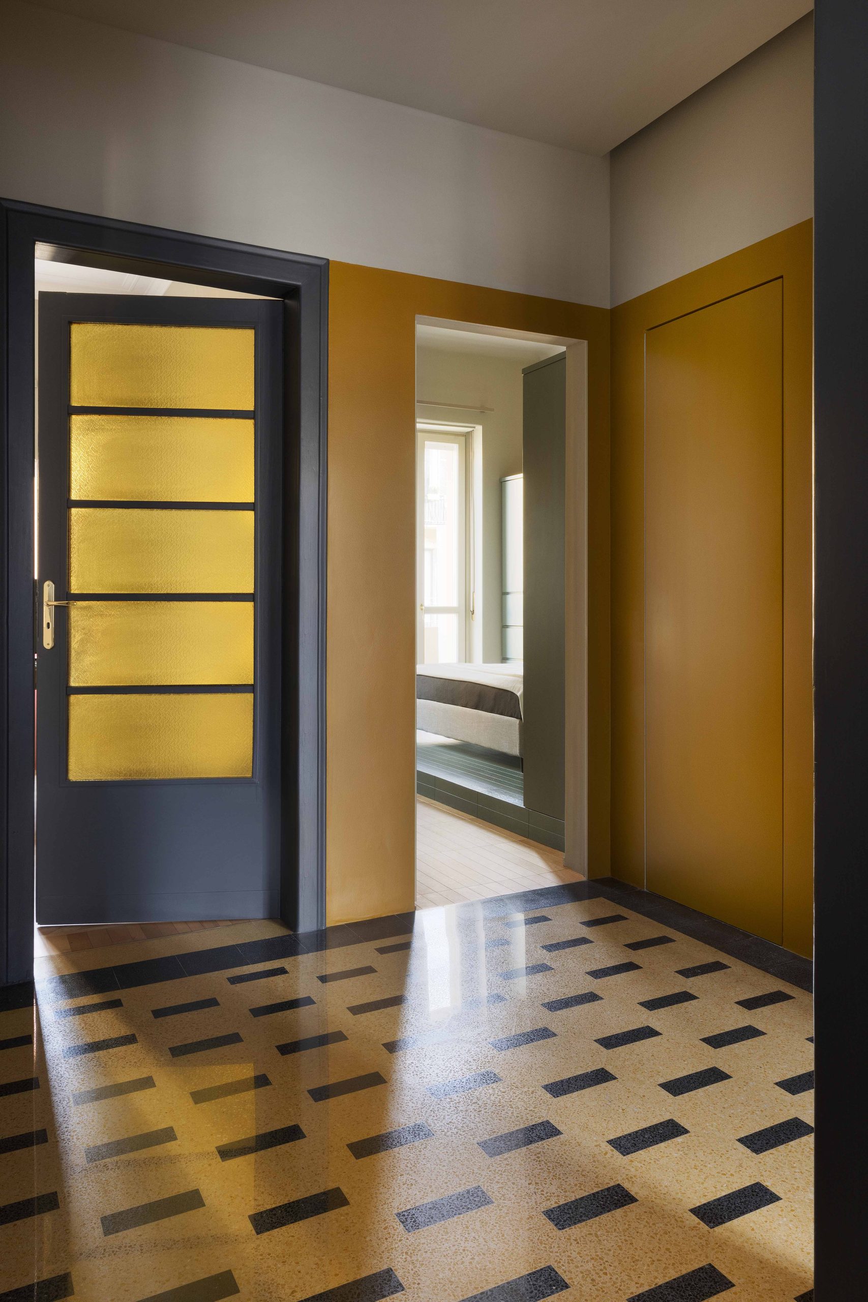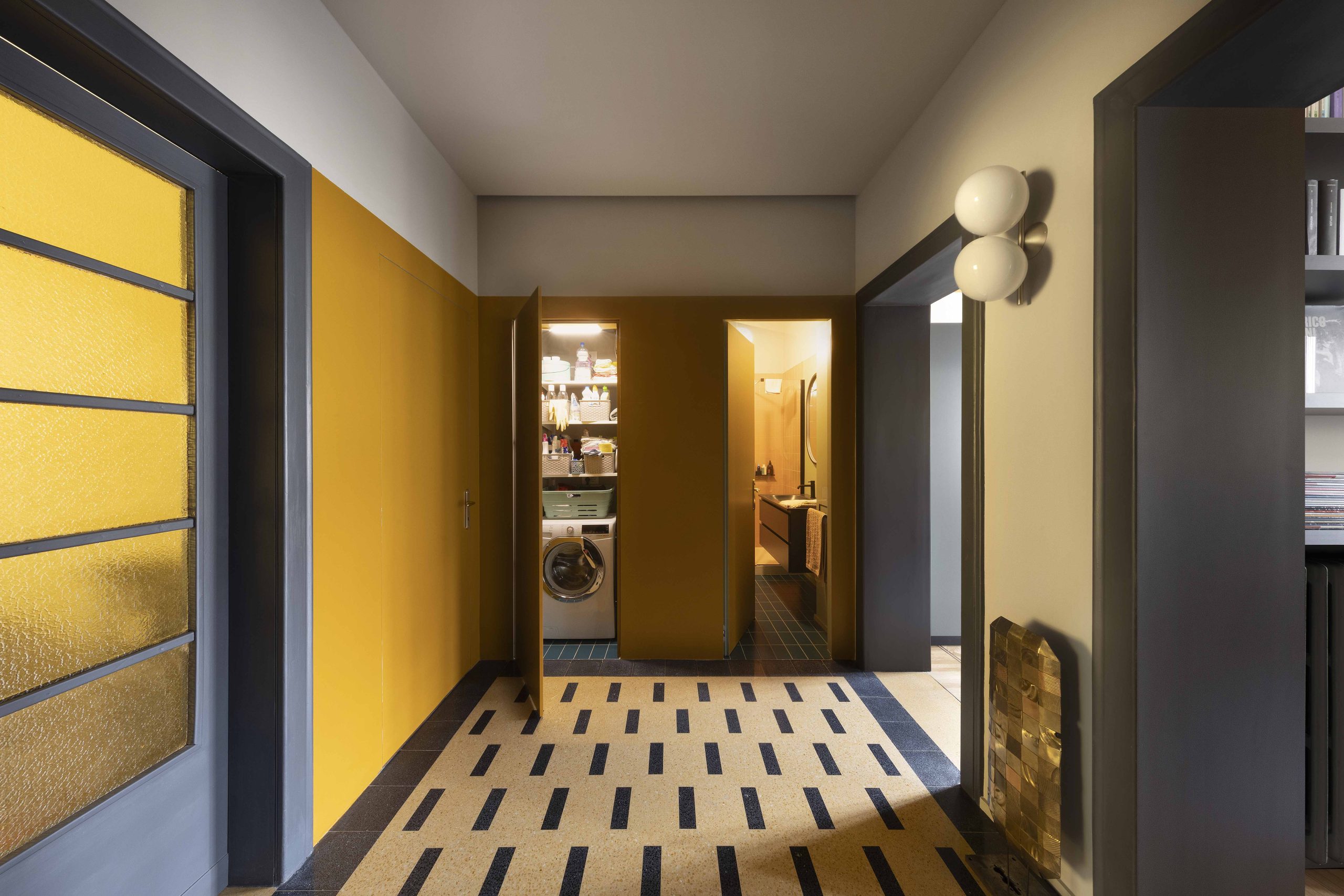 La scelta dei colori gira attorno ai colori della graniglia originaria della casa: i toni dei gialli-ocra sono stati ripresi nei soffitti della zona giorno e nelle due pareti di ingresso caratterizzate dalle nuove porte (bagno, lavanderia e camera) con un segno grafico realizzato da un cambio di colore per mettere in evidenza il nuovo rispetto al vecchio (le vecchie porte e le relative cornici).I colori delle vecchie porte e delle cornici, delle basi della cucina e dell’elemento libreria sono in nuance con i toni antracite della graniglia.I verdi sono stati inseriti sulle colonne della cucina, sui nuovi pavimenti in bagno e in camera da letto.