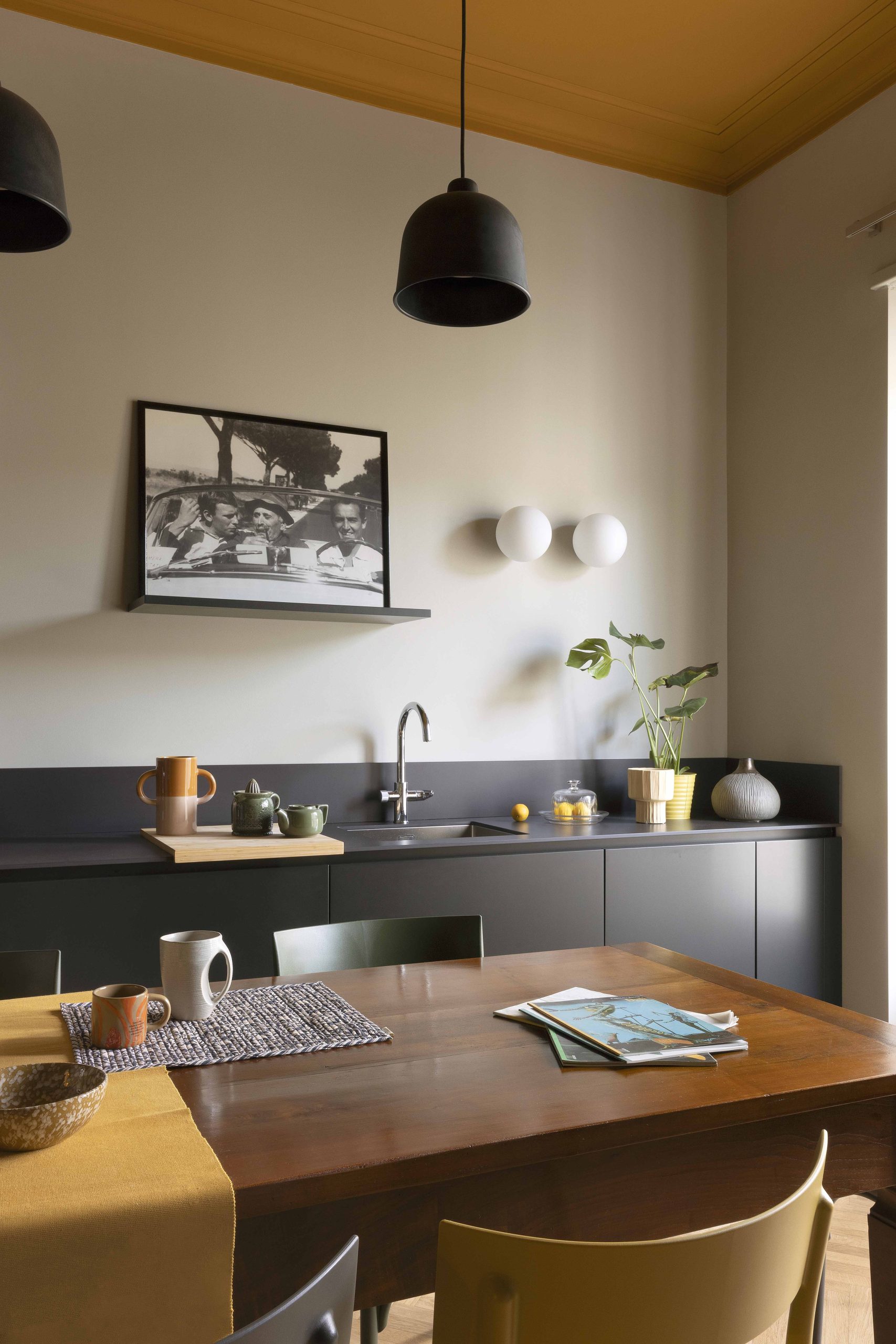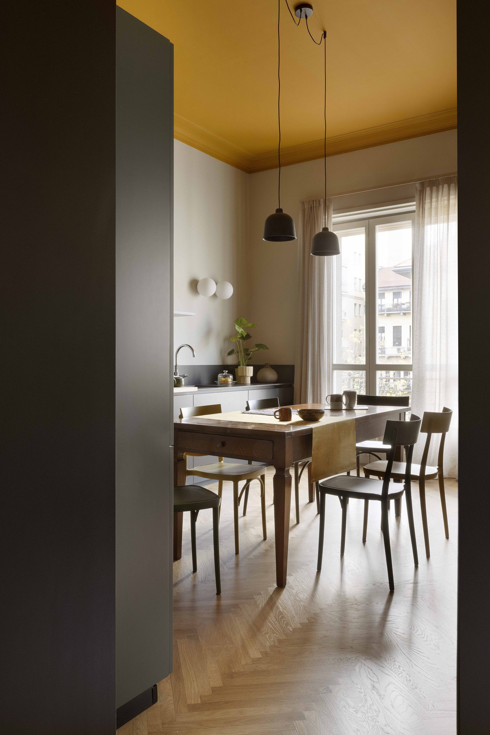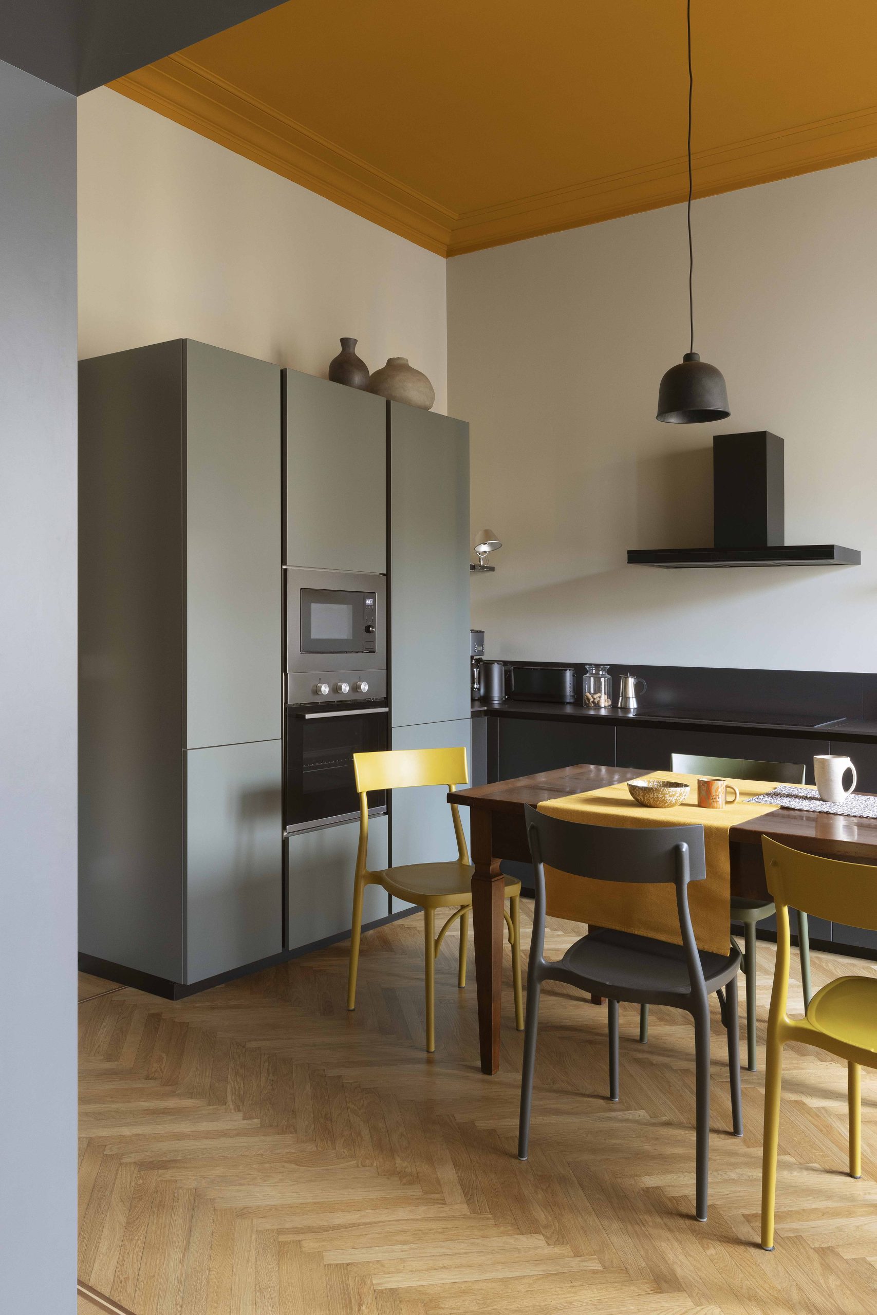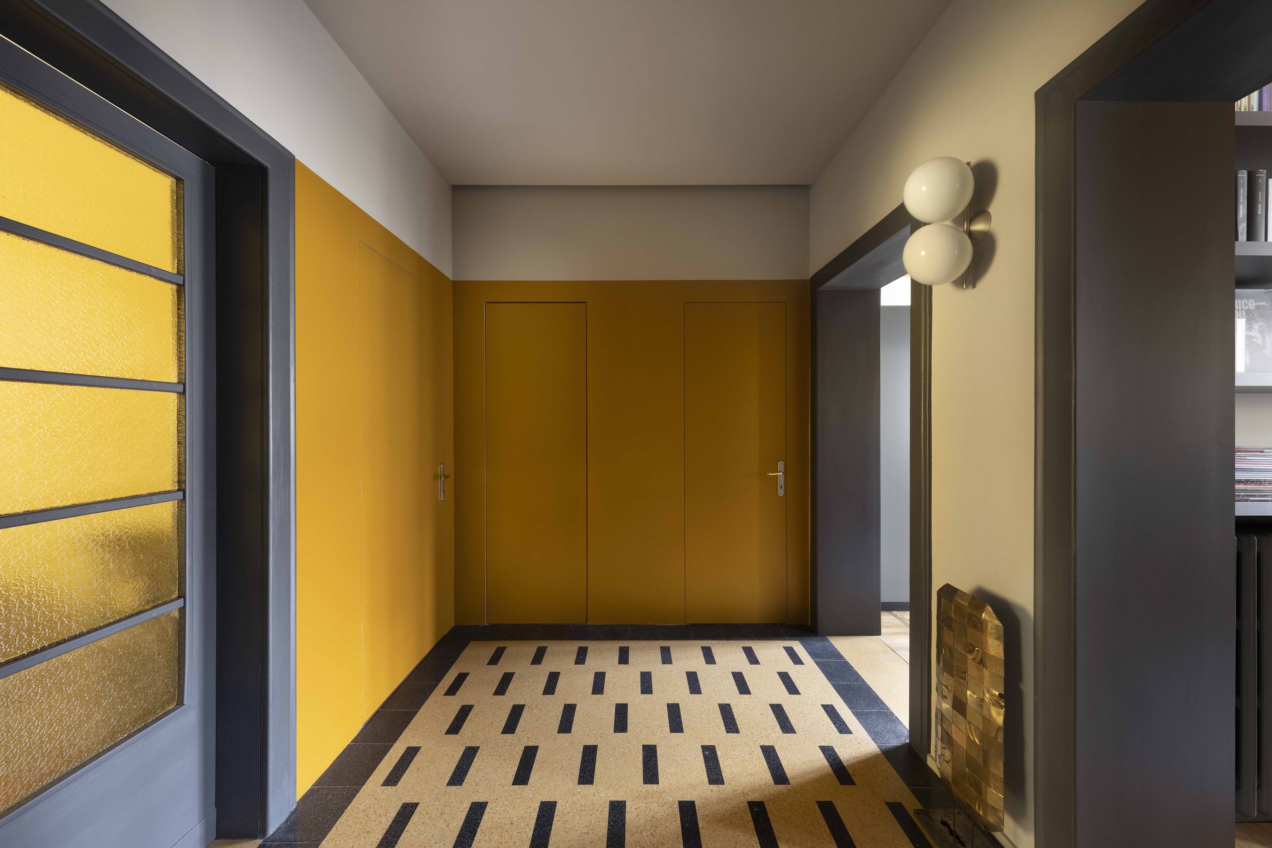 La scelta dei colori gira attorno ai colori della graniglia originaria della casa: i toni dei gialli-ocra sono stati ripresi nei soffitti della zona giorno e nelle due pareti di ingresso caratterizzate dalle nuove porte (bagno, lavanderia e camera) con un segno grafico realizzato da un cambio di colore per mettere in evidenza il nuovo rispetto al vecchio (le vecchie porte e le relative cornici).I colori delle vecchie porte e delle cornici, delle basi della cucina e dell’elemento libreria sono in nuance con i toni antracite della graniglia.I verdi sono stati inseriti sulle colonne della cucina, sui nuovi pavimenti in bagno e in camera da letto.