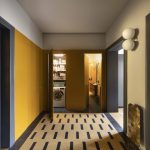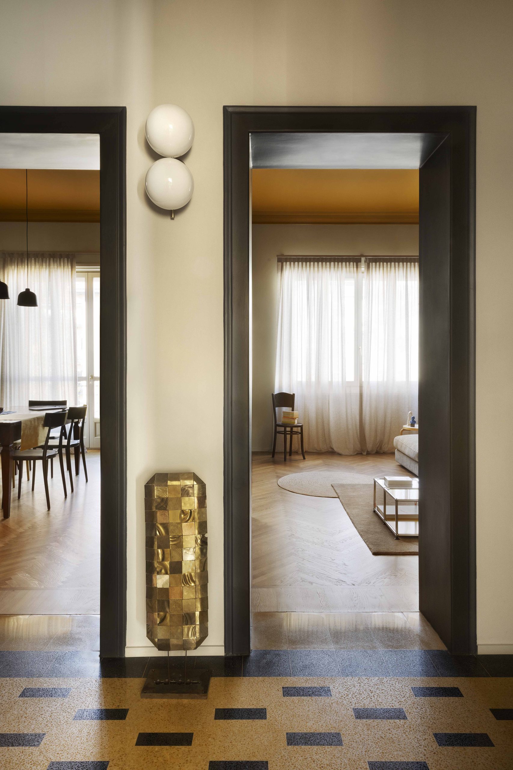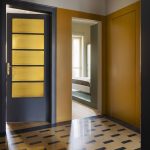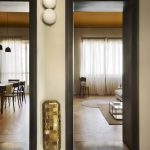 Dei dettagli originari sono stati recuperati i pavimenti (graniglia nell’ingresso, parquet in legno a spina nella zona giorno e nello studio) e alcune vecchie porte con le rispettive cornici, compresa la bussola d’ingresso. Le due porte degli ambienti (cucina e soggiorno) che affacciano su via sono state eliminate per aprire la zona giorno direttamente sull’ingresso e permettere così alla luce di diffondersi anche in questa zona, altrimenti cieca. Di queste due porte sono state mantenute le cornici originarie lato ingresso, restaurate e riverniciate, e modificate in chiave contemporanea quelle lato interno sui due ambienti della cucina e del soggiorno.