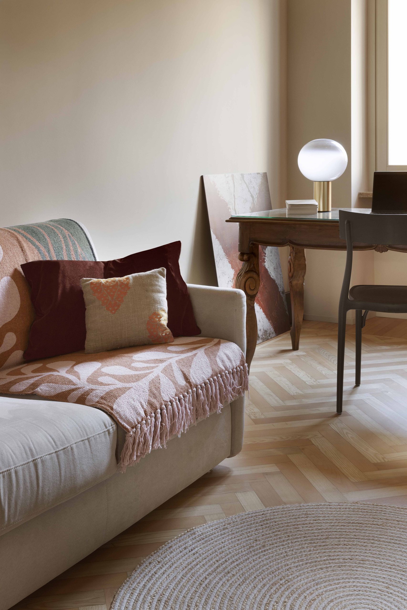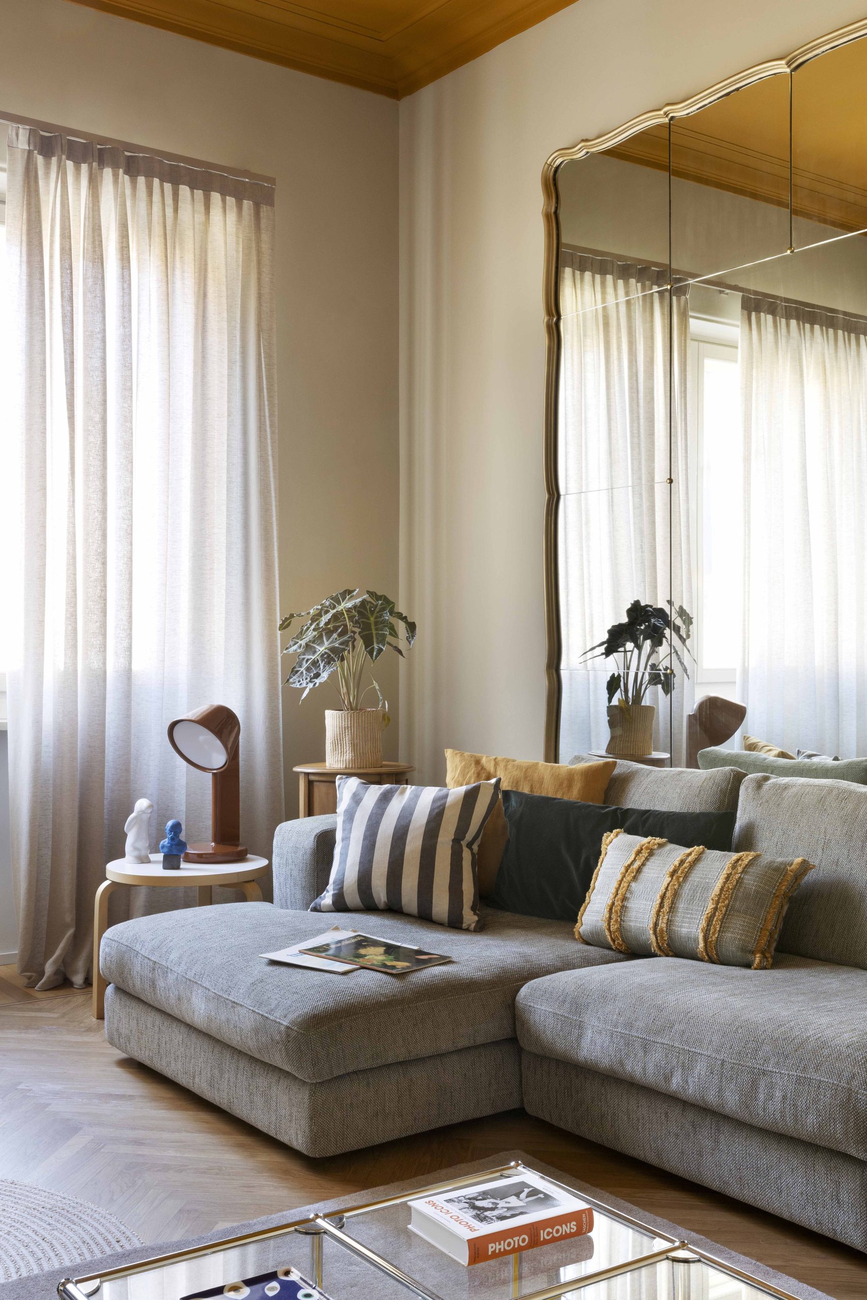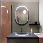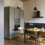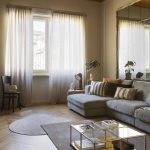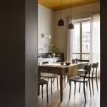 Per il progetto illuminotecnico, la scelta è stata animata dallo stesso intento di reinterpretare in chiave contemporanea un alloggio di inizio 900, proponendo una serie di elementi, alcuni minimali e altri più retrò. Per l’ingresso l’applique IC Lights Double di Flos; in soggiorno la Parentesi e la lampada da tavolo Ceramique di Flos; in cucina sul tavolo le due sospensioni Grain Pendant Lamp di Muuto, a parete le due applique Mapa di Ideal lux e la Tolomeo Pinza di Artemide sulla mensola; in bagno la Rime Pendant Lamp di Muuto e lo specchio retroilluminato Futon di Intra Lighting; per la camera da letto si è scelto un elemento più tecnico lineare a luce indiretta Rec di Arkos Light per l’illuminazione generale, sui comodini la sospensione E27 Pendant Lamp di Muuto e la Blom di FontanaArte; per lo studio la Laguna di Artemide.