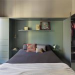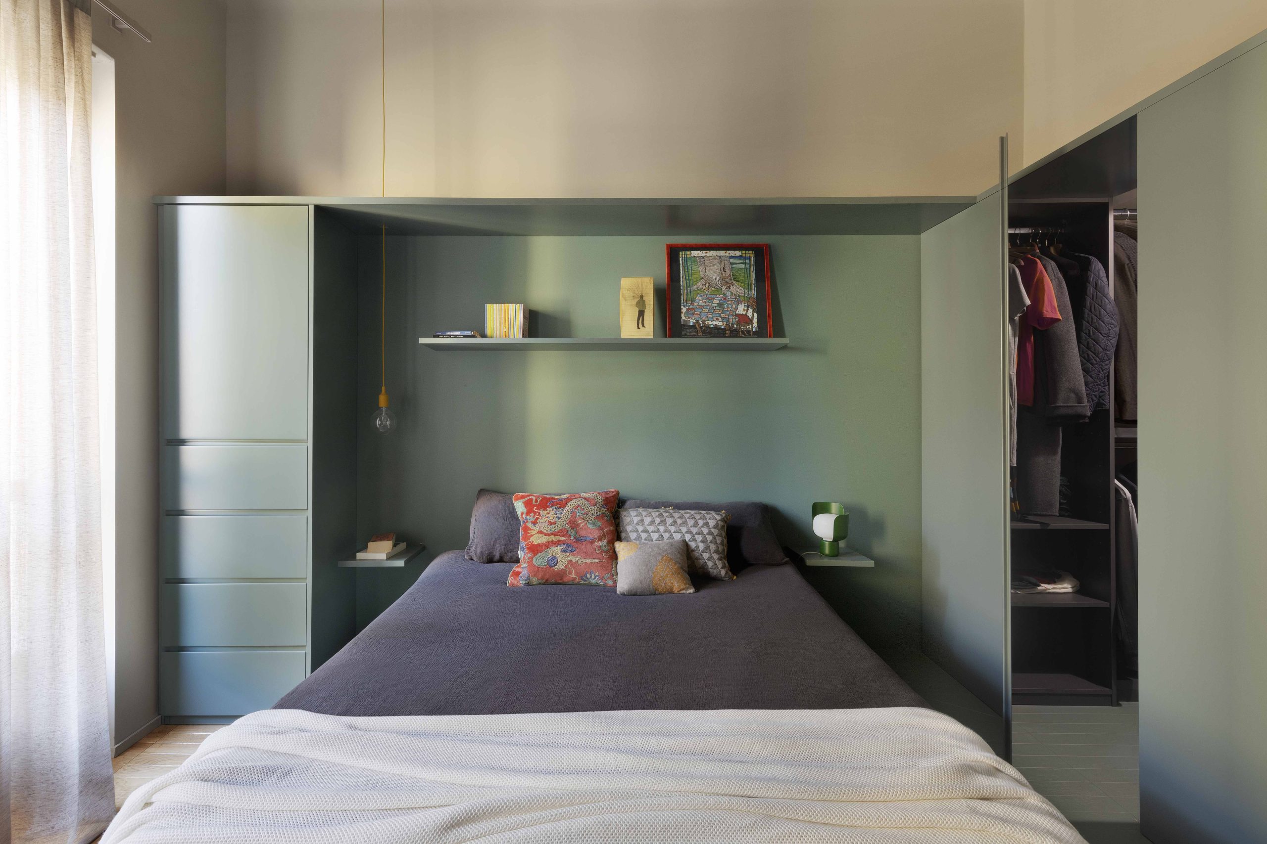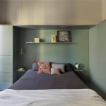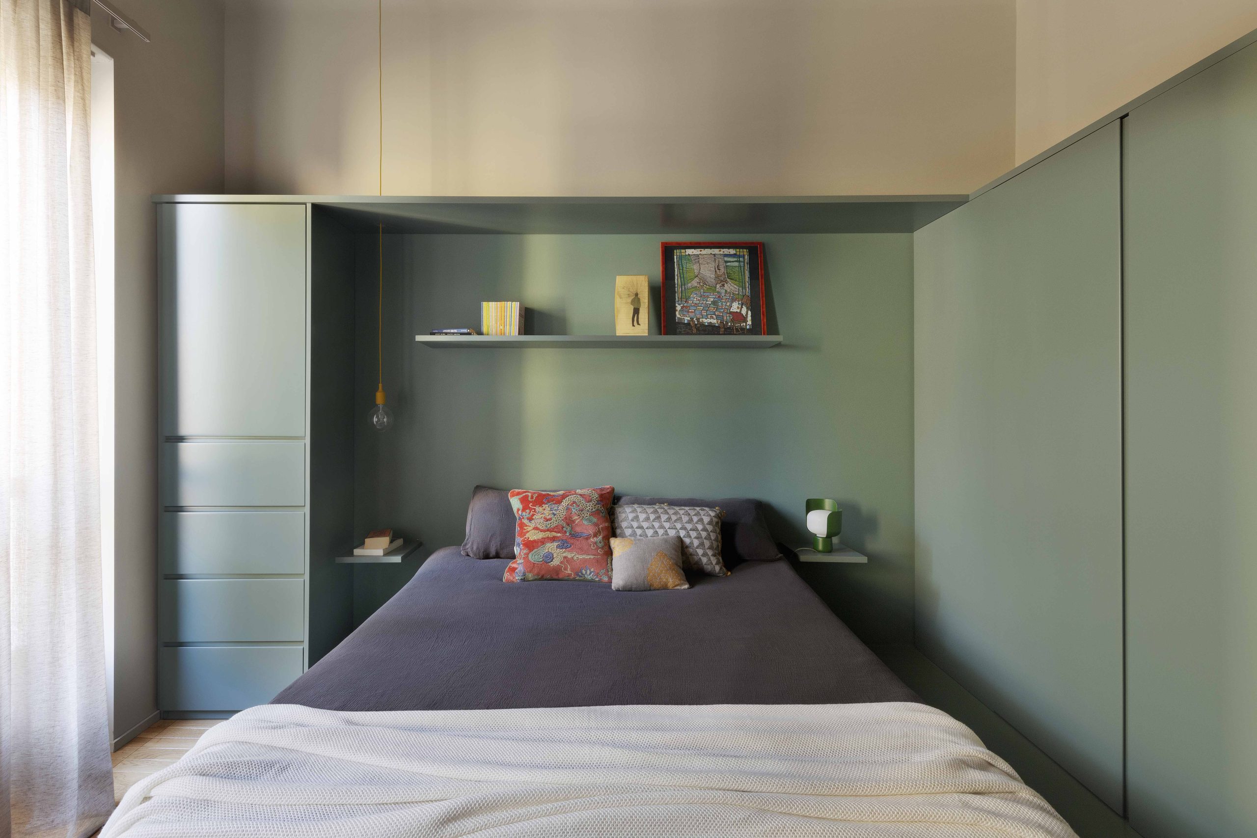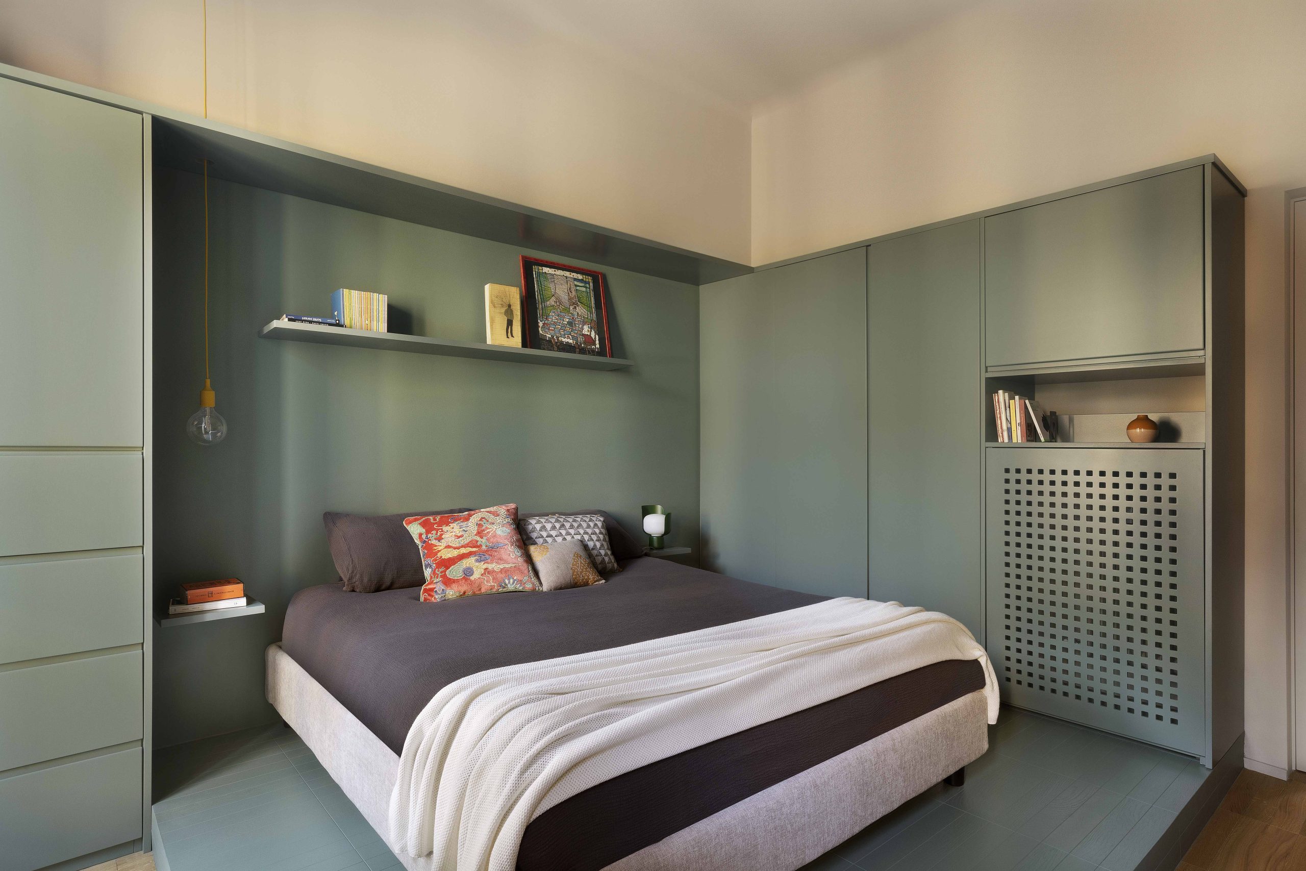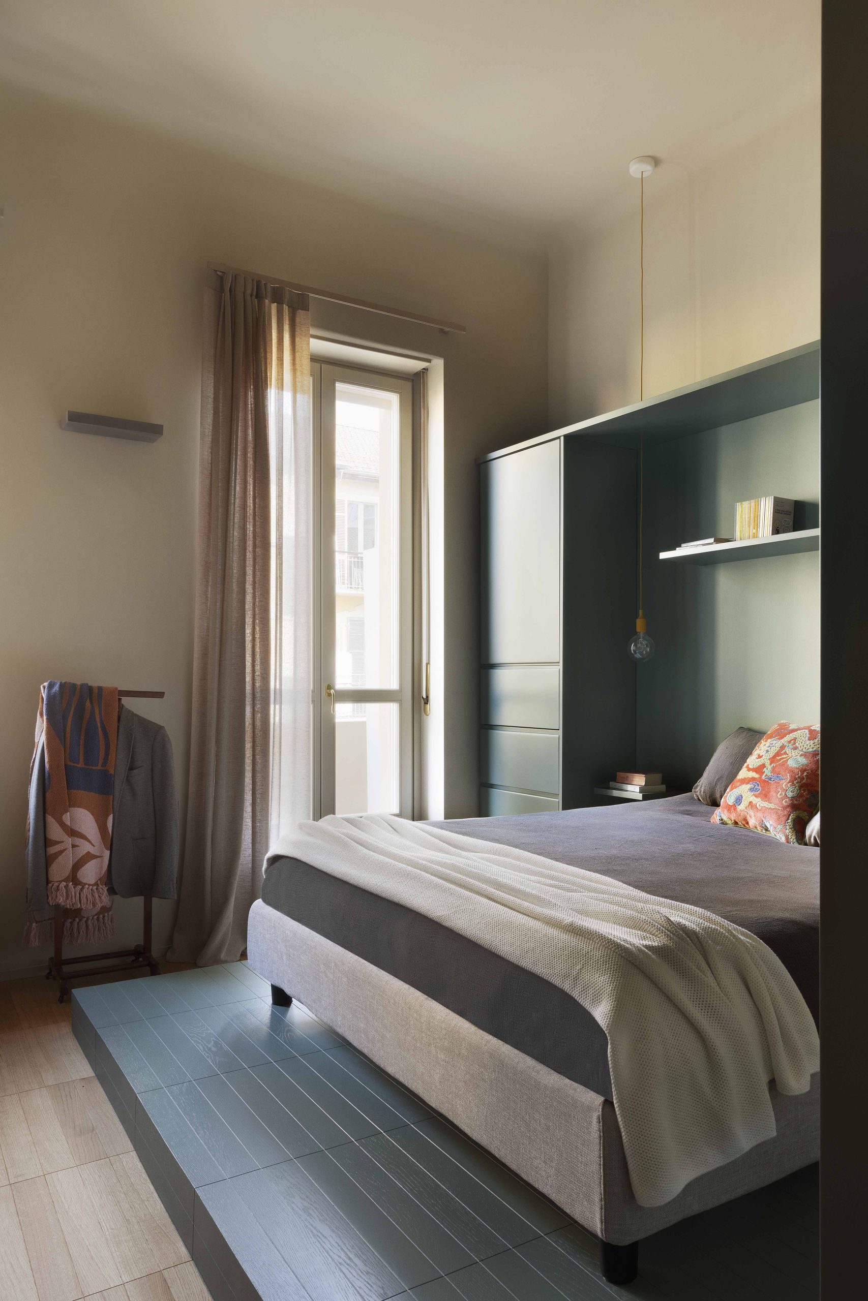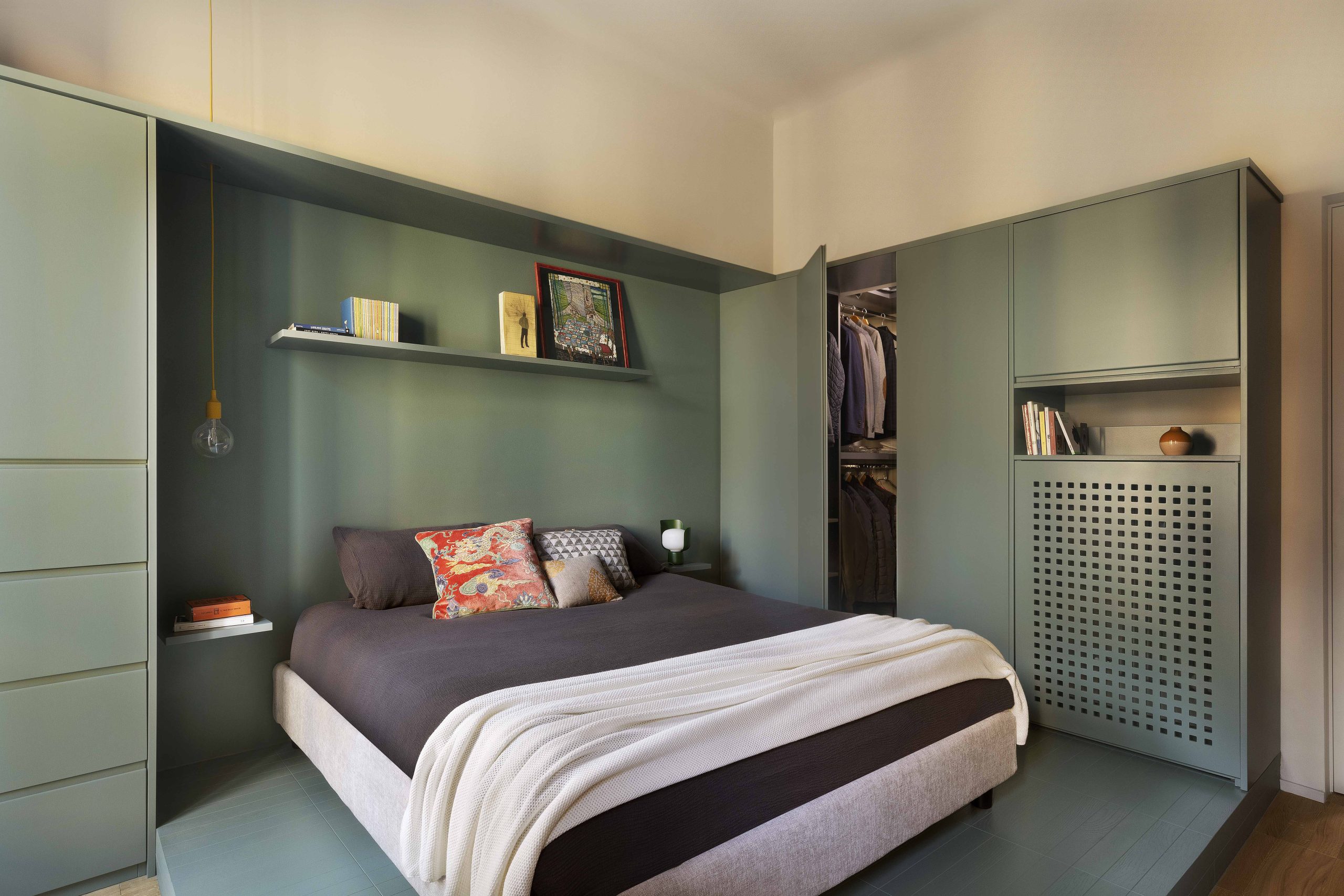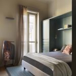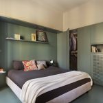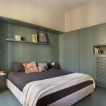 La camera da letto, situata nella zona della vecchia cucina, è stata reinterpretata in maniera contemporanea: la pedana situata nella zona letto, realizzata per motivi impiantistici, è diventata la zona fulcro dell’ambiente, attorno alla quale sono stati realizzati gli arredi su misura contenitivi e la cabina armadio realizzati in legno laccato dello stesso colore verde. Per i pavimenti della camera da letto si è scelto di riprendere le caratteristiche e le dimensioni delle doghe del parquet in rovere della zona giorno reinterpretandone la posa e, per la pedana, anche il colore.