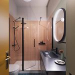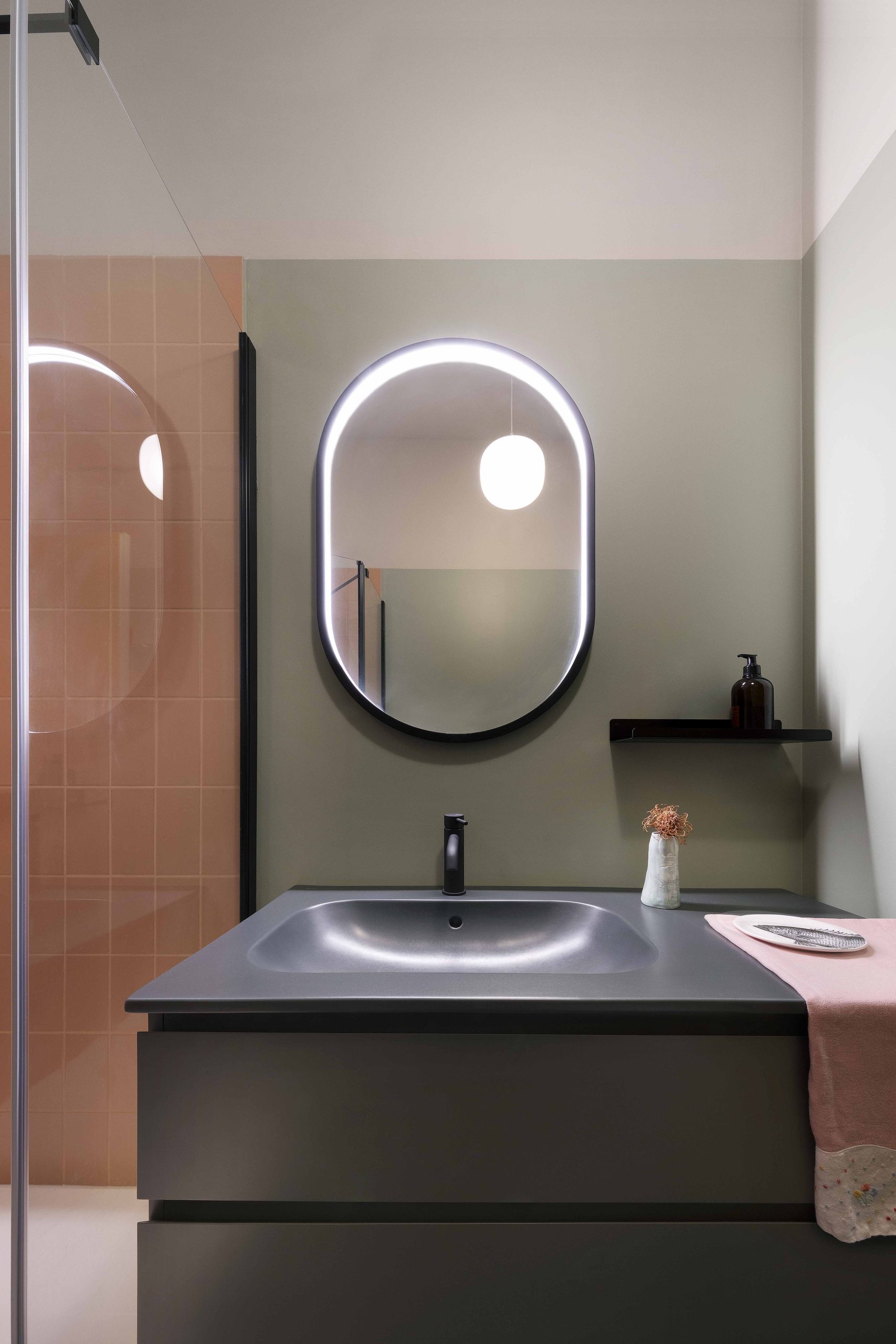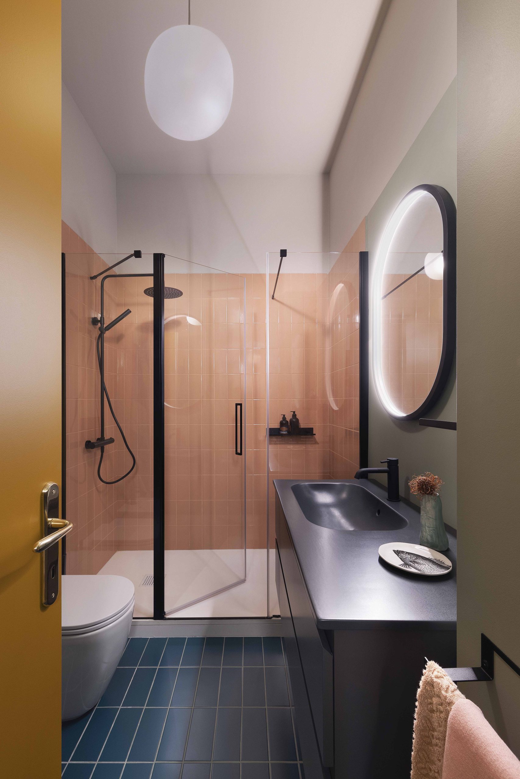 Per i bagni sono stati scelti dei materiali contemporanei dal sapore e dai colori retrò. Per i pavimenti, si è scelto di utilizzare delle piastrelle smaltate nella colorazione opaca Malachite che si sposa bene con i gialli della graniglia dell’ingresso. Le stesse piastrelle sono state utilizzate anche come rivestimento nella colorazione lucida Cipria. Per dare un tocco di contemporaneità sono stati scelti il mobile con lavabo integrato nella colorazione deep grey e i dettagli neri della rubinetteria e del box doccia.