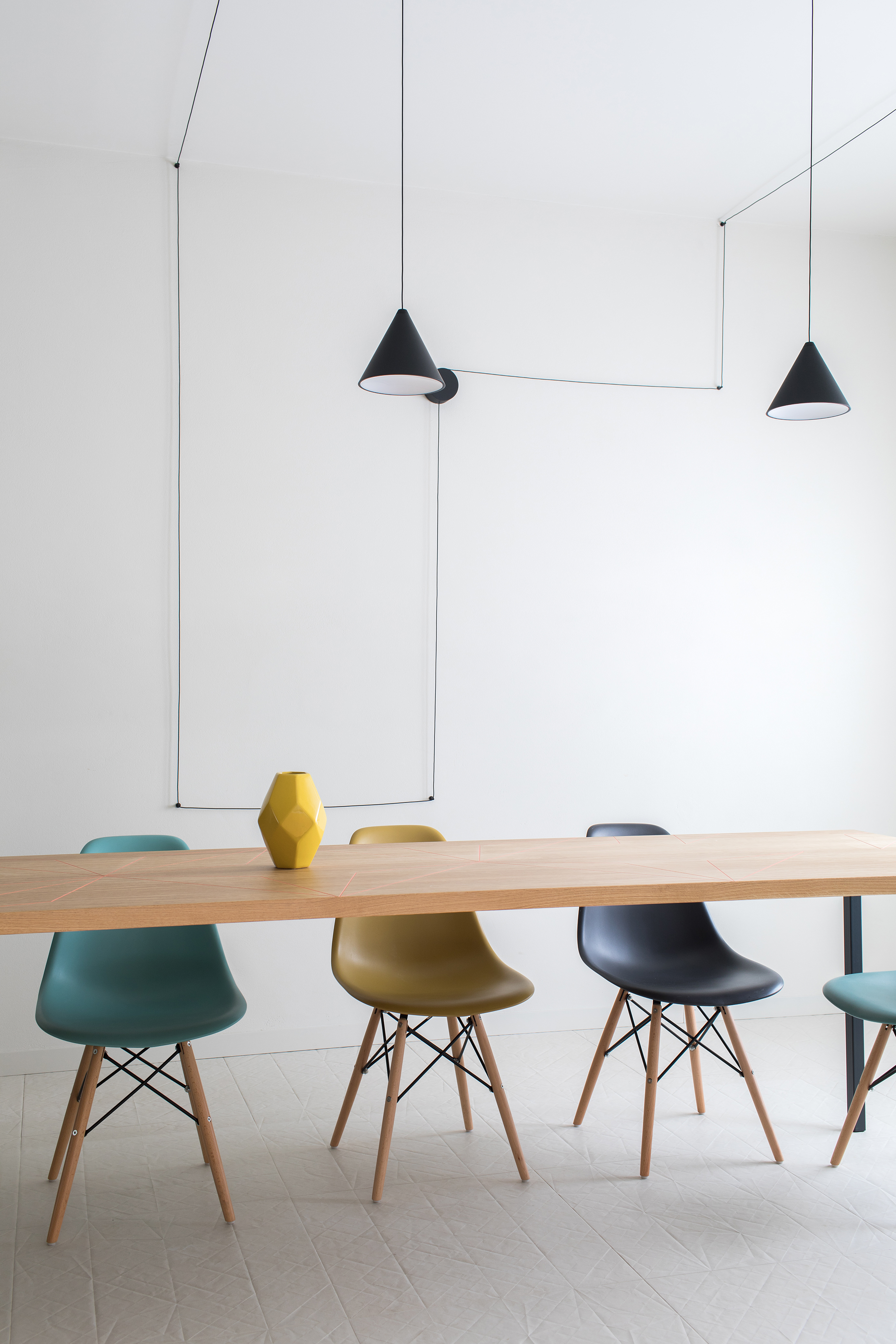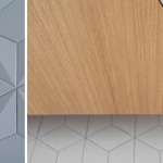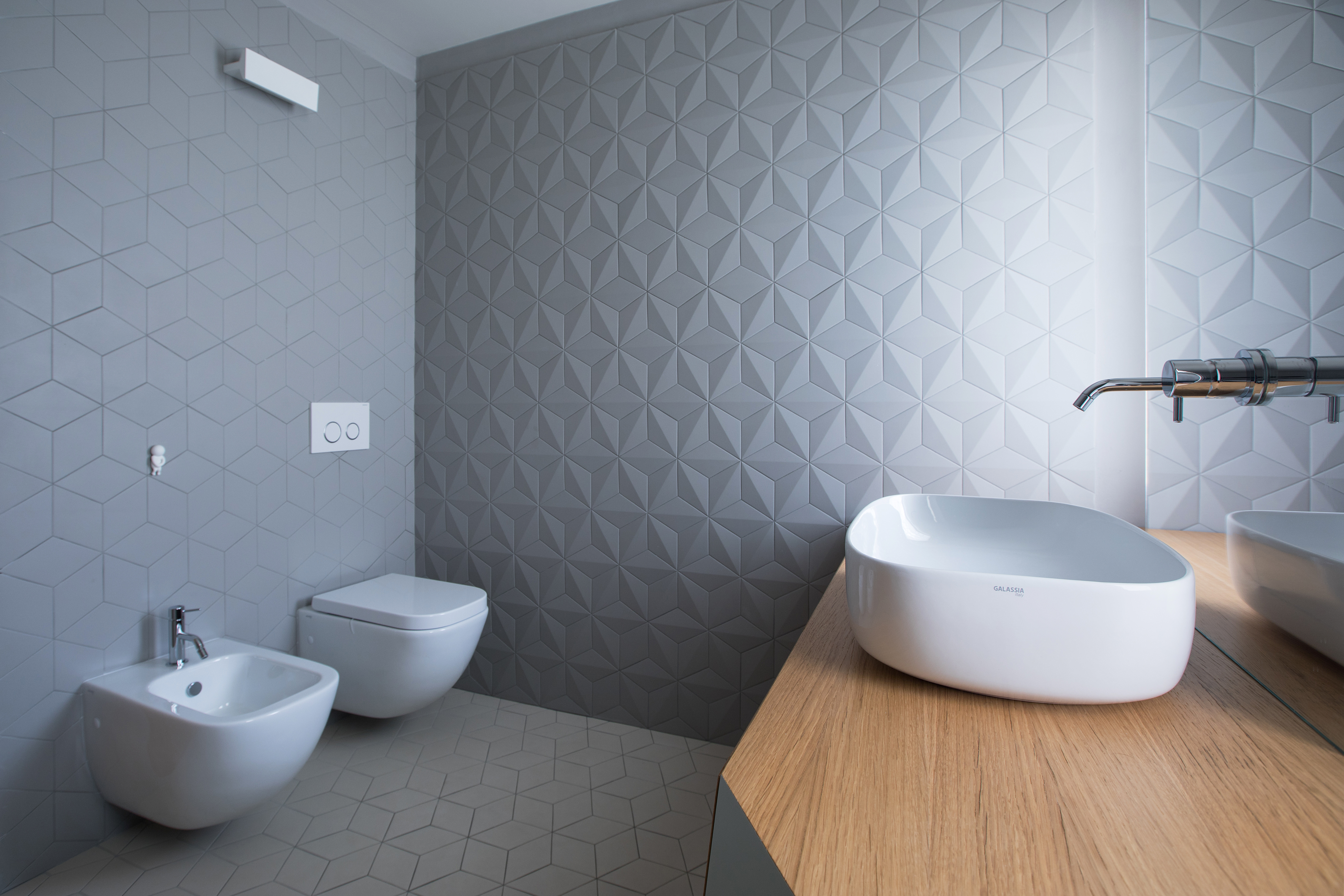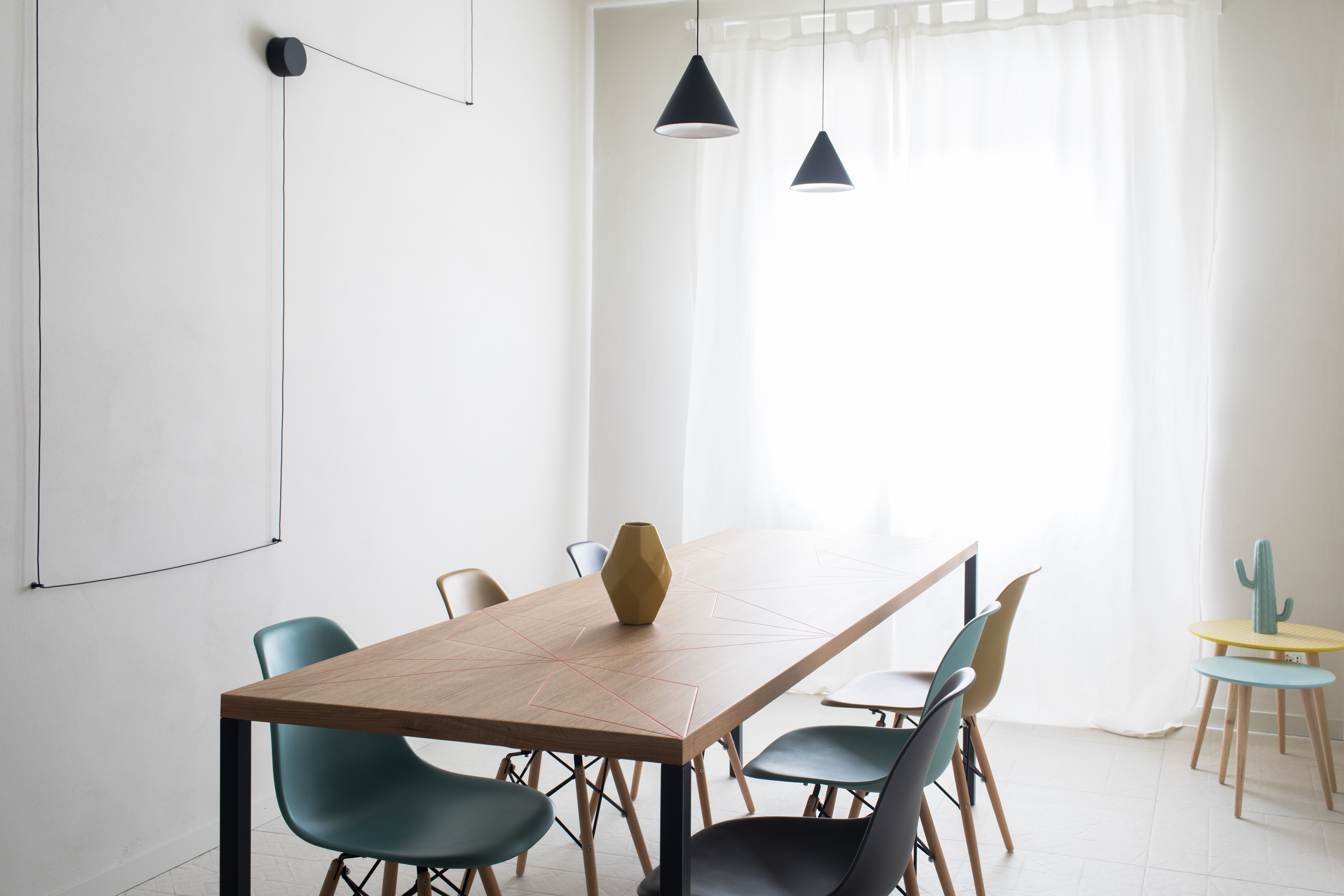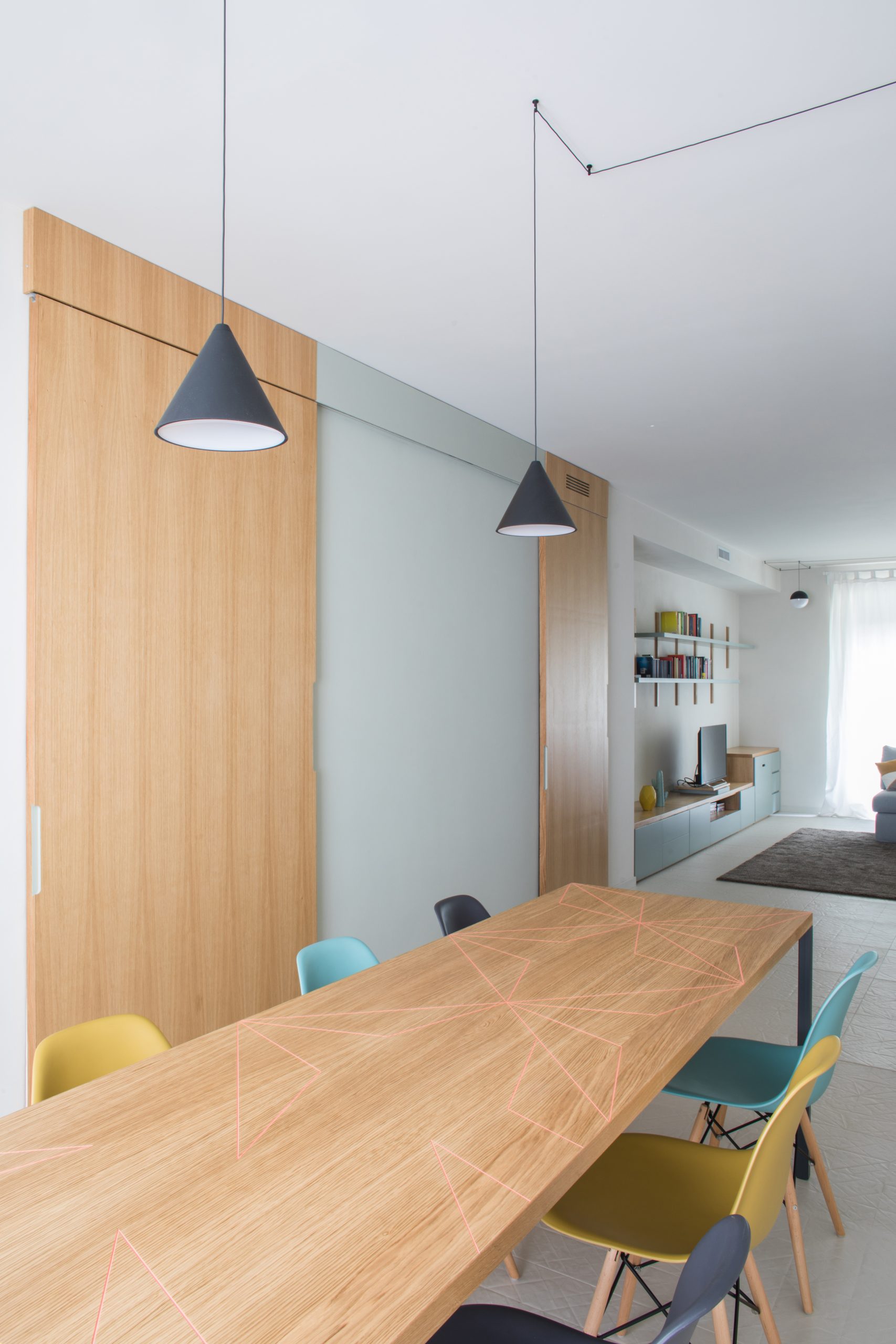La zona giorno è concepita come un ambiente unico, aspetto sottolineato dall’uso di un unico pavimento (serie Folded di Mutina) in cui la successione tra l’area cucina, pranzo e soggiorno è resa molto fluida attraverso l’omogeneità del sistema di arredo, pensato e realizzato su misura per rispondere alle richieste specifiche dei clienti. La separazione tra cucina e zona pranzo è ideata secondo una logica di flessibilità d’uso, attraverso l’utilizzo di un sistema di pannelli scorrevoli a tutt’altezza in rovere naturale con maniglie a gola color salvia. Anche la cucina realizzata su disegno, ripropone la finitura rovere naturale-laccatura color verde salvia, con piano in marmo di carrara e pensili su doppio ordine scandite da una geometria apparentemente libera. Il gioco di geometrie poligonali, in 2 e 3 dimensioni ha rappresentato il leitmotiv decorativo che caratterizza tutto il sistema di arredo e le finiture di rivestimento, come nel caso delle diamantine su base romboidali utilizzate per le pareti dei bagni, disegnate da hom Architetti e realizzate su richiesta da Etruria Design. Il tavolo da pranzo, anch’esso realizzato su disegno, dalle linee molto minimali ripropone un disegno geometrico di poligoni color corallo. Nella zona living- salotto una parete attrezzata realizzata con le stesse finiture di tutto il sistema di arredo alloggia, libreria, contenitori, tv e scrittoio. Ad illuminare la zona living le String Light di Flos e gli impercettibili punti luce Nulla di Davide Groppi. Unica eccezione al pavimento in gres sono il parquet posato a canestro in versione macro delle camere da letto. Per i bagni, alle piastrelle diamantate del rivestimento si associa la piastrella piana romboidale per il piano pavimento che nel complesso riproduce un effetto ottico tridimensionale talvolta esaltato dal disegno dei mobili bagno in una combinazione studiata tra volumi e dettagli cromatici.