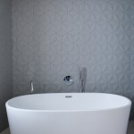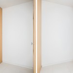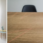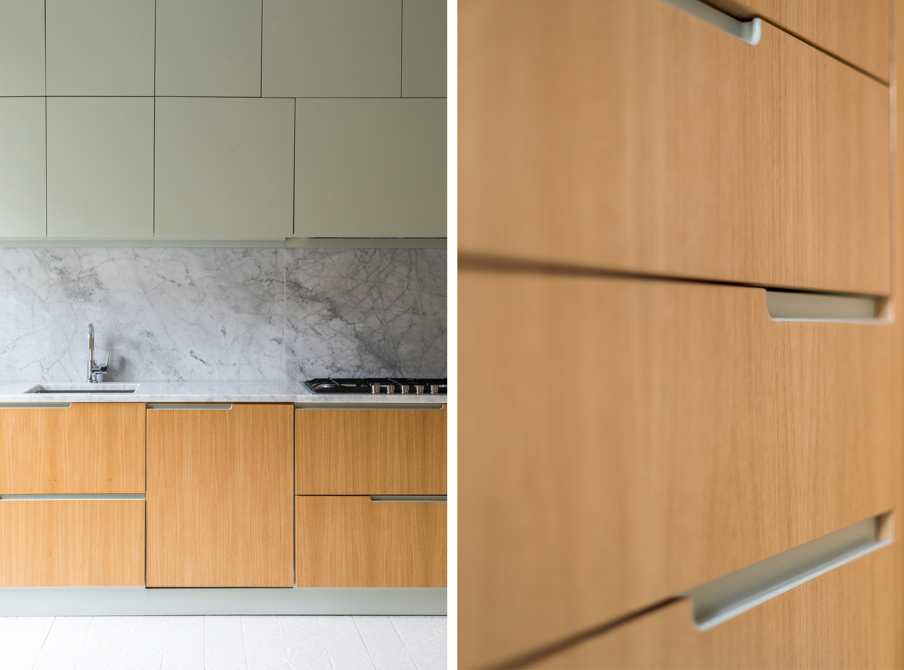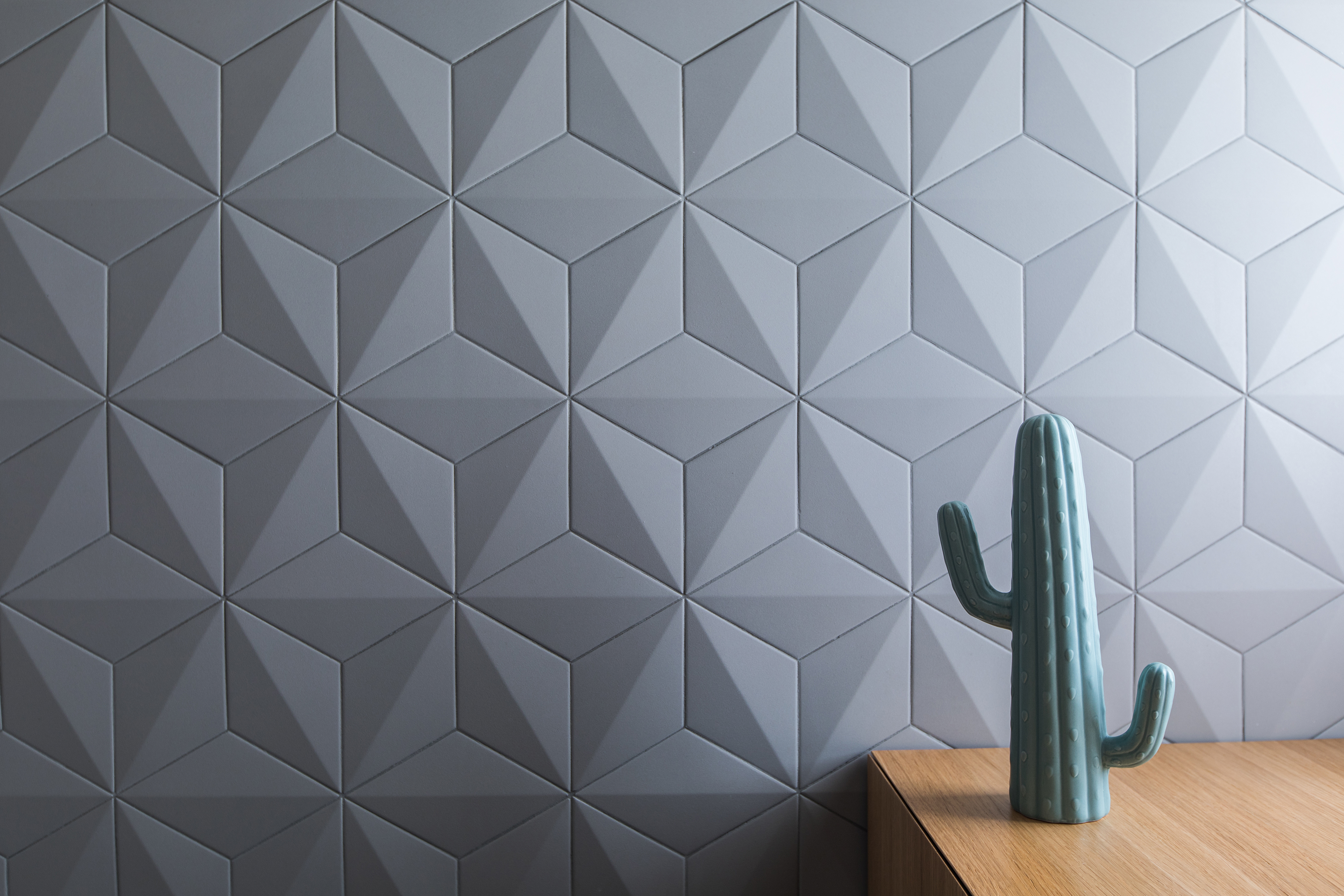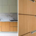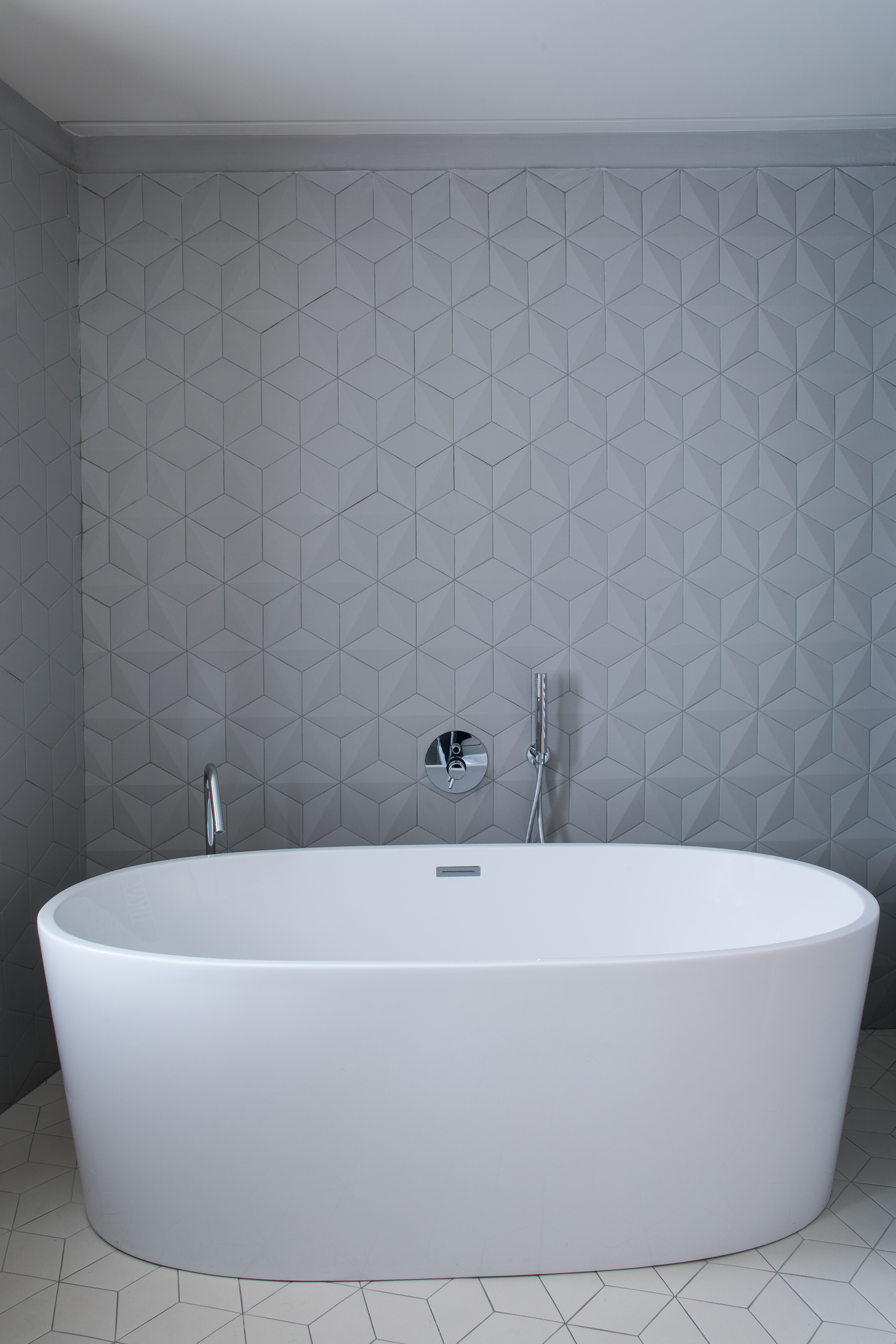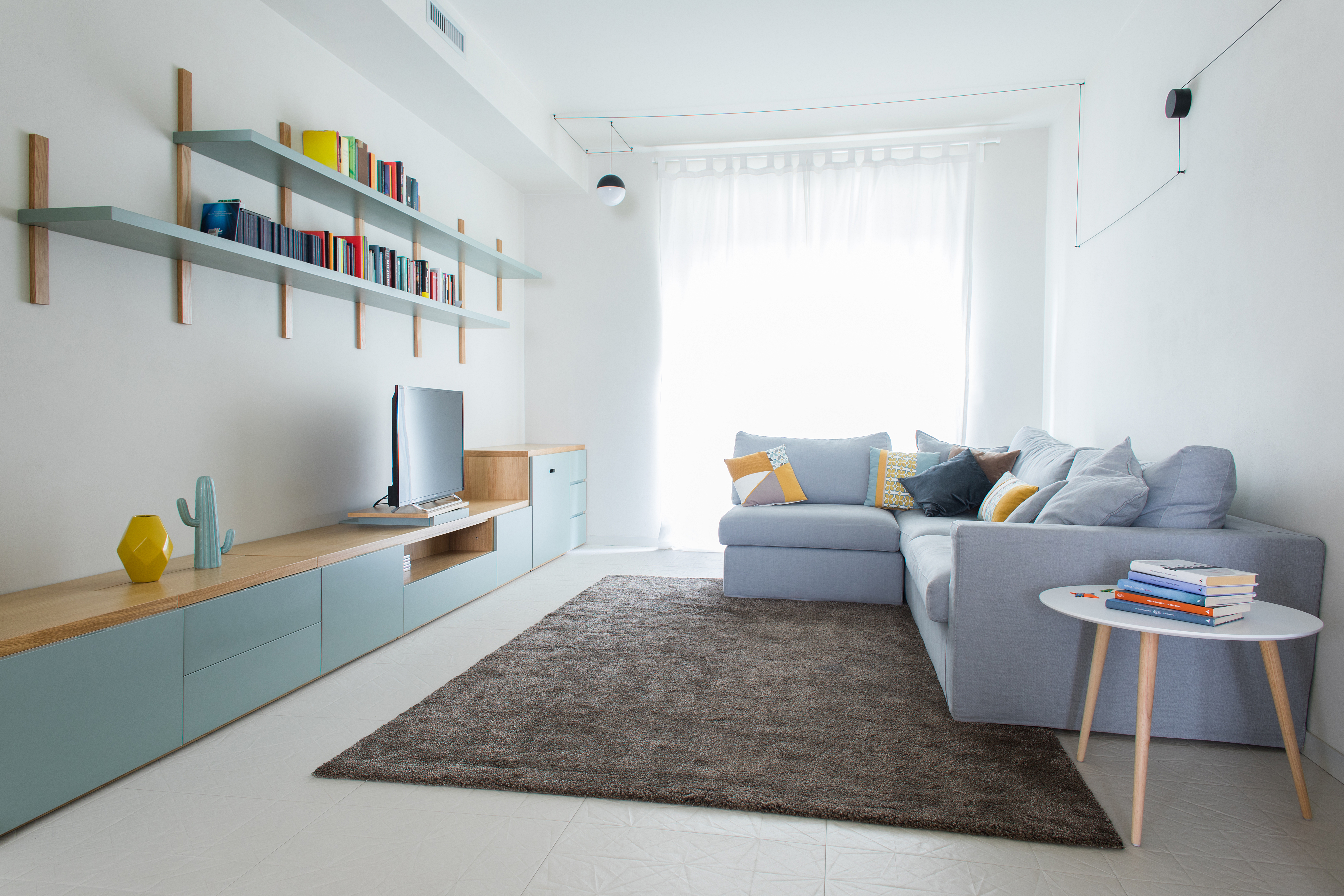 La zona giorno è concepita come un ambiente unico, aspetto sottolineato dall’uso di un unico pavimento (serie Folded di Mutina) in cui la successione tra l’area cucina, pranzo e soggiorno è resa molto fluida attraverso l’omogeneità del sistema di arredo, pensato e realizzato su misura per rispondere alle richieste specifiche dei clienti. La separazione tra cucina e zona pranzo è ideata secondo una logica di flessibilità d’uso, attraverso l’utilizzo di un sistema di pannelli scorrevoli a tutt’altezza in rovere naturale con maniglie a gola color salvia. Anche la cucina realizzata su disegno, ripropone la finitura rovere naturale-laccatura color verde salvia, con piano in marmo di carrara e pensili su doppio ordine scandite da una geometria apparentemente libera. Il gioco di geometrie poligonali, in 2 e 3 dimensioni ha rappresentato il leitmotiv decorativo che caratterizza tutto il sistema di arredo e le finiture di rivestimento, come nel caso delle diamantine su base romboidali utilizzate per le pareti dei bagni, disegnate da hom Architetti e realizzate su richiesta da Etruria Design. Il tavolo da pranzo, anch’esso realizzato su disegno, dalle linee molto minimali ripropone un disegno geometrico di poligoni color corallo. Nella zona living- salotto una parete attrezzata realizzata con le stesse finiture di tutto il sistema di arredo alloggia, libreria, contenitori, tv e scrittoio. Ad illuminare la zona living le String Light di Flos e gli impercettibili punti luce Nulla di Davide Groppi. Unica eccezione al pavimento in gres sono il parquet posato a canestro in versione macro delle camere da letto. Per i bagni, alle piastrelle diamantate del rivestimento si associa la piastrella piana romboidale per il piano pavimento che nel complesso riproduce un effetto ottico tridimensionale talvolta esaltato dal disegno dei mobili bagno in una combinazione studiata tra volumi e dettagli cromatici.