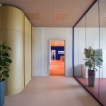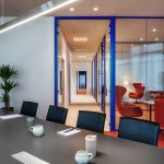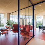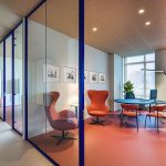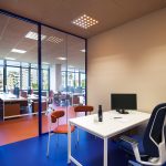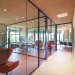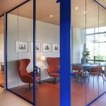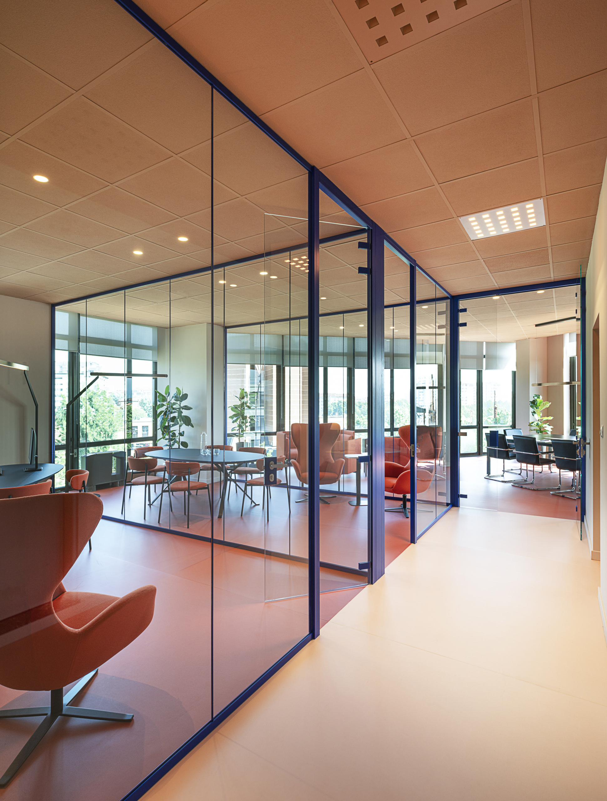 Dal punto di vista distributivo la scelta è stata di creare delle separazioni interne attraverso pareti vetrate ad alto rendimento acustico a profilo personalizzabili nel colore (Wallsystem di Manerba).