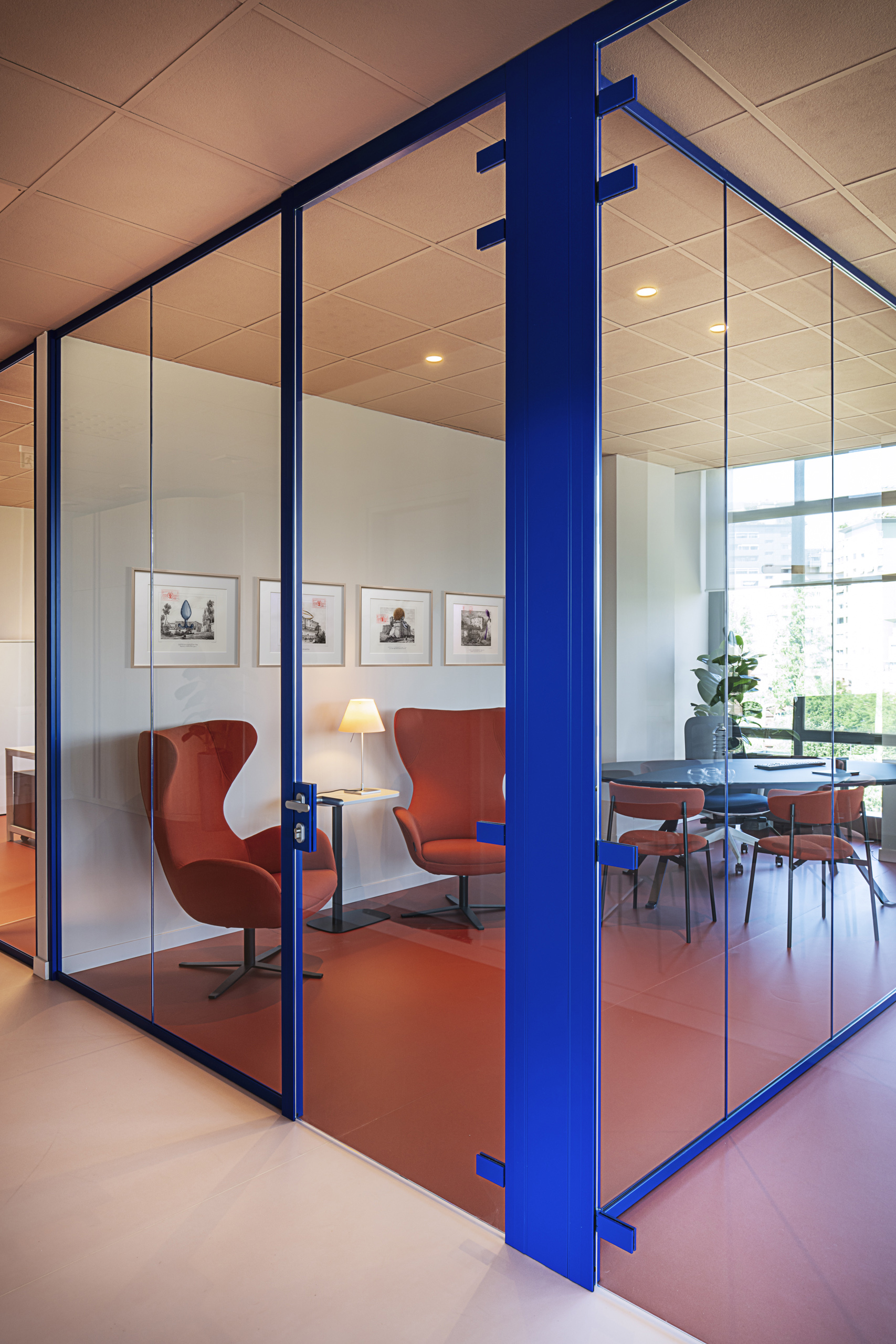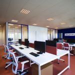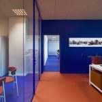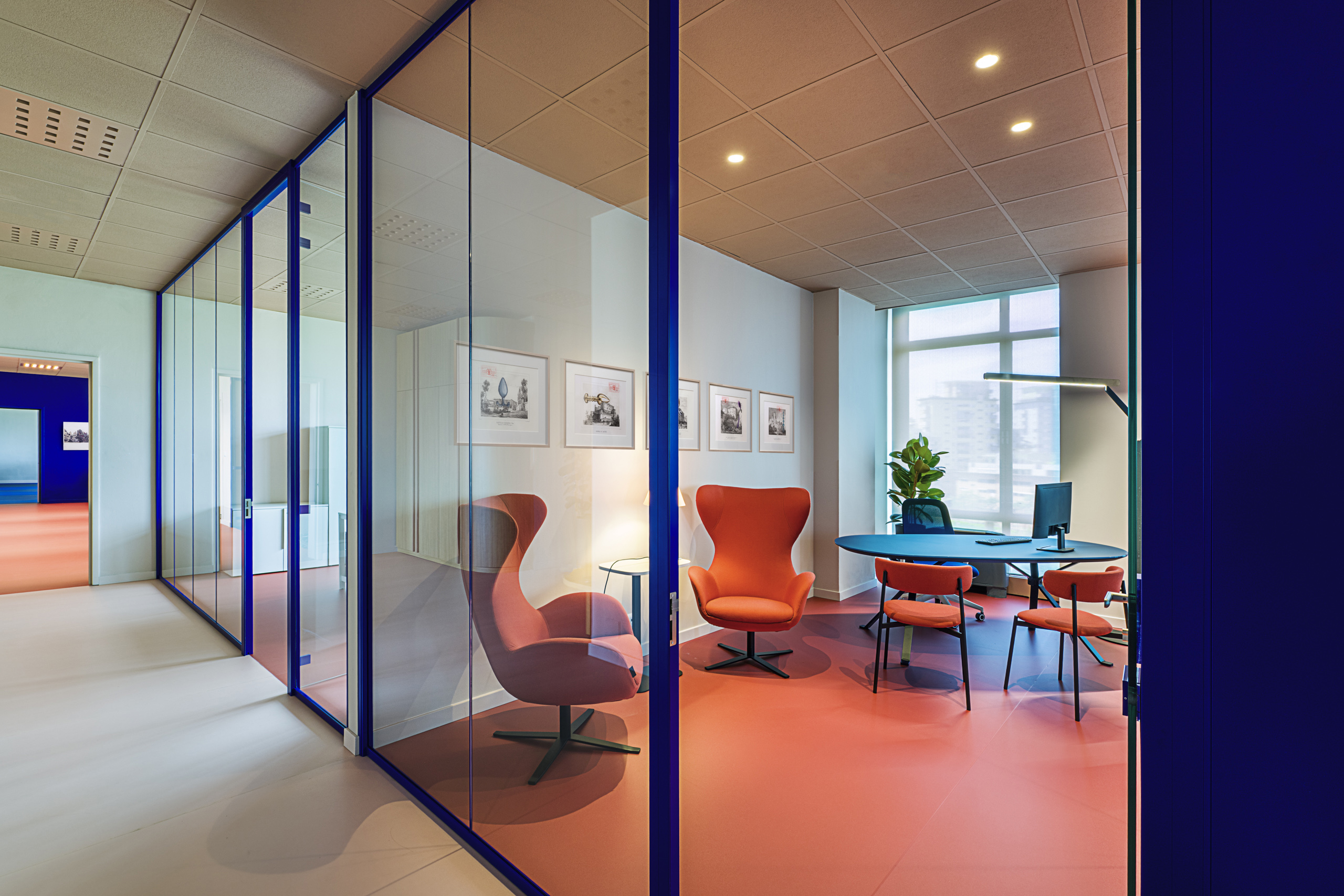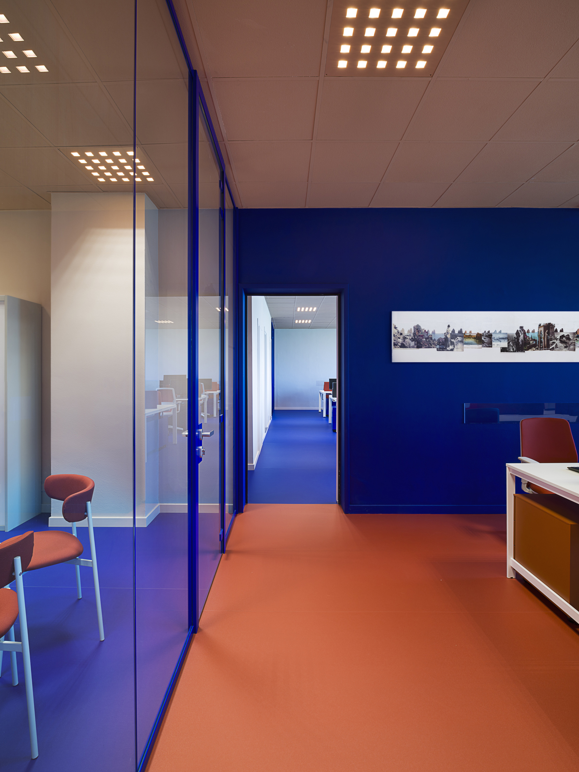 Quasi tutta la distribuzione interna è stata gestita attraverso pareti vetrate a tutt’altezza a profilo sottile, anche in questo caso è stata ricercata la personalizzazione di questi elementi, il telaio infatti è stato prodotto da Manerba spa nel RAL dell’immagine corporate (RAL 5002 Ultramarine blue).