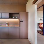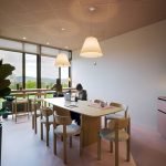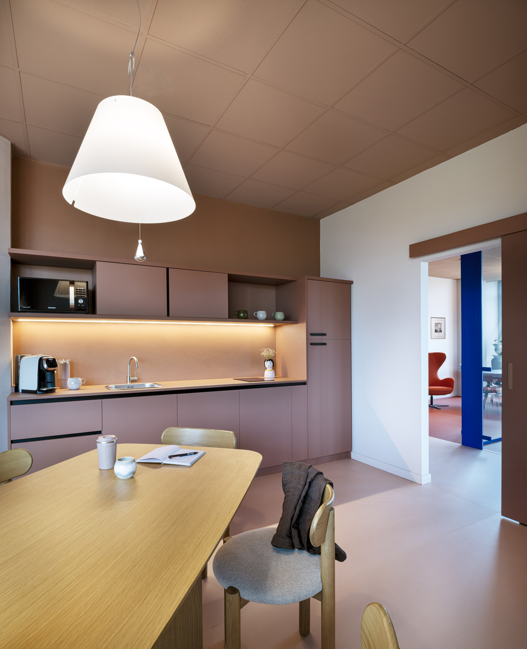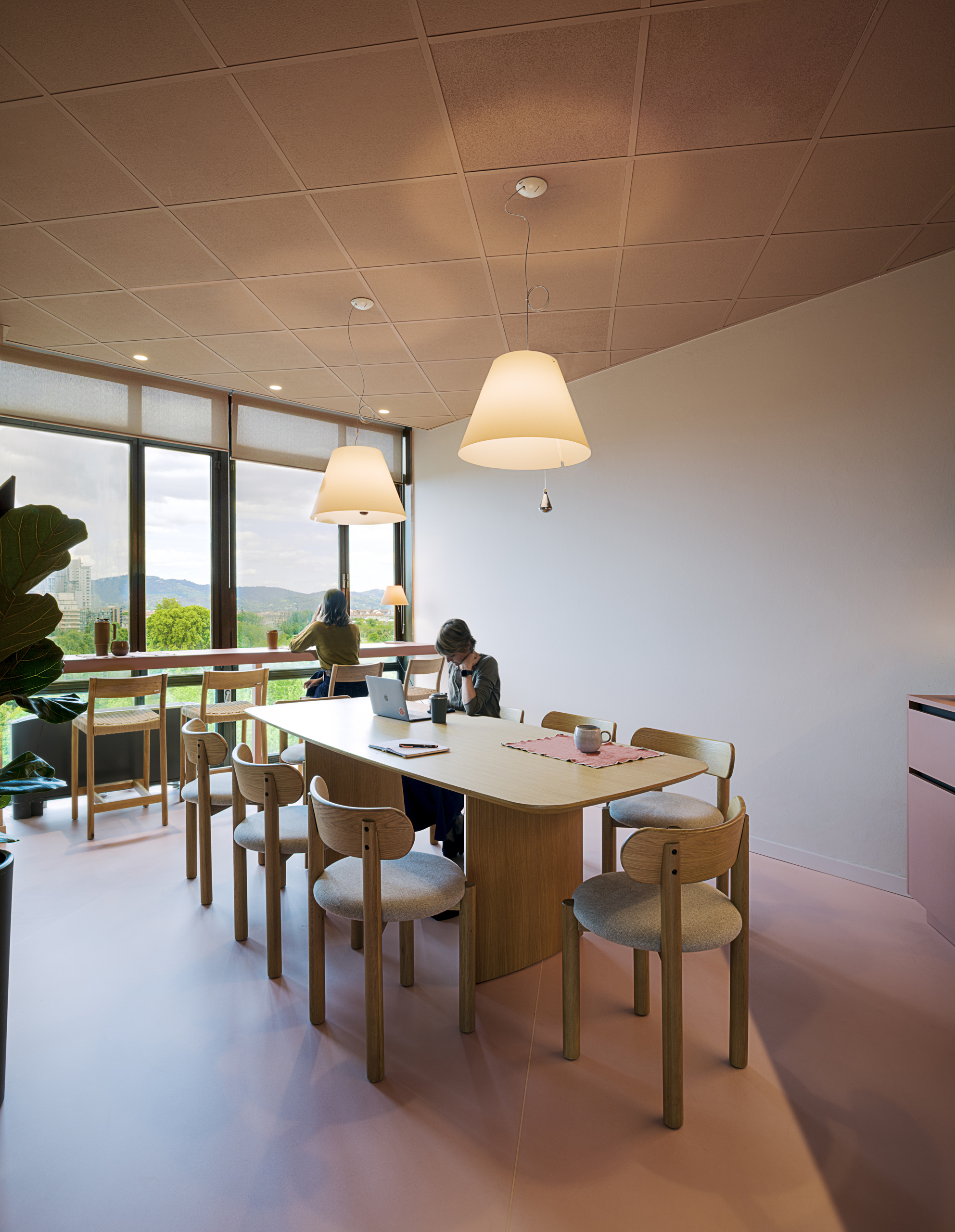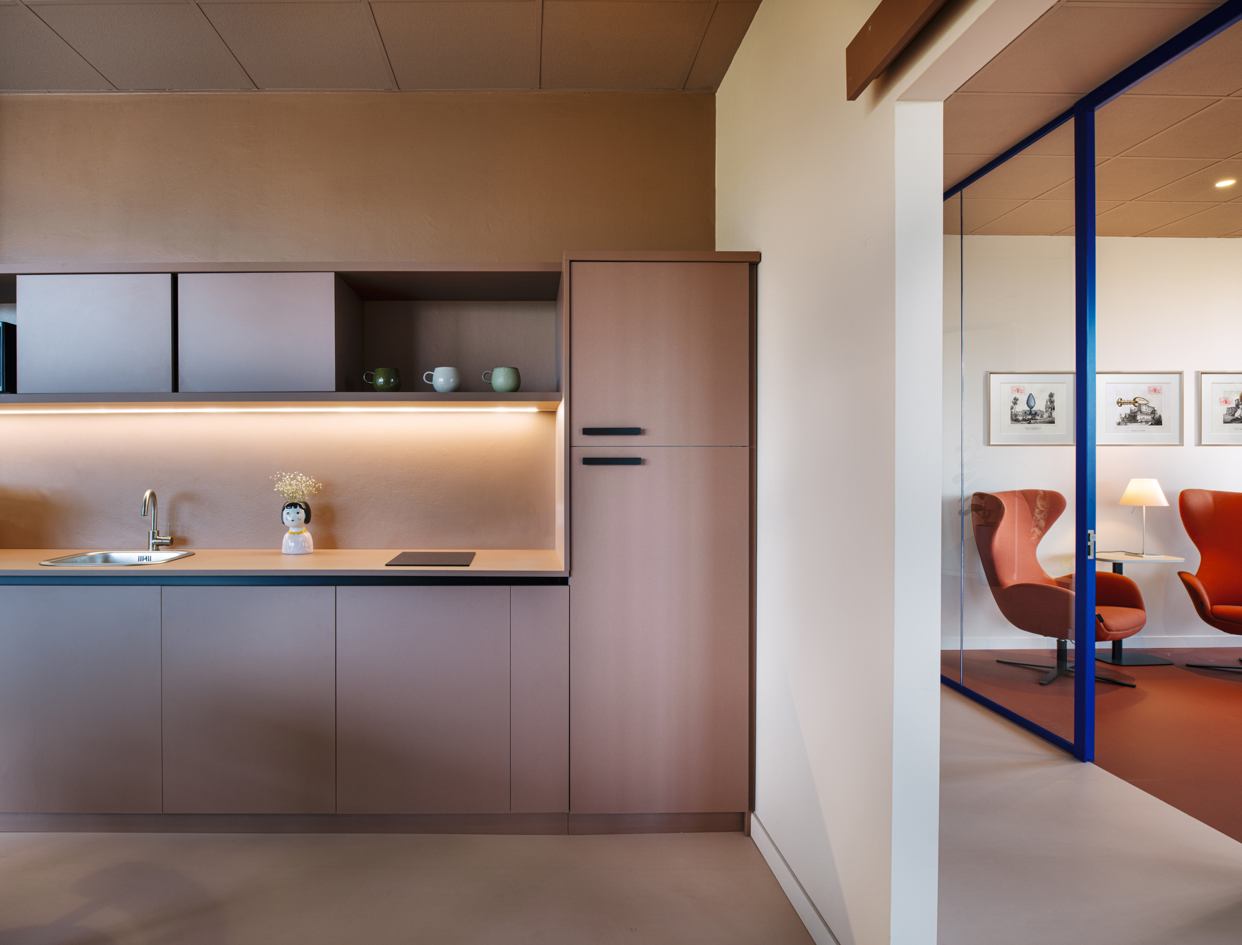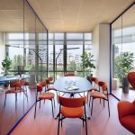Sempre nell’ottica di creare uno spazio confortevole per i propri dipendenti, una stanza è stata adibita a spazio relax/ristoro, volutamente per questo spazio è stato utilizzato un linguaggio più domestico. E’ stata, quindi, allestita una cucina (disegnata su misura e poi realizzata BC Arredamenti) in finitura col. Terracotta. Al centro troviamo un grande tavolo in rovere (Mod. Litto di Kave home) circondato da 8 sedie (mod. Nebai di Kave Home) anch’esse in rovere e seduta in corda. Addossato alla grande parete vetrata che offre una vista aperta sul Parco Dora e sulla collina è stato inserito un grande piano snack in rovere a cui sono affiancati gli sgabelli Yalia (Kave Home) in rovere e corda. Questo spazio diventa polifunzionale nei diversi momenti della giornata, può ospitare piccole riunioni informali, essere utilizzato per il pranzo o una pausa caffè o per una telefonata che ha bisogno di un ambiente silenzioso.