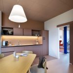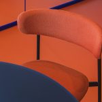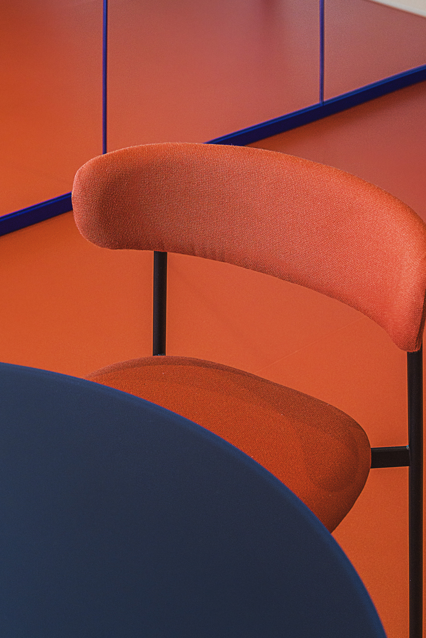 Il tema dei colori ha guidato anche la scelta degli arredi, tutti quelli di serie sono stati forniti da Manerba Spa in alternanza continua dei color terracotta e blu, in contrasto o in accompagnamento ai pavimenti.