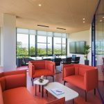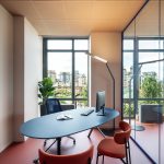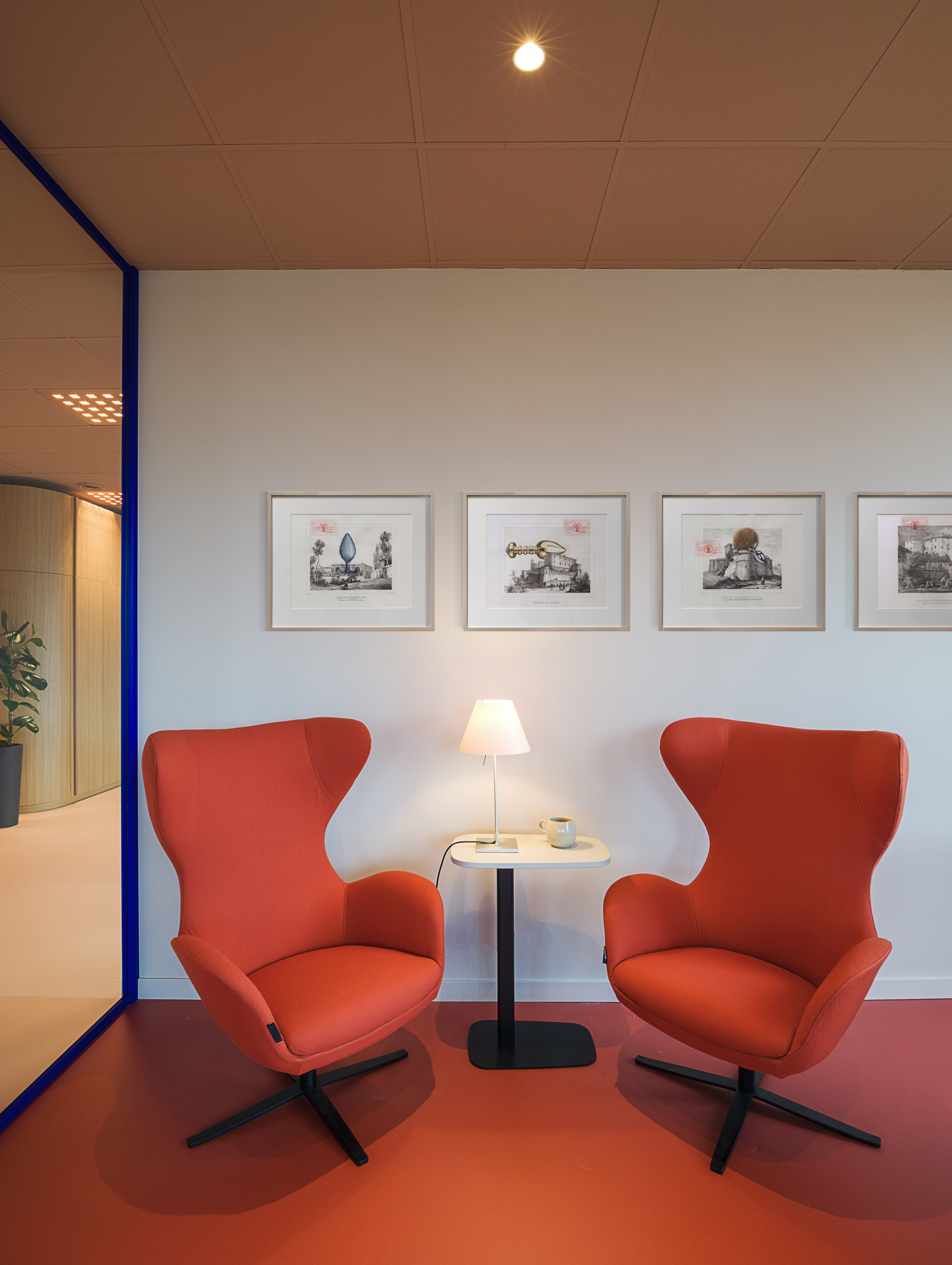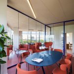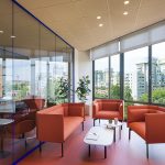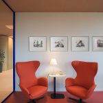 Per ogni ufficio è stata cerata una piccola zona “lounge” composta da due poltrone imbottite modello Musa (tessuto Join 64168 Orange) e un laptop table della serie KOKORO.