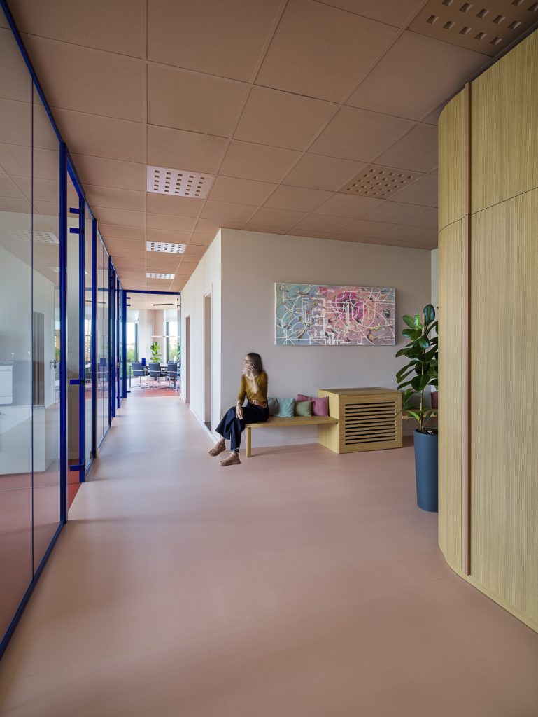 Lo spazio si presentava con pareti e soffitto bianco e una pavimentazione in mattonelle di marmo di carrara caratterizzato dalla tipica vena grigia. Per il pavimento, con lo scopo di preservare il quello originale, la scelta è stata di posare un pavimento vinilico acustico autoposante a rotoli (Sarlon Modul’up di Forbo). Sono state individuate 3 grandi aree in cui declinare 3 colori diversi, l’open space dedicato al call-center è caratterizzato da una pavimentazione blu scuro (Darl Blue Uni 877), per gli uffici amministrativi e le sale riunioni è stato scelto il color terracotta (Copper Stardust 4804), infine per gli spazi di connessione è stato usato un rosa tenue (Soft Peach Stardust 4806).
