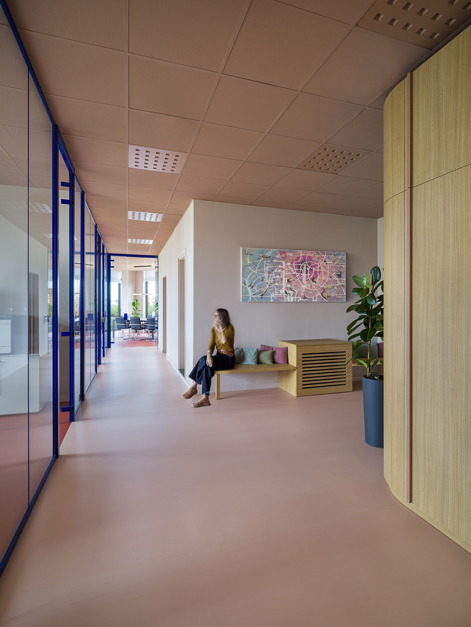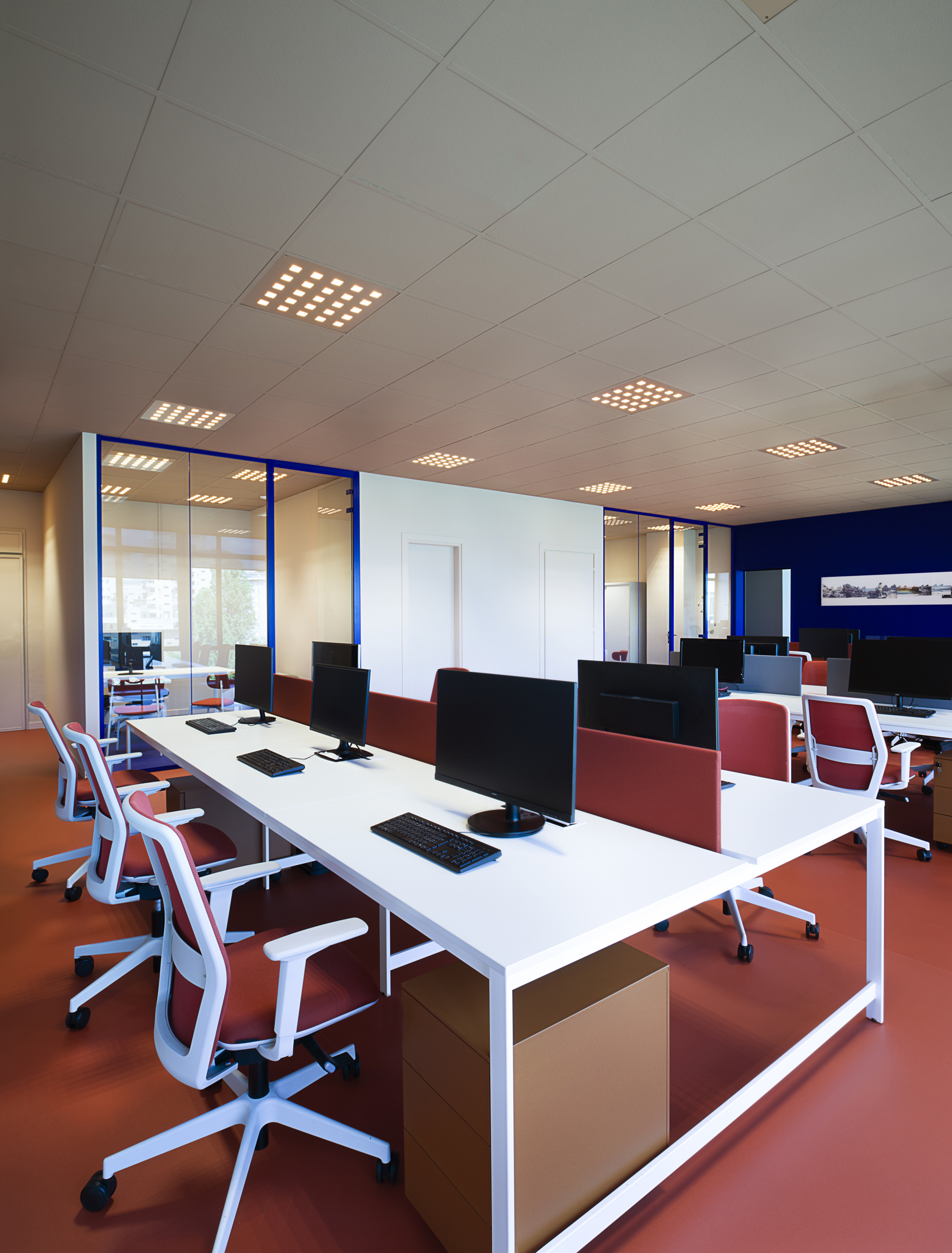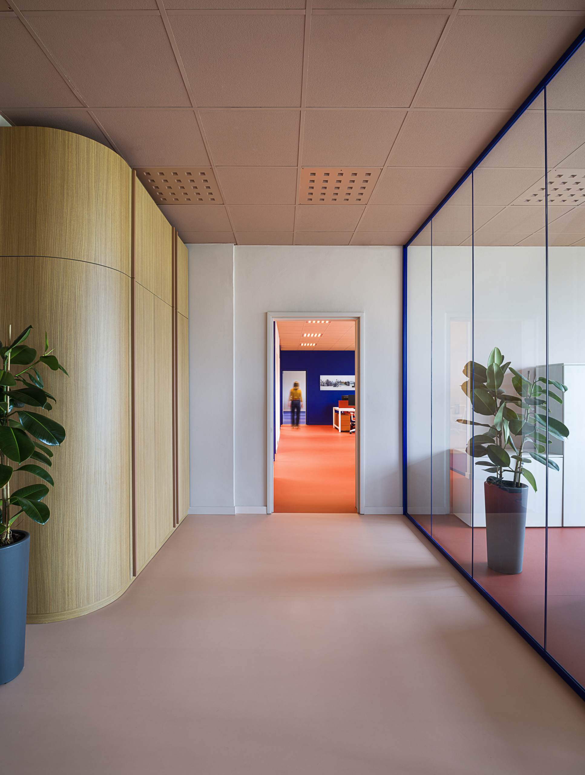 Il progetto del colore ha poi coinvolto il trattamento delle pareti e del soffitto. Per le pareti la scelta è stata di utilizzare un’unica tinta su tutti gli spazi che richiamasse i toni dei rosa e terracotta (codice D8.06.74 della mazzetta Sikkens 5051), unica eccezione è la parete che separa l’area amministrativa dall’area call center per segnare ulteriormente anche il cambio di pavimentazione per cui è stato usato il BLU dell’immagine corporate dell’azienda (RAL 5002 Ultramarine blue).