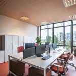 Nell’area amministrativa sono state inserite le scrivanie della serie K-word in bianco, affiancate dalle cassettiere slim Unibox col. Corten sablè. Nelle sale riunioni sono state inserite le sedie Easy Chair con schienale imbottito rosso mattone.