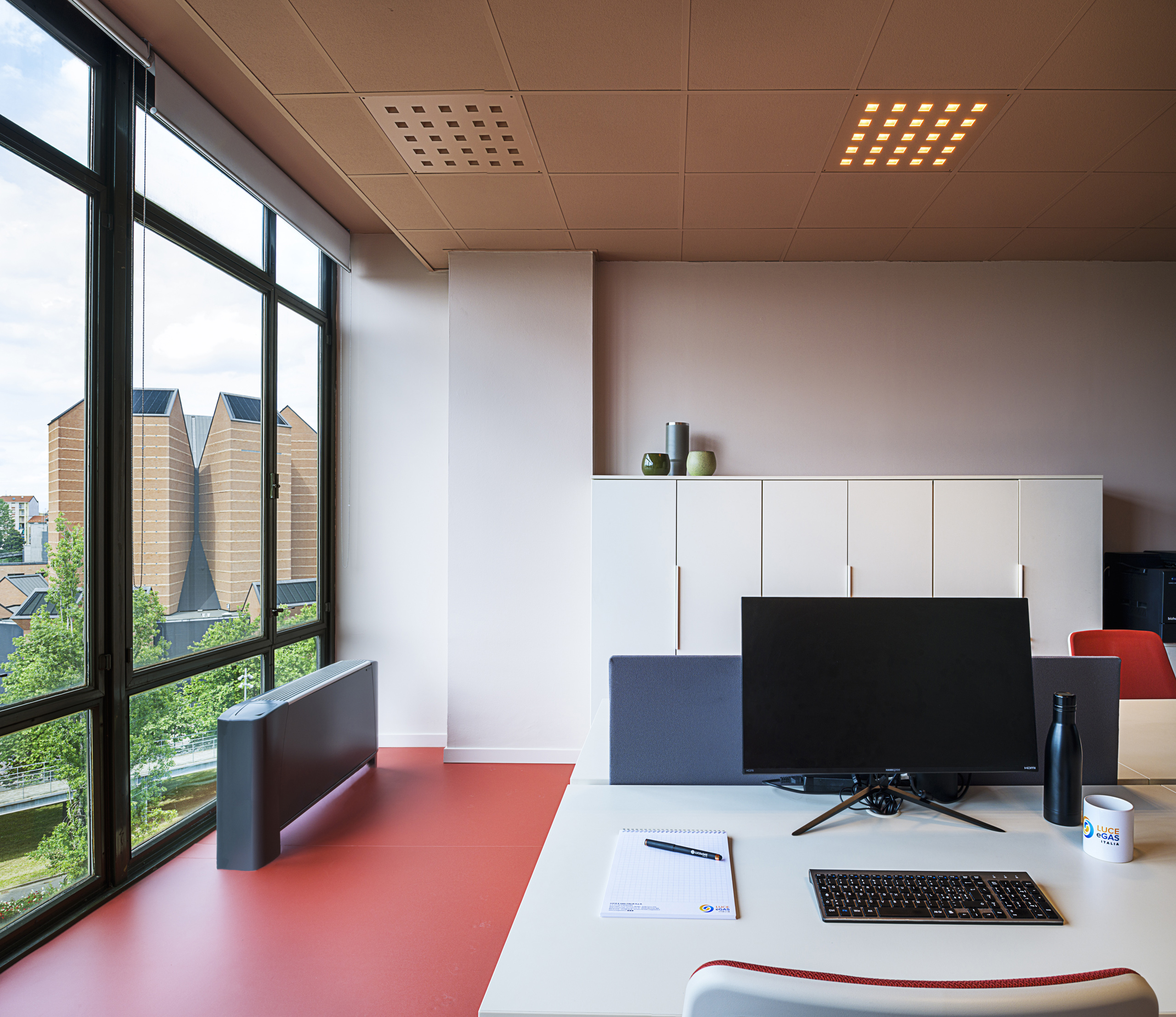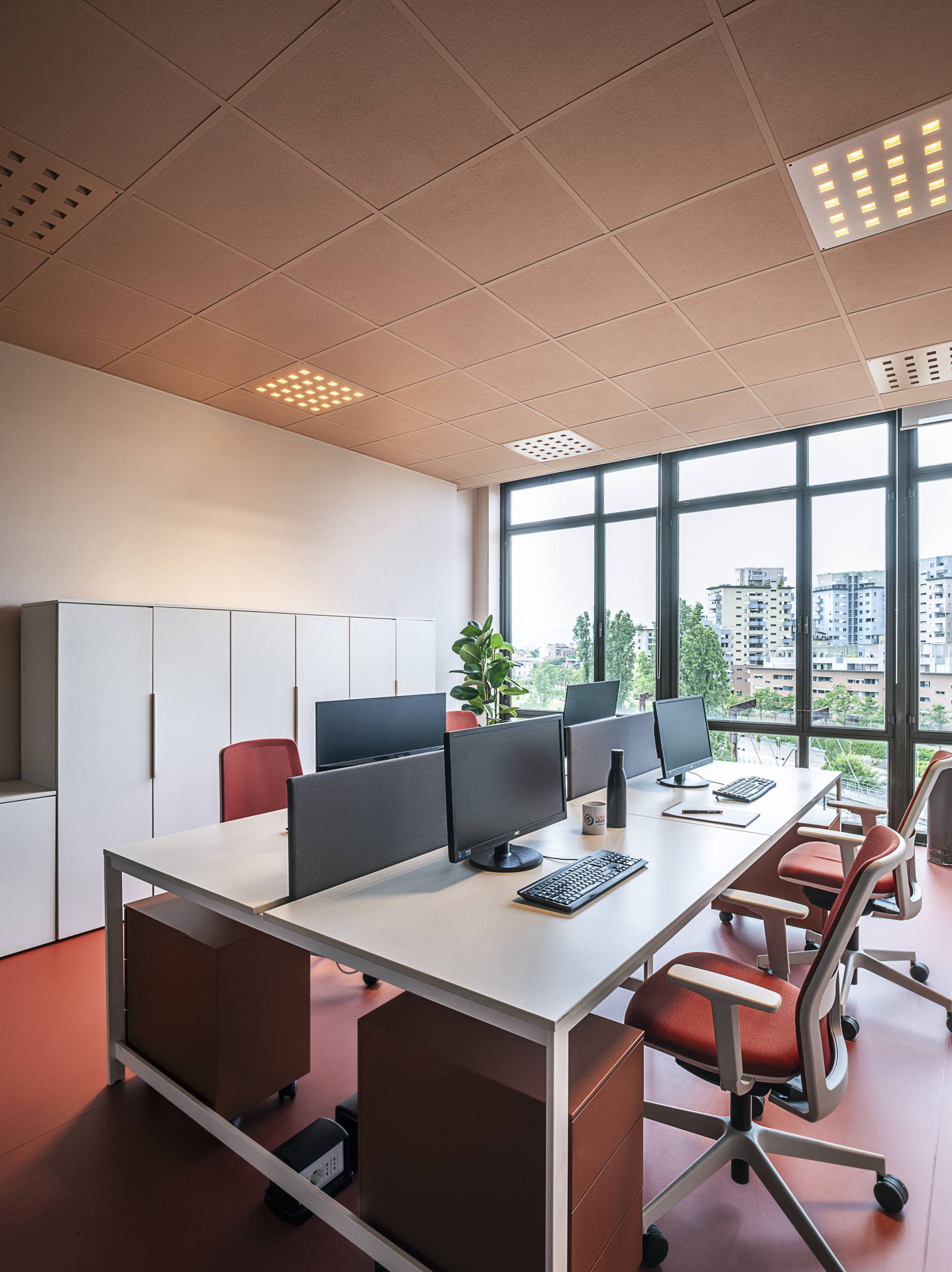 Per la parte operativa call center sono state scelte scrivanie affacciate bianche (serie You Eco) sulle quali sono stati montati gli screen fonoassorbenti rivestiti in tessuto color mattone (tessuto Xtreme cod. 572 rosso mattone), per le poltrone operative sono state scelte le LIA, con schienale in rete old orange (cod. 63067 Rythm) e la seduta rosso mattone come gli screen (Xtreme 572 rosso mattone). Con lo stesso RAl dei profili delle vetrate sono state realizzate su misura le cassettiere slim Unibox.