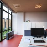Per creare un effetto scatola e amplificare il comfort degli spazi si interviene sul controsoffitto a quadrotti attraverso il colore e la sostituzione dei panel led. Per il soffitto è stato utilizzata una tinta in nuance con le pareti ma di un tono più scuro (D2.15.55 Sikkens 5051) e con lo stesso codice sono stati personalizzati dall’azienda produttrice i panel led con fonte luminosa arretrata (DIMPLES a microcelle).