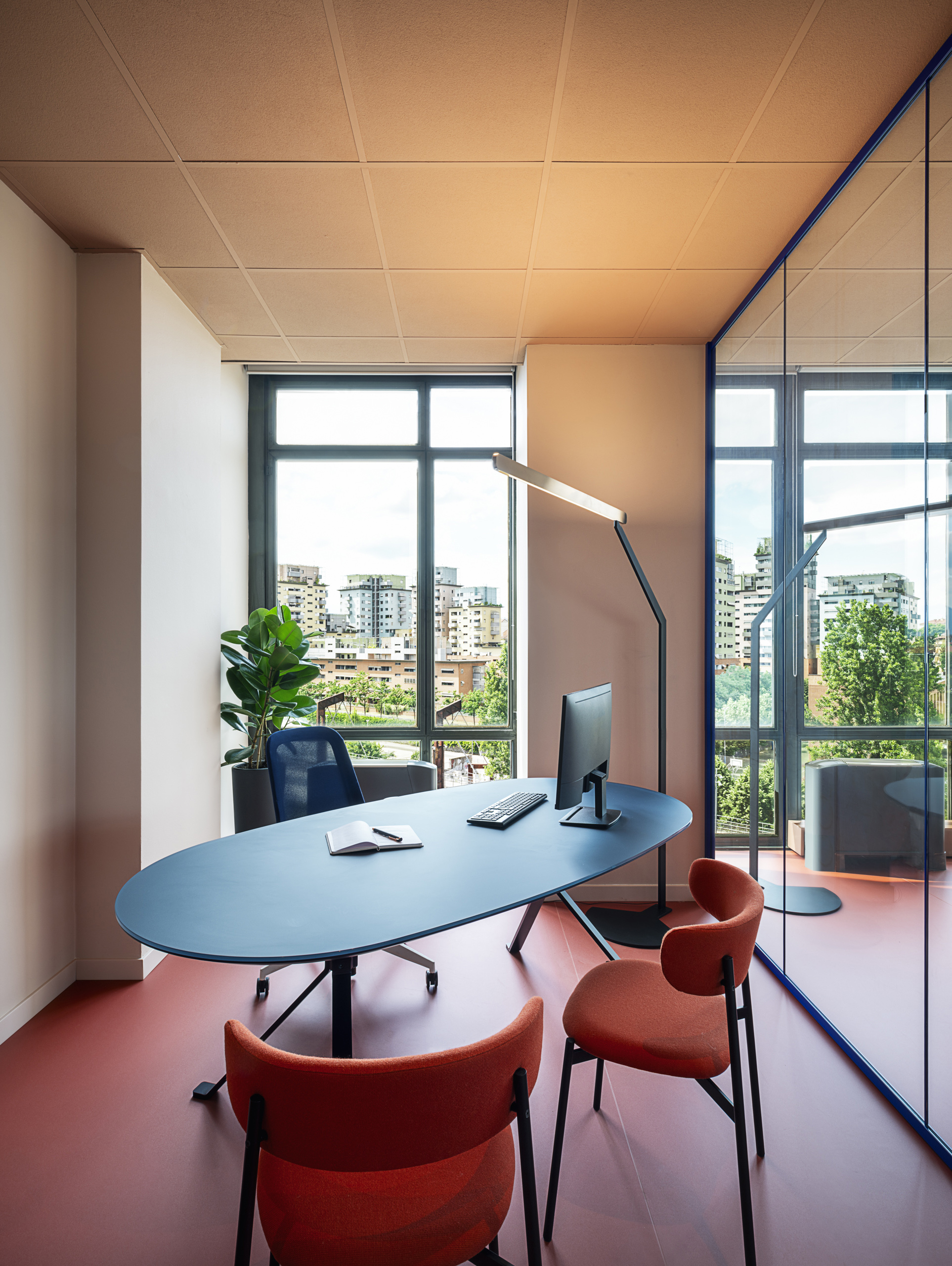 Per l’area dirigenti sono stati allestiti due uffici, di cui uno destinato all’uso flessibile sala riunione, in cui sono stati scelti arredi della linea Revo, i tavoli sono caratterizzati dal piano in vetro satinato Midnight blu e struttura verniciata Deep Blu. Per la sedia la scelta è ricaduta su un modello storico di Manerba, la Yuma, anch’essa declinata nei toni del blu.