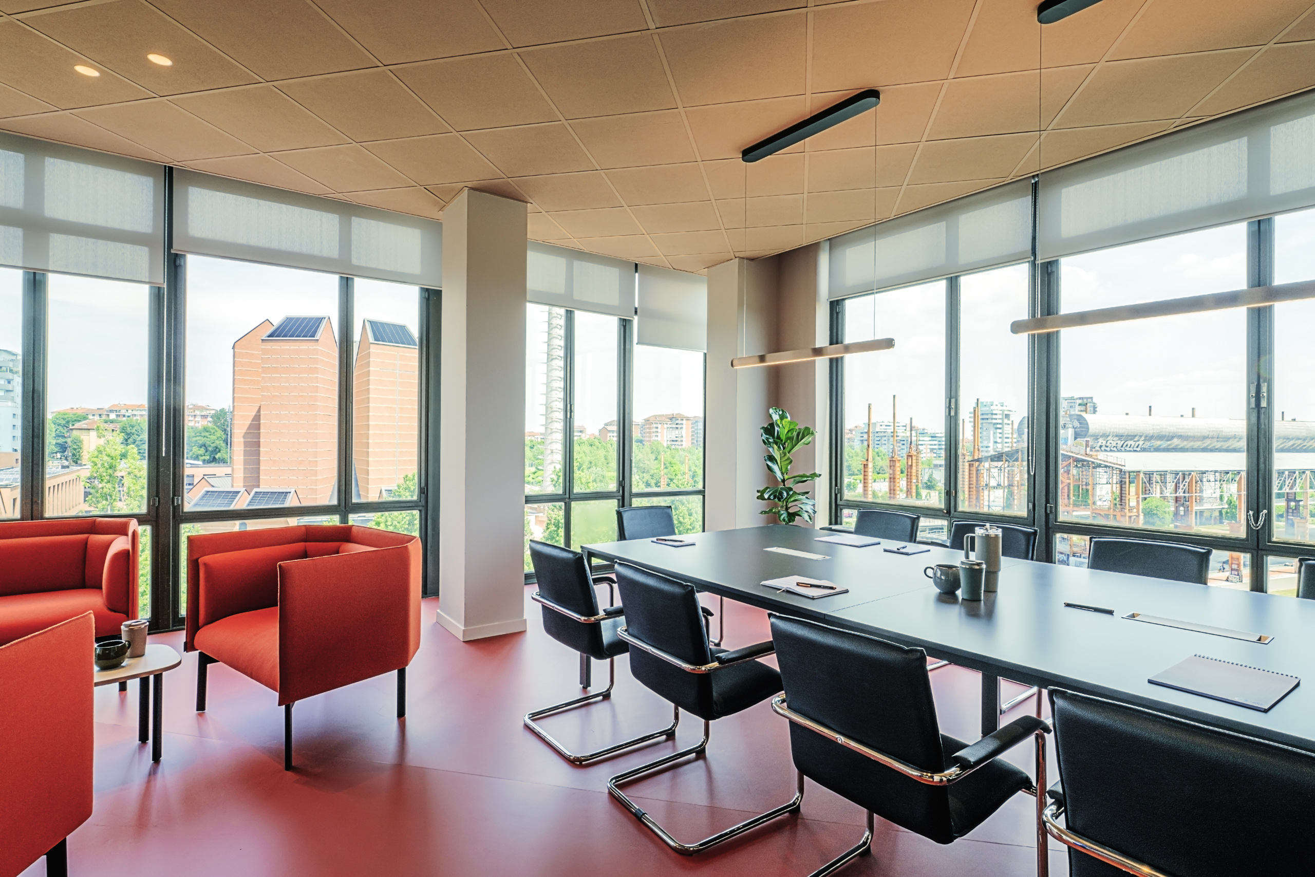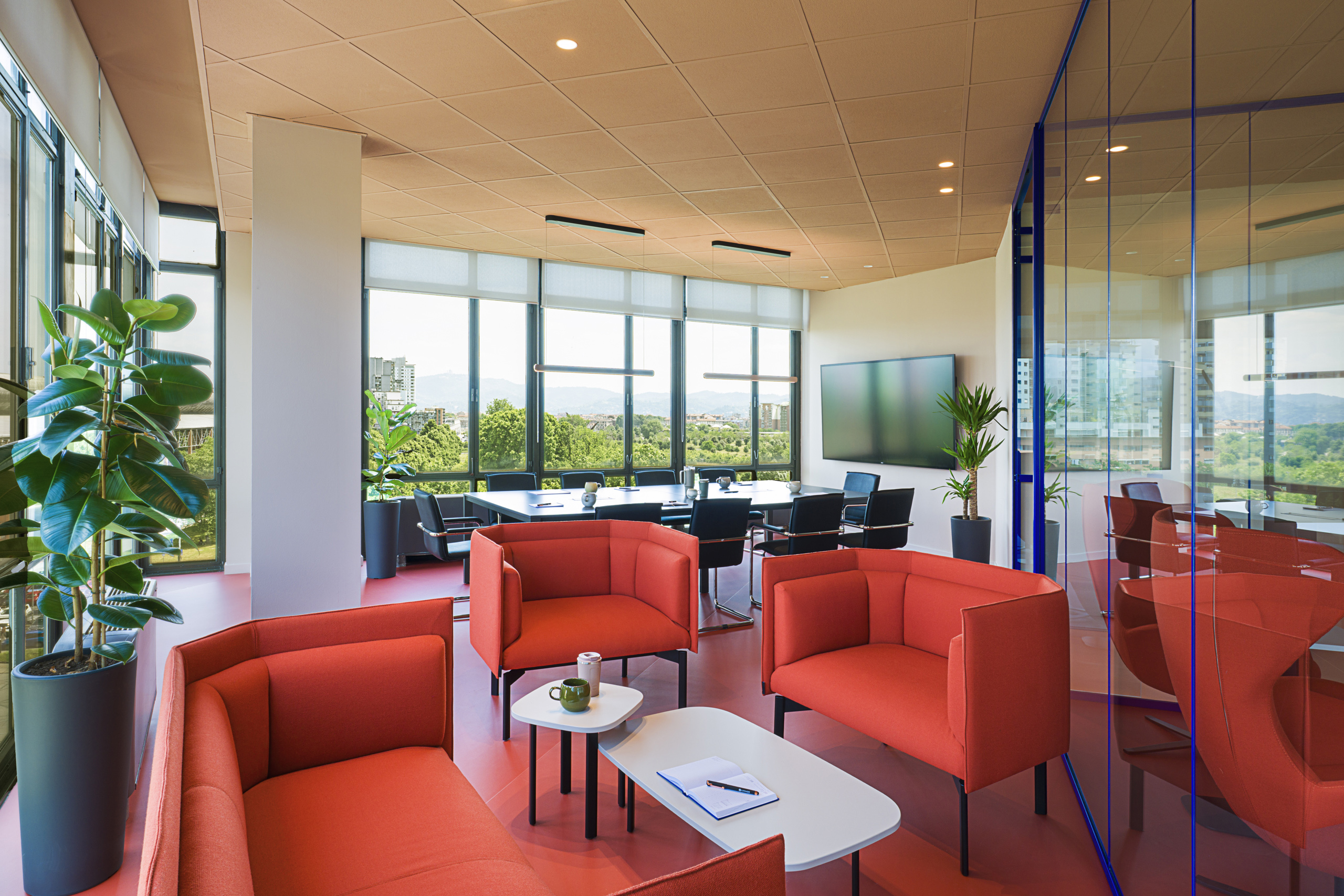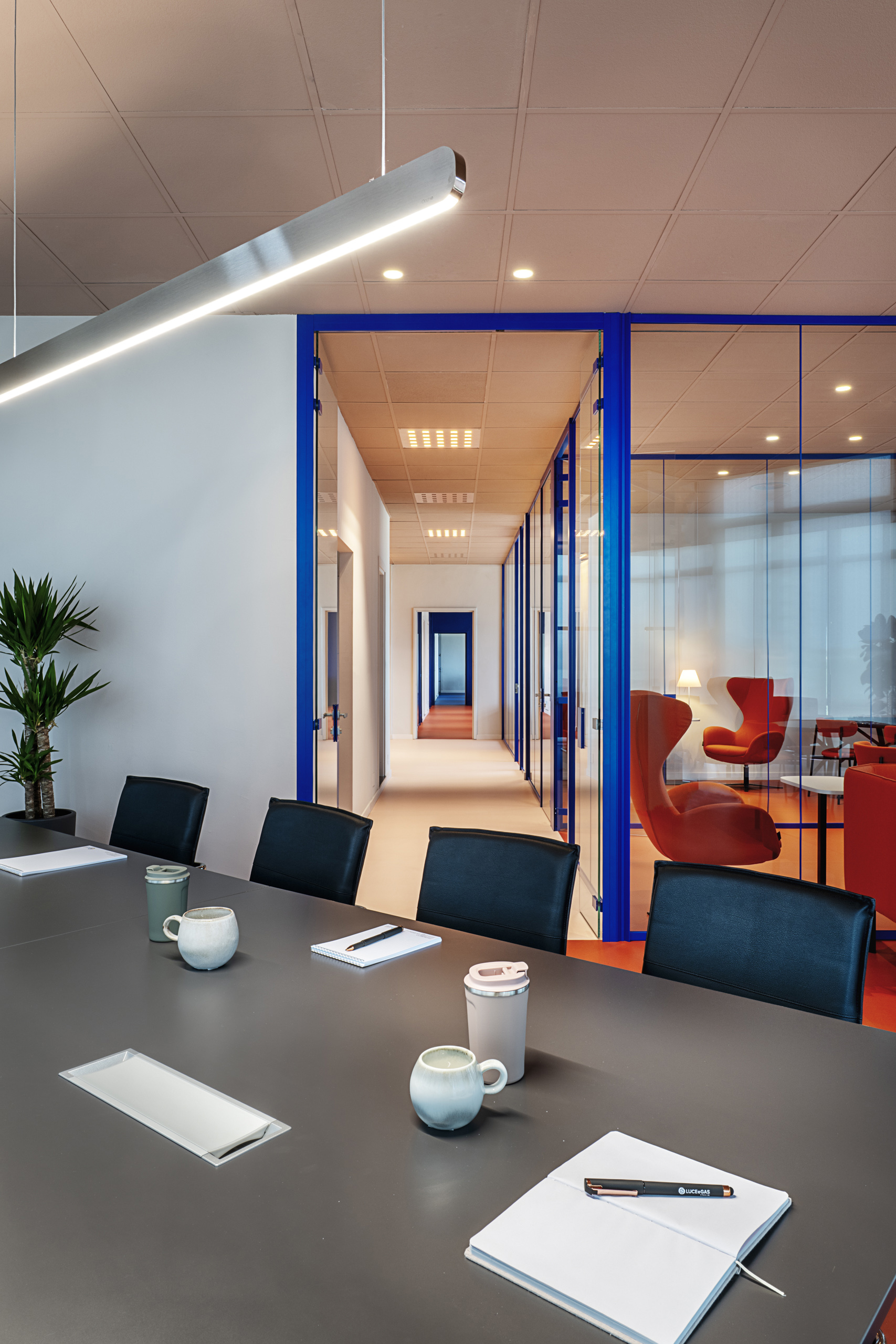 La grande sala riunioni ospita un grande tavolo da 14 posti con relative poltrone, questi arredi sempre forniti da Manerba, sono gli unici arredi di cui Luce e Gas era in possesso e ha voluto riutilizzare. Anche a completamento della sala riunioni è stato inserito un angolo “lounge” composto da un divano, due poltrone e due tavolini della serie KOKORO nei colori Orange e Cashmere.