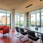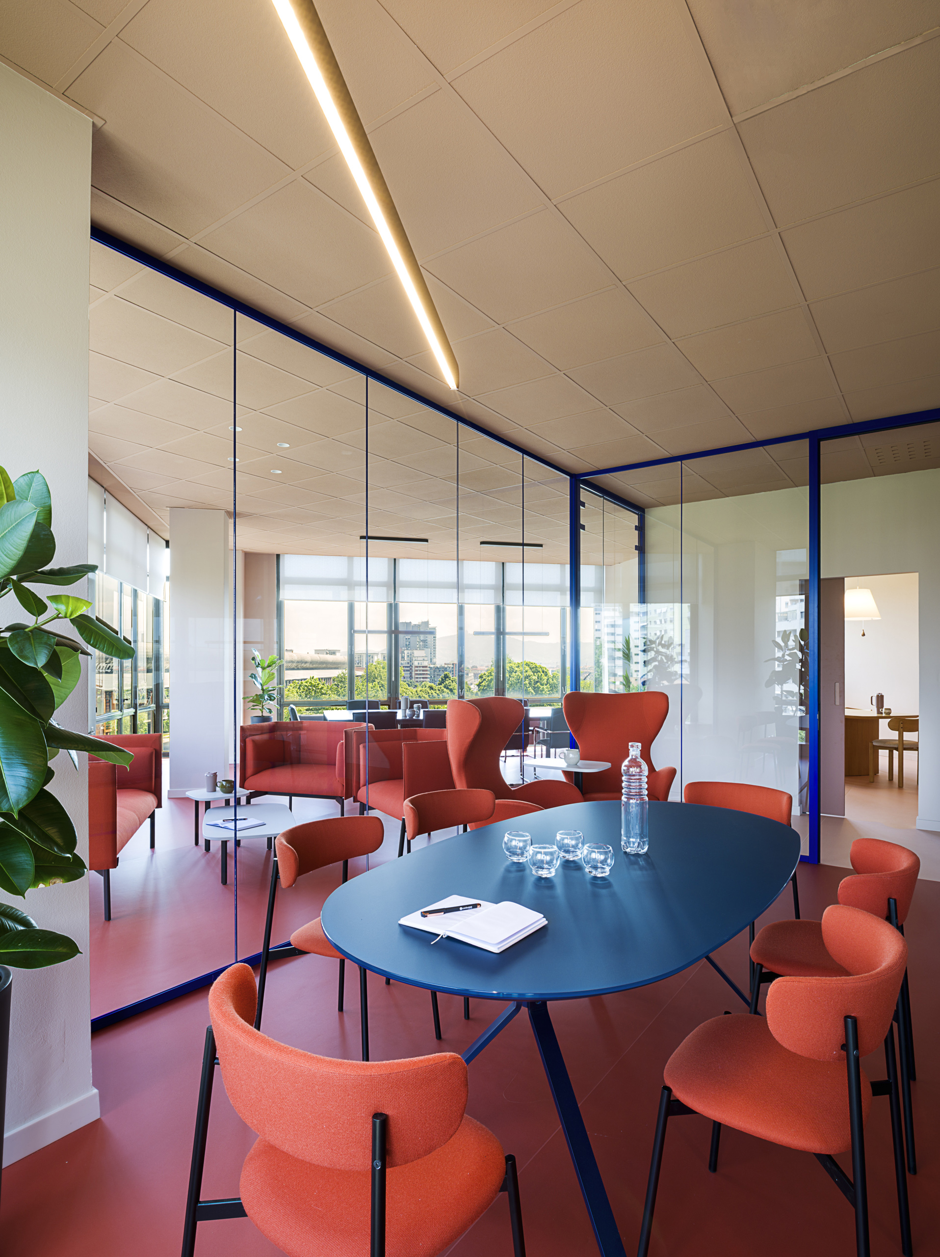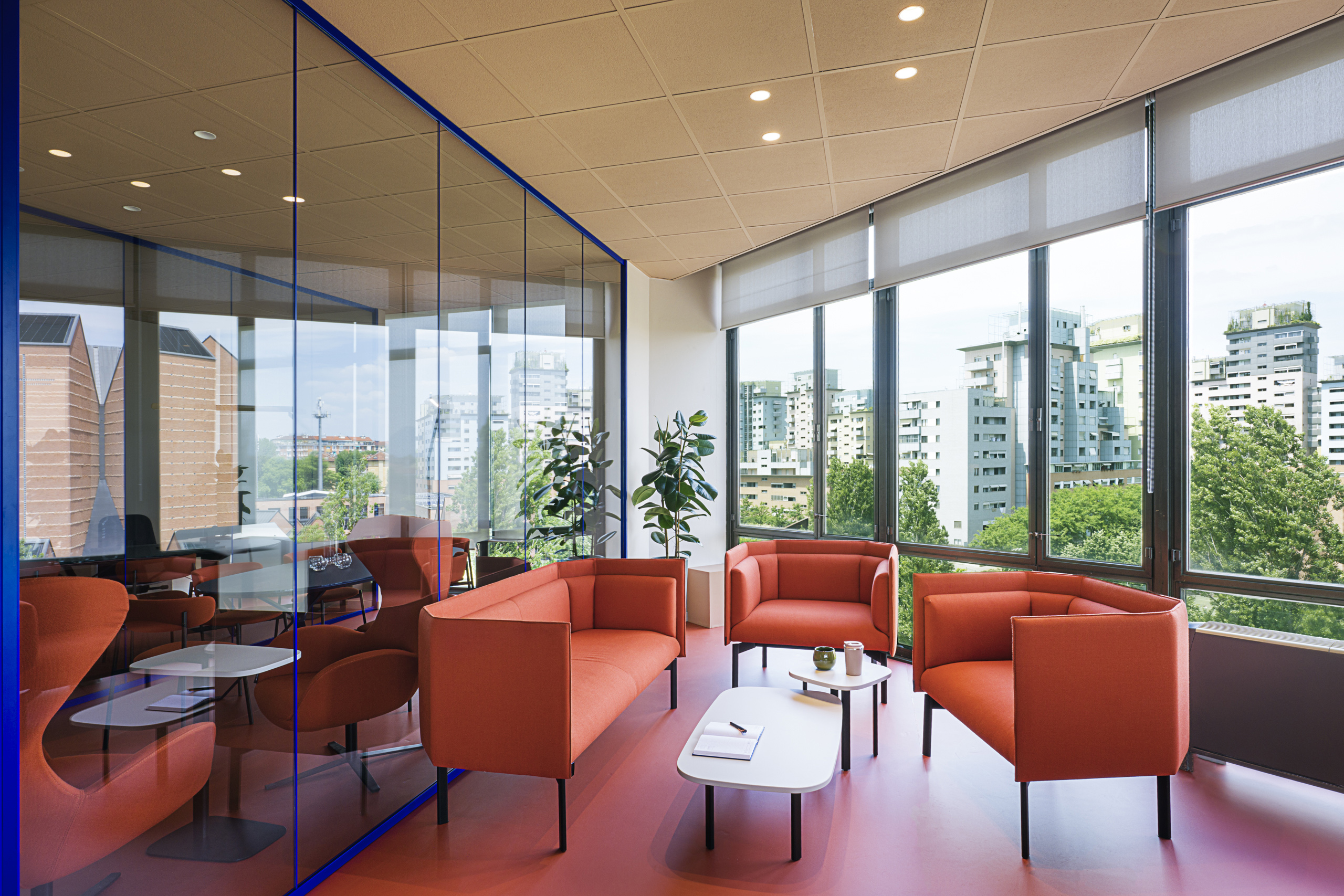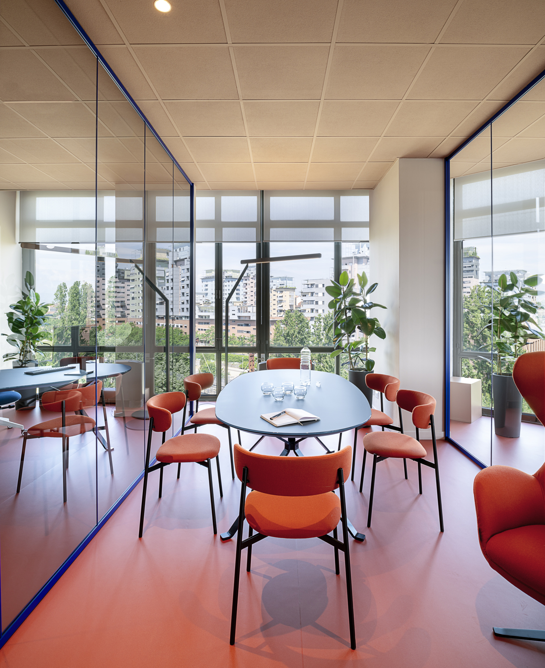 La grande sala riunioni ospita un grande tavolo da 14 posti con relative poltrone, questi arredi sempre forniti da Manerba, sono gli unici arredi di cui Luce e Gas era in possesso e ha voluto riutilizzare. Anche a completamento della sala riunioni è stato inserito un angolo “lounge” composto da un divano, due poltrone e due tavolini della serie KOKORO nei colori Orange e Cashmere.