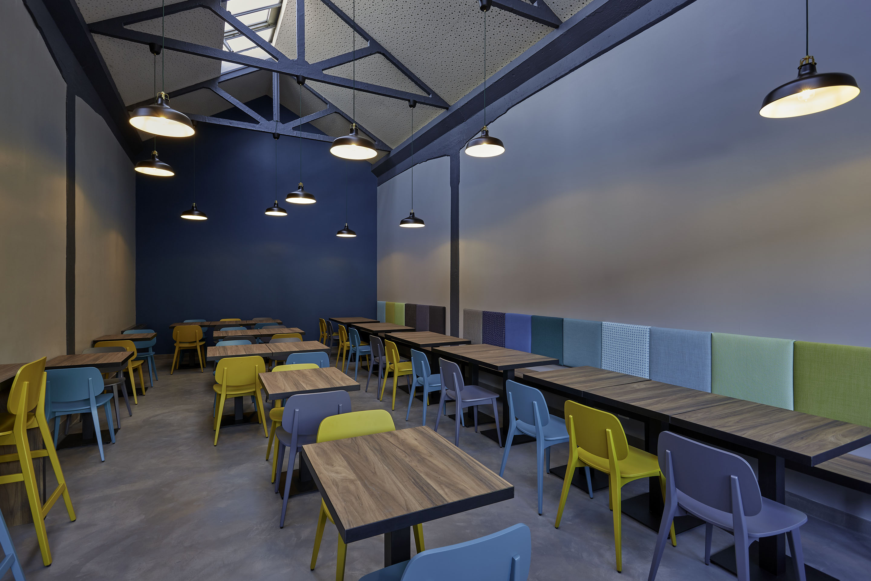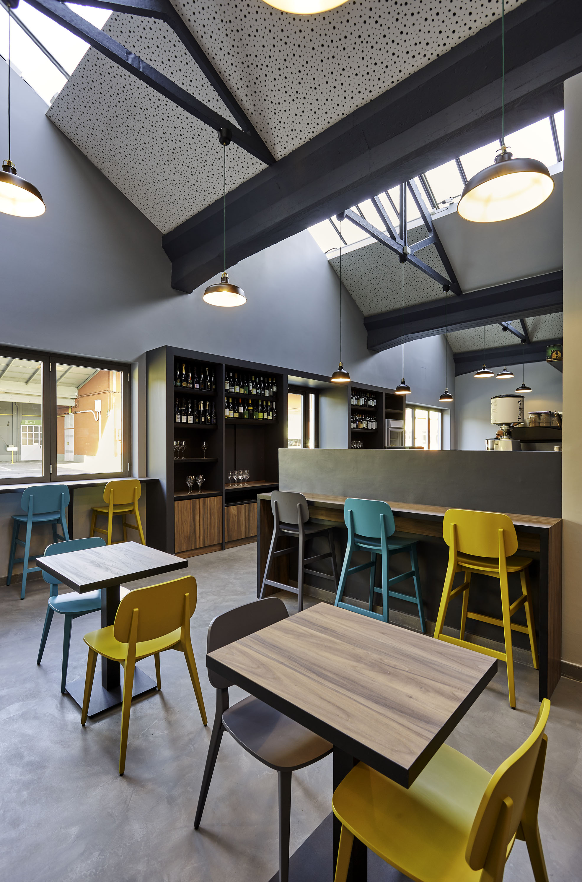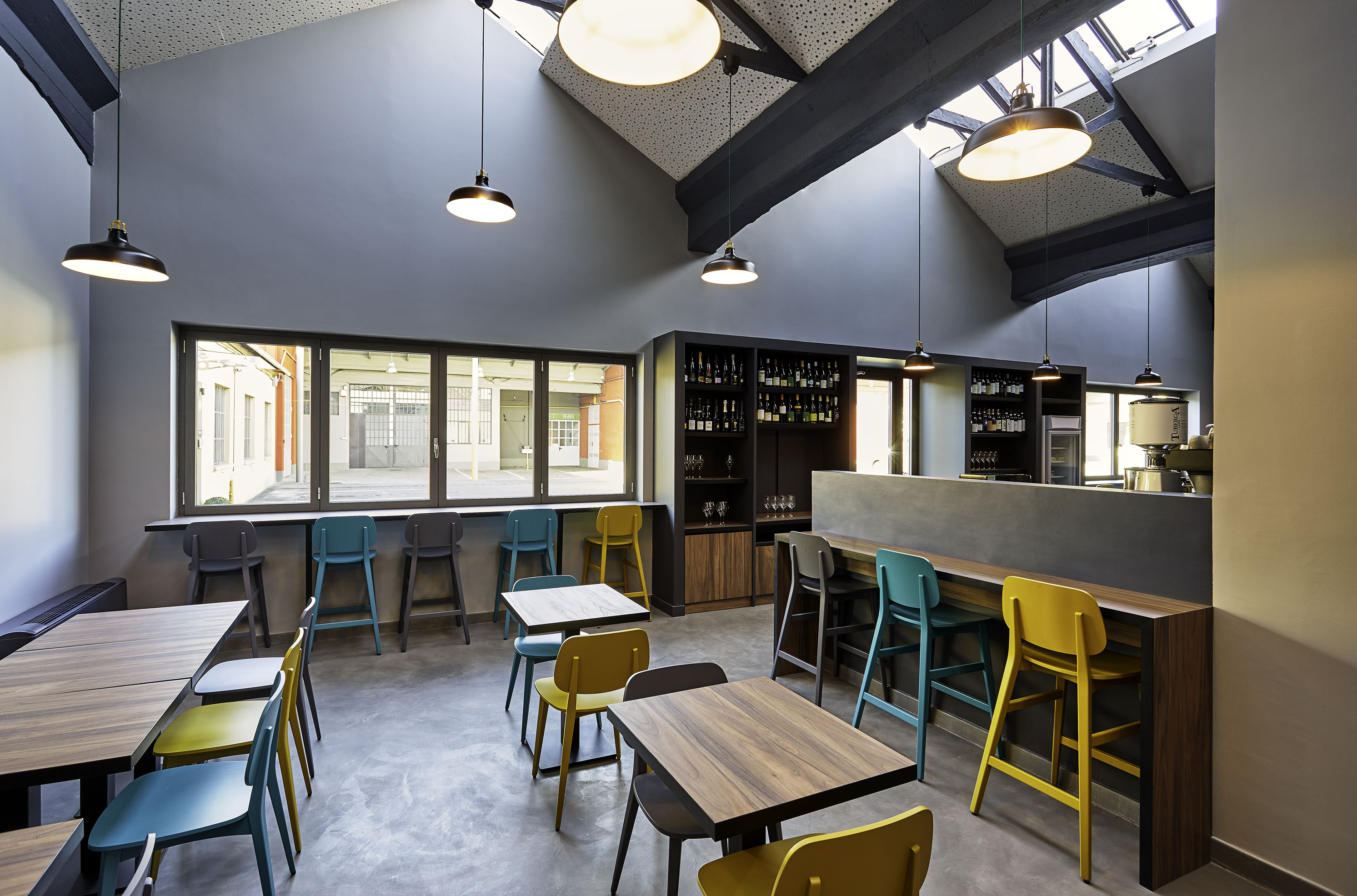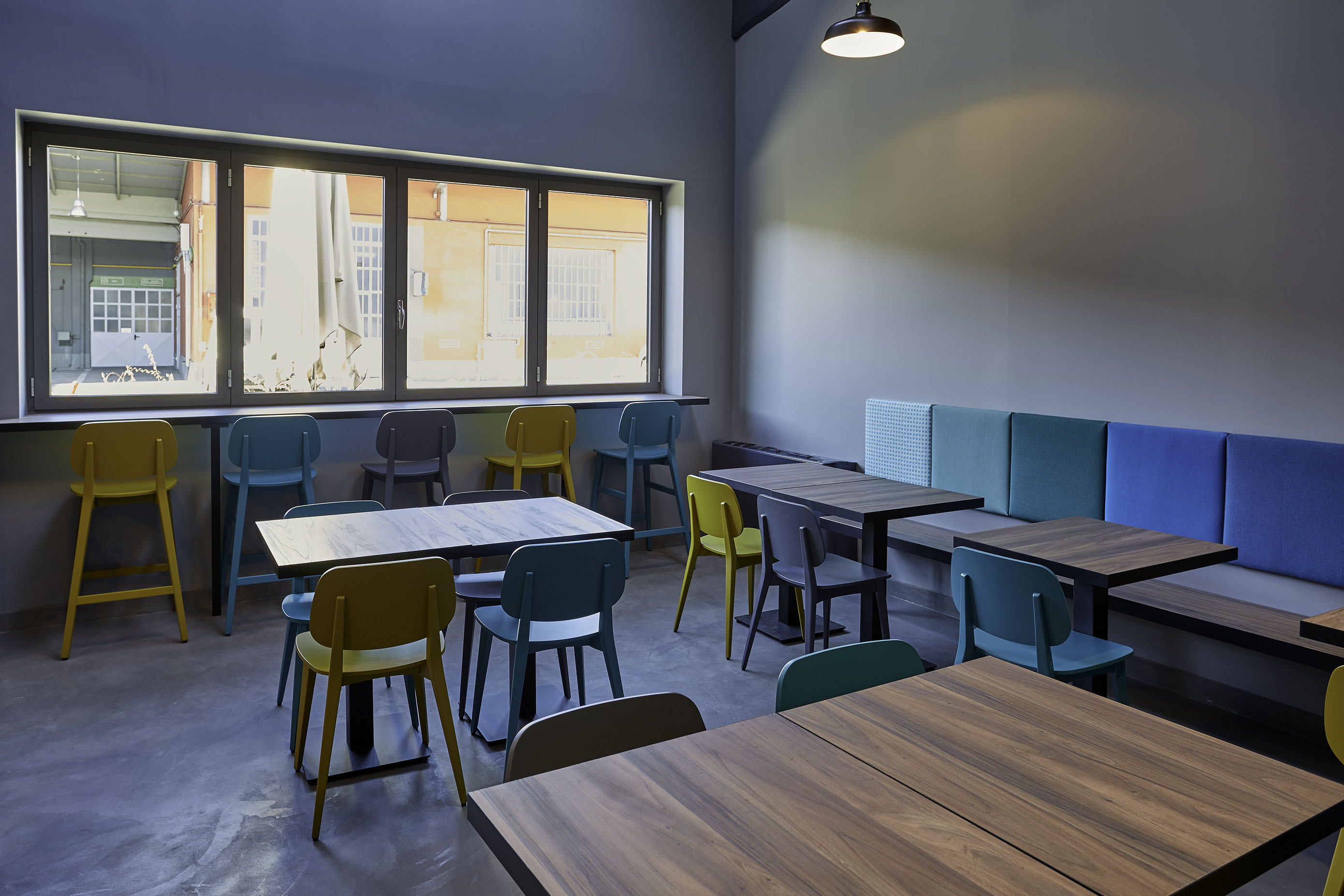 Il pavimento in cemento, il bancone in ferro grezzo, il legno di tavoli e le sedute rimandano al mondo dei materiali industriali. La gamma cromatica dei verdi-blu mettono in evidenza le capriate del tetto, i pilastri in cemento e i fondali murari. Le sedie e gli sgabelli in 3 varianti cromatiche; gli schienali imbottiti delle sedute lineari sono rivestite con una selezione di tessuti creati da Maria Flora per in ed outdoor.